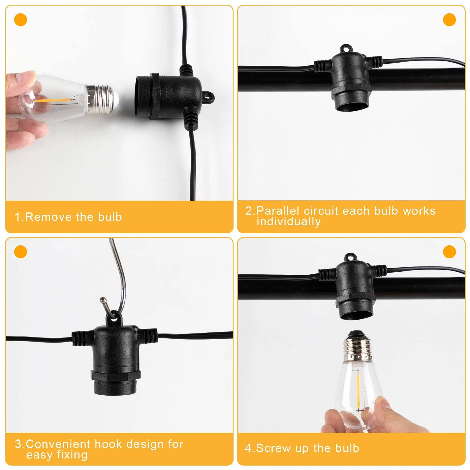 Luci esterne collegabili da fine all’estremità: luci da esterno a led con presa S14 E27 da 48 piedi con cavo da 2 piedi con spina maschio, coda da 2 piedi con connettore femmina.luci da caffè Luci da esterno S14 a led possono collegare 32 fili (480 watt max), luci da esterno a led per esterni con un fusibile di ricambio integrato per una facile sostituzione.Ideale per feste in giardino, matrimoni, caffè.
