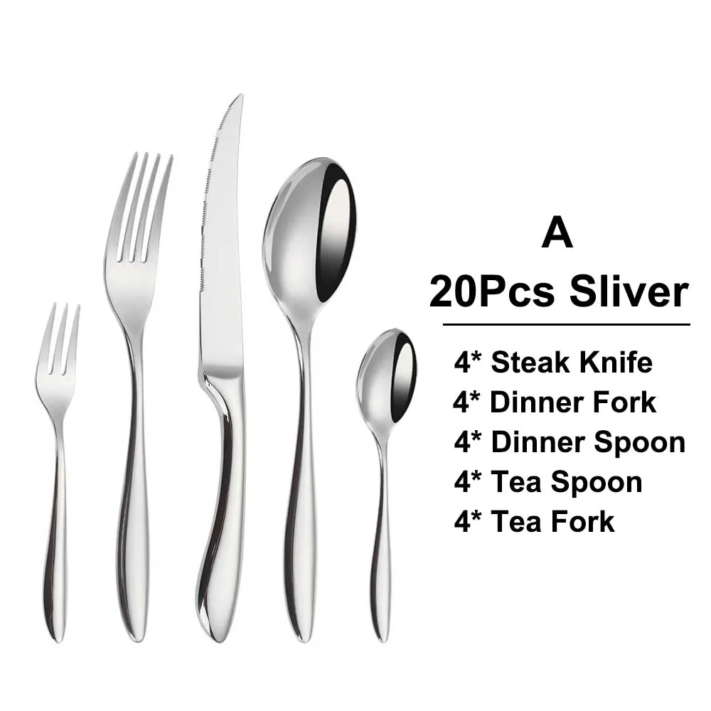 5 pezzi-A: coltello da bistecca/forchetta da pranzo/cucchiaio da pranzo/cucchiaio da tè/forchetta da tè
