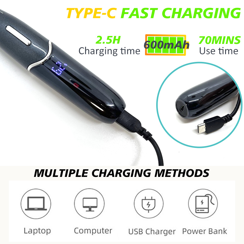 4.Indicatore batteria da incasso, mantenimento dell’estramento della situazione di potenza;l’indicatore di ricarica illuminerà durante la ricarica;con blocco a induzione, pressa lunga 3 secondi per bloccare la macchina, pressa lunga 3 secondi per avviare la macchina, previene problemi causati dall’avviso stivale.