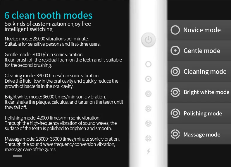 Modalità di pulizia profonda, Modalità di rimozione della placca, Sbiancamento modalità, Modalità di "pulizia delicata", Modalità di massaggio, timer