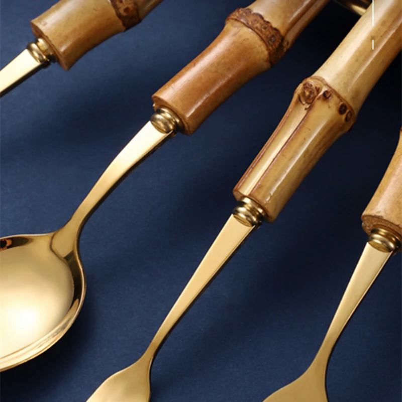 7Pcs Nature Bamboo Gold Set di posate in acciaio inossidabile creatività regalo posate in argento 304 coltello forchetta per insalata cucchiaio Drop Shipping