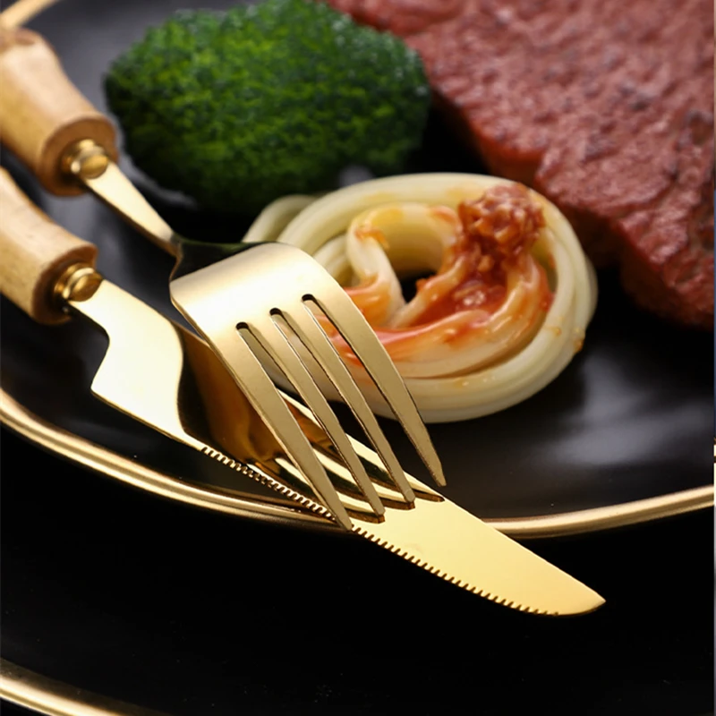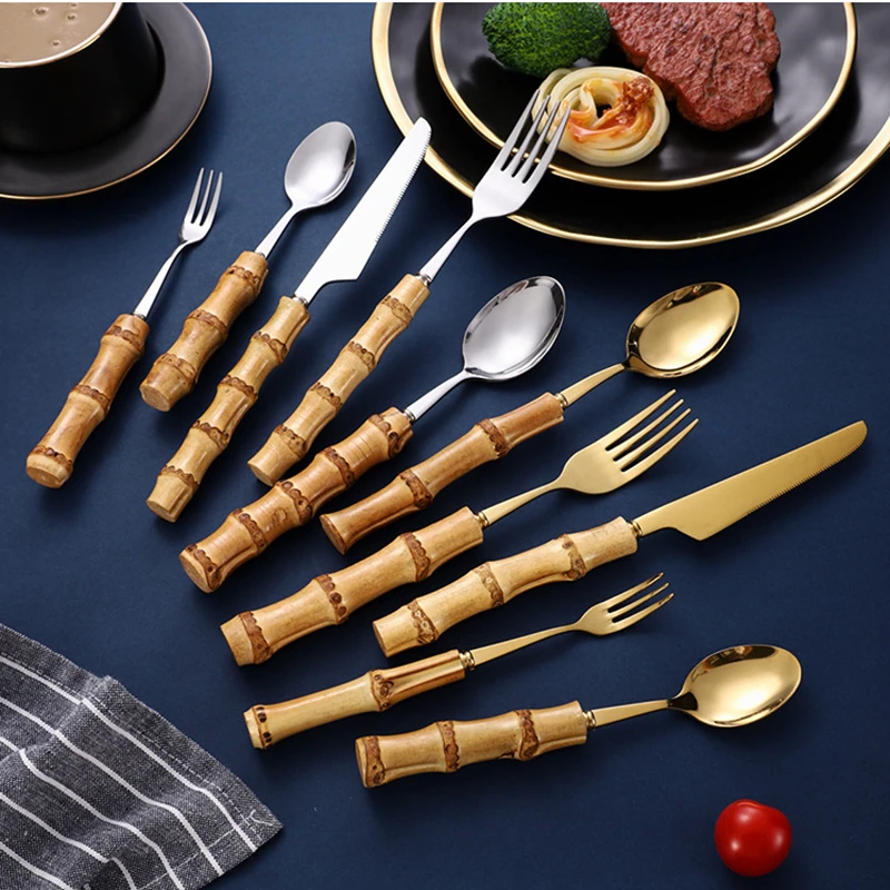 7Pcs Nature Bamboo Gold Set di posate in acciaio inossidabile creatività regalo posate in argento 304 coltello forchetta per insalata cucchiaio Drop Shipping