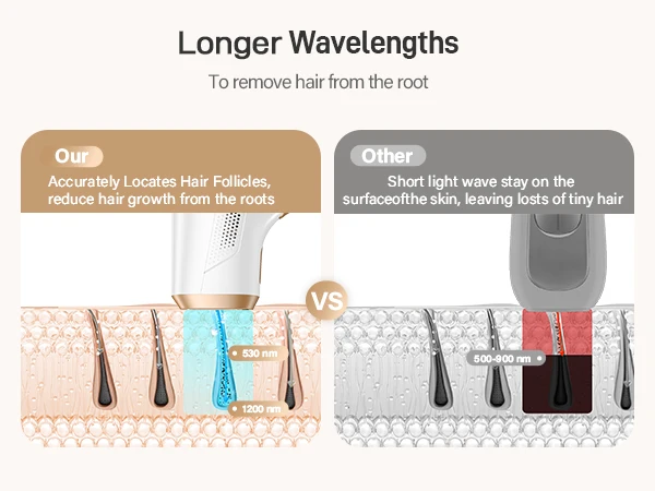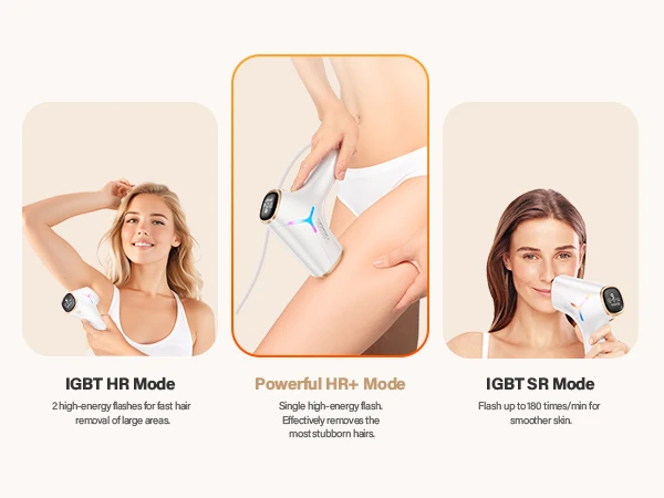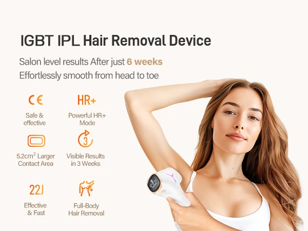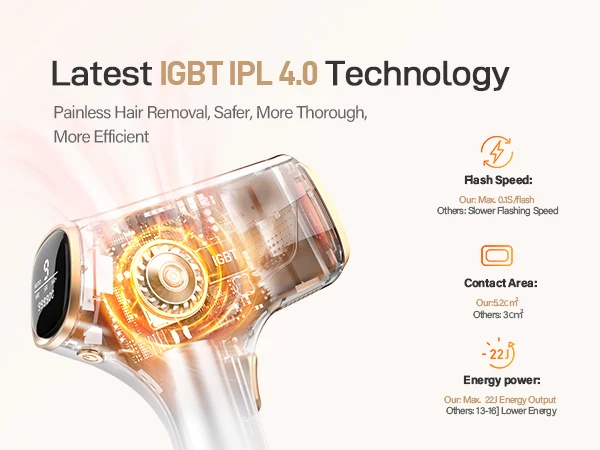 Doppia tecnologia di impulsi IGBT e realizzano 0.La flash veloce 12S può fornire due impulsi consecutivi, riduce il dolore causata da una sola energia per raggiungere la depilatore indolore, massima 22J può raggiungere profondo e accumulare la melanina del follicolo pilifero bersaglio per un rimo rapido ed efficace.