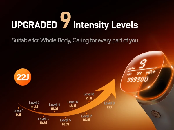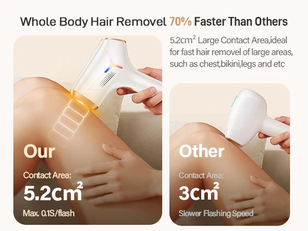 La velocità di flash massima massima di 0,12 secondi più rapida, la depilazione tradizionale leggera a impulso che rompe, può realizzare finiture per la depilazione di tutto il corpo in 8 minuti.I 9 livelli di energia personalizzati possono sarto ciascuno trattamento alle tue preferenze uniche, inizia dal livello 1 prima migliore.