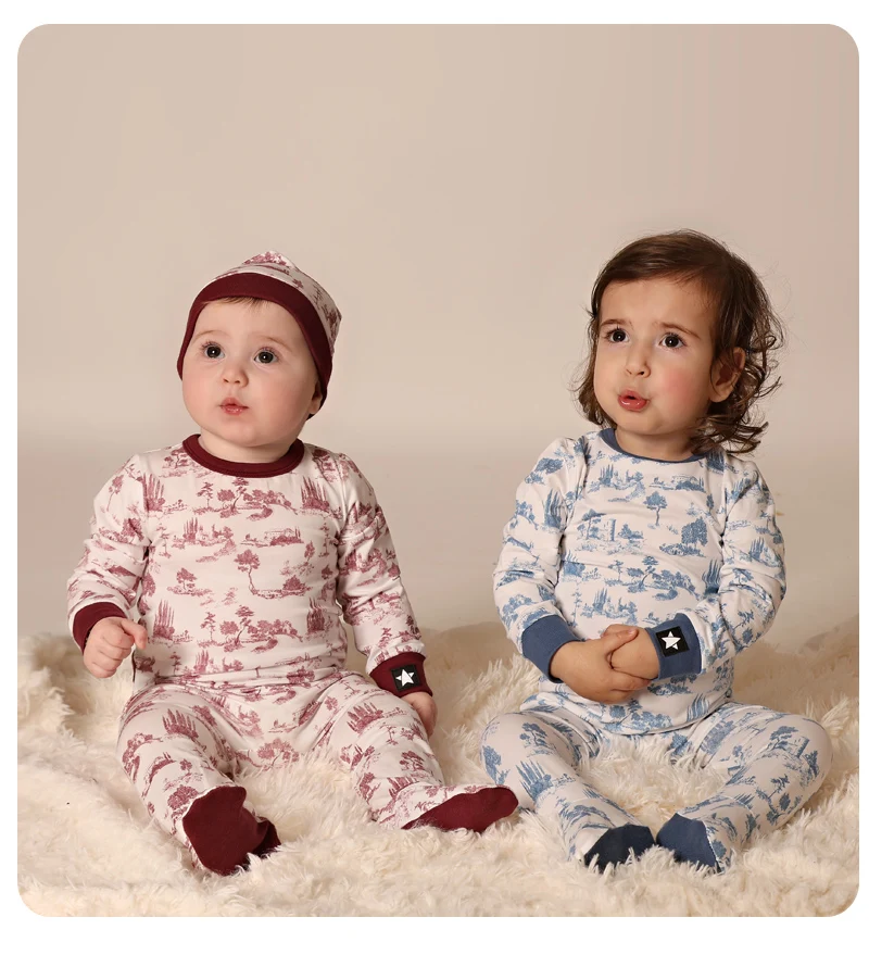 AA SS25 – Vestiti per bambini e neonati Toile francese Blu Rosa Pigiama e piedi accoglienti con cappello per corredino Set per bambini Pagliaccetto per bebè