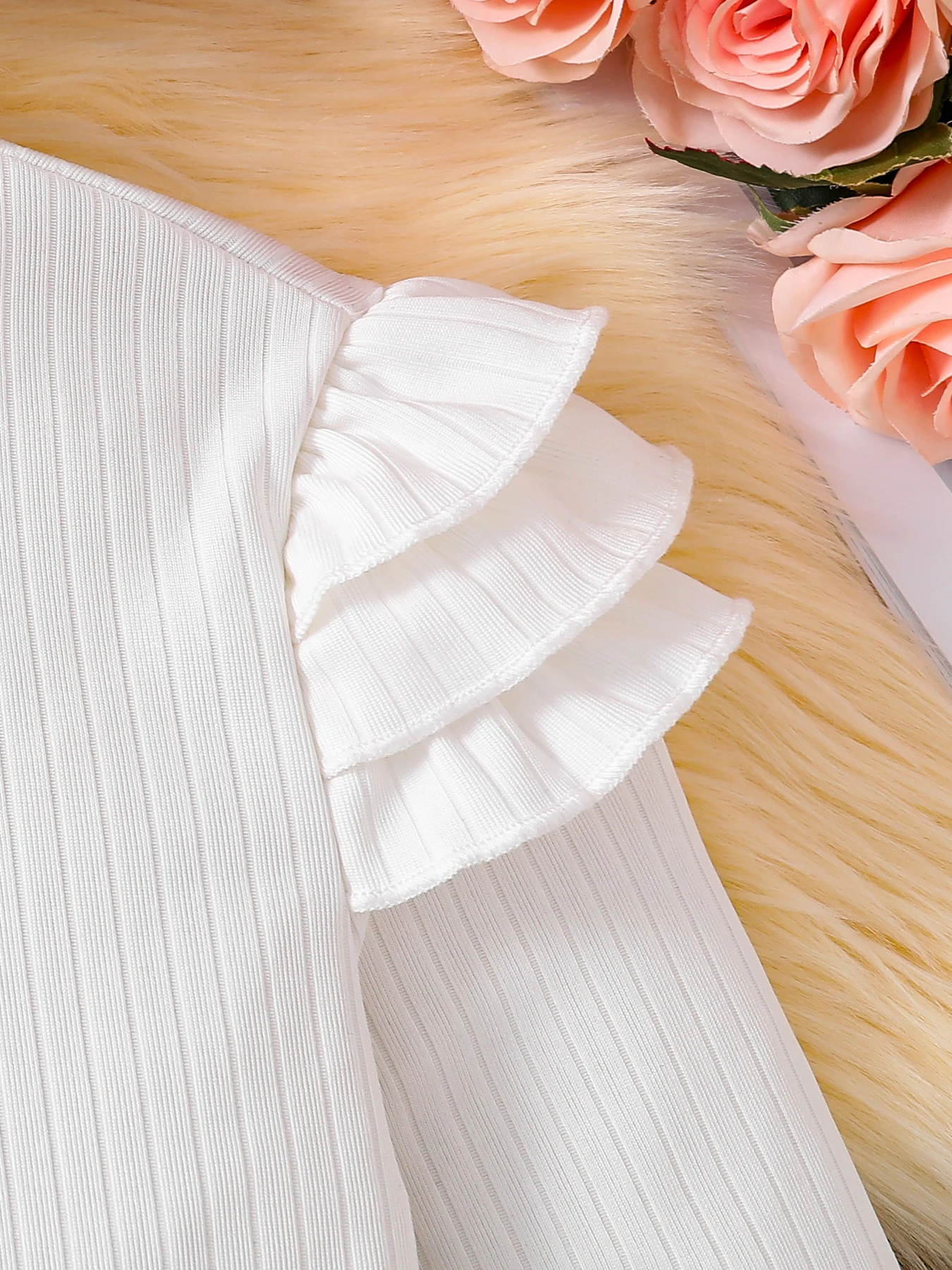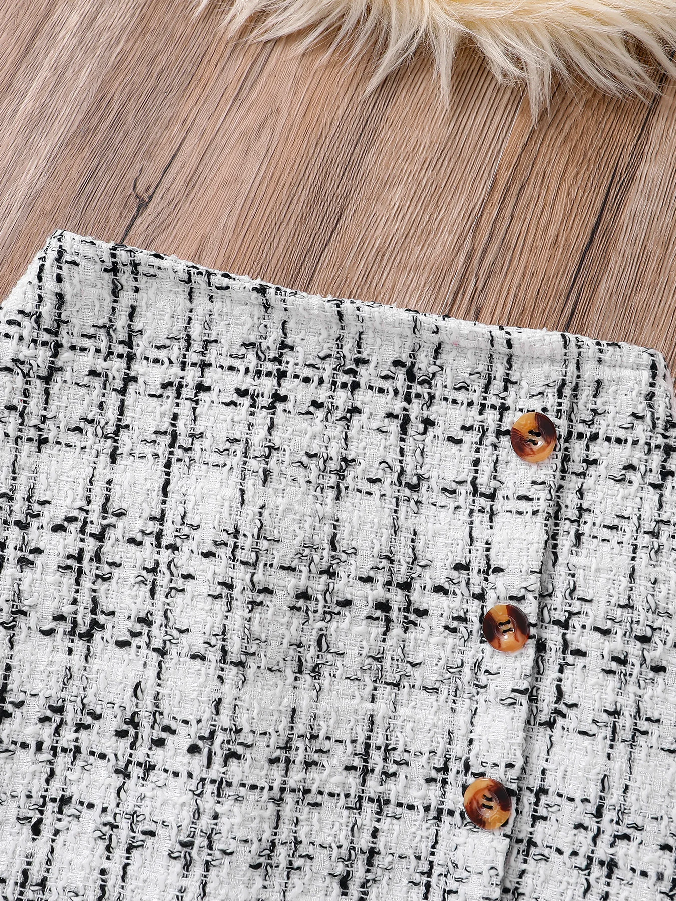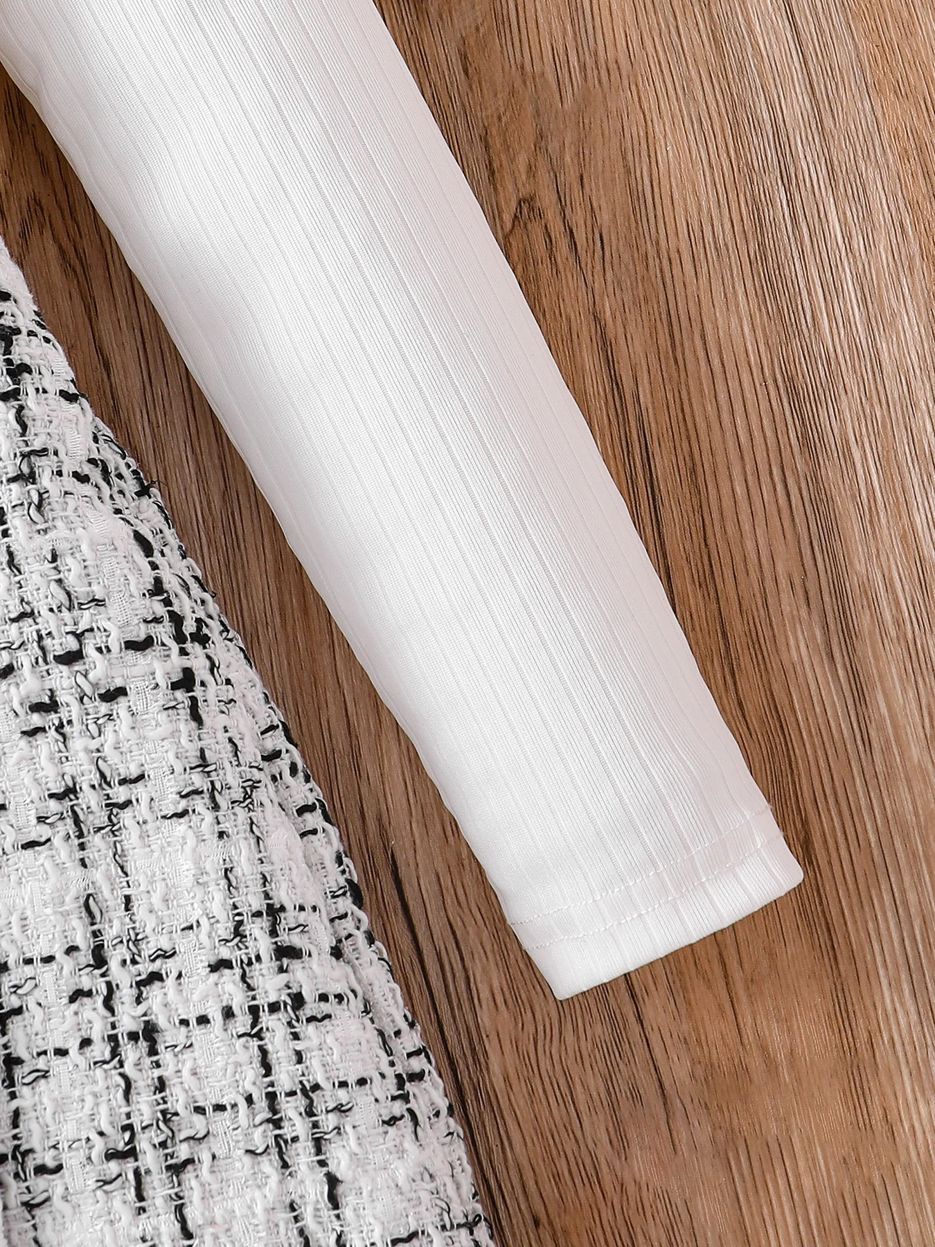 Abbigliamento casual moda 2 pezzi per bambini primaverili e autunnali top bianco a maniche lunghe con collo alto e maniche volanti + gonna a trapezio scozzese