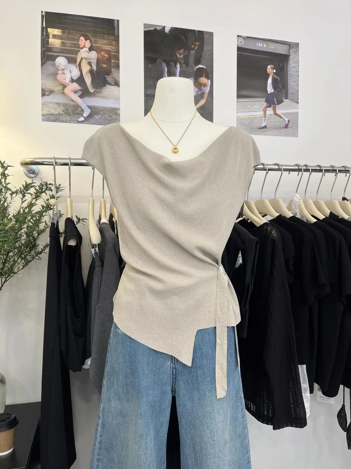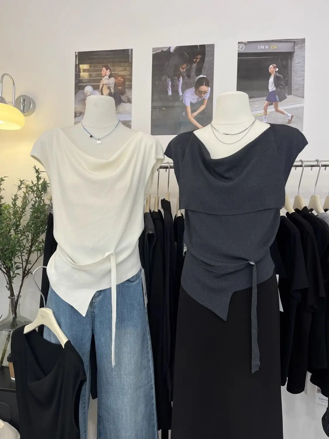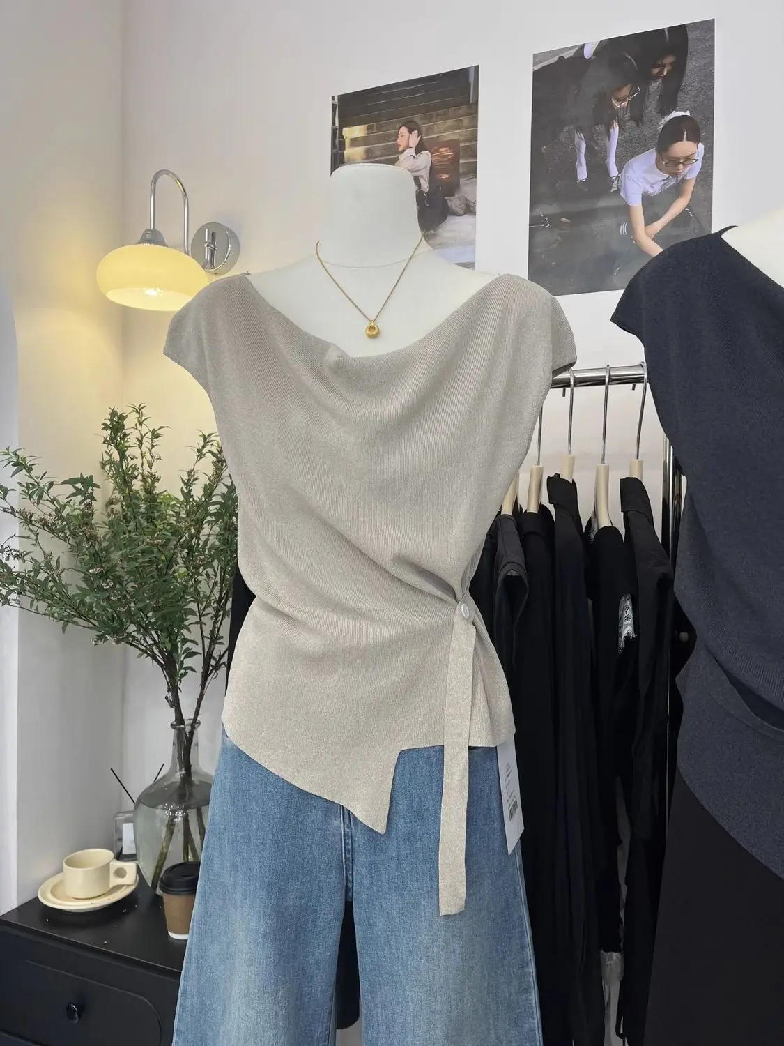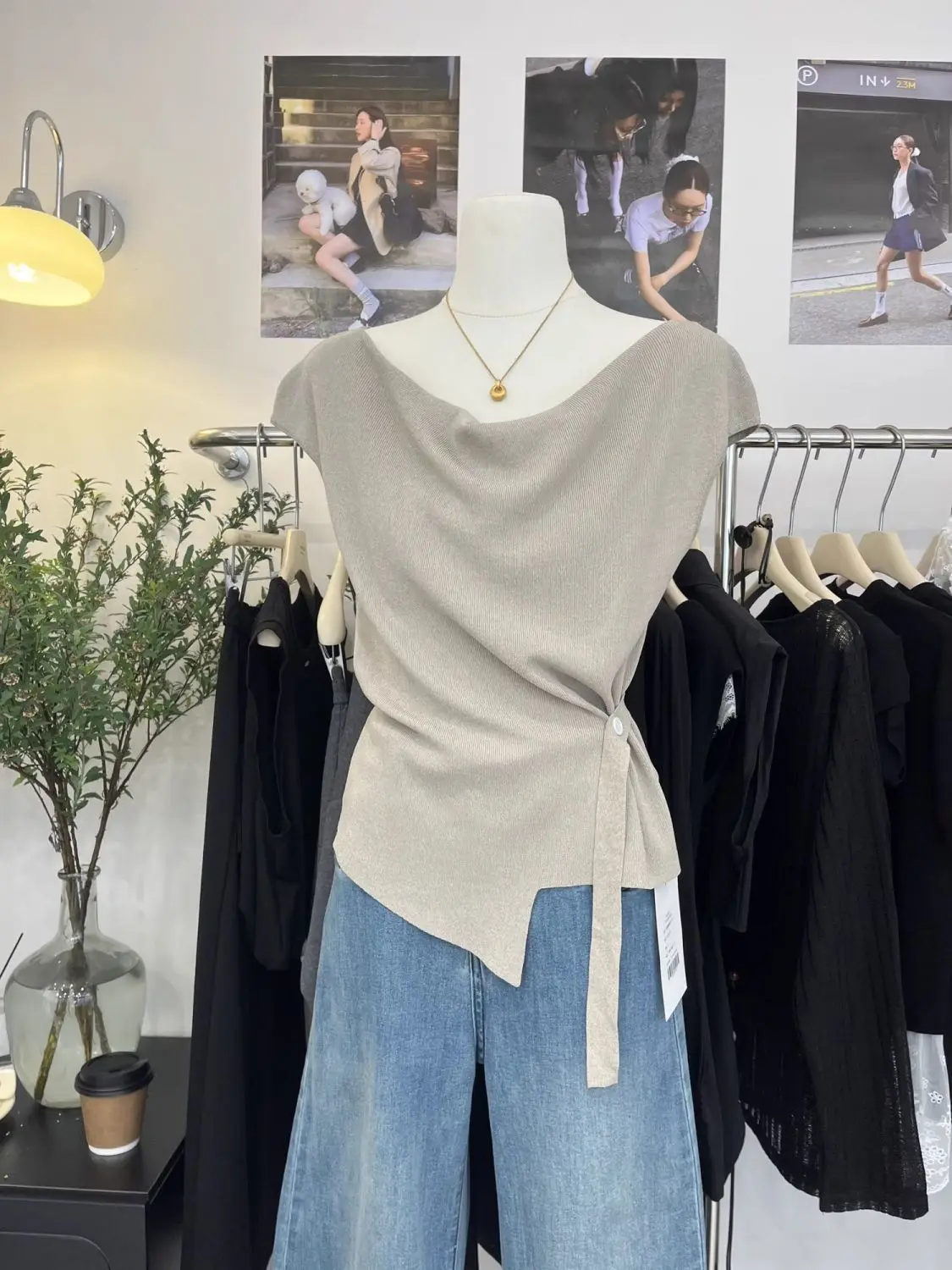 Abbigliamento da donna Camicie lavorate a maglia con maniche volanti piccole Estate Due modi di indossare T-shirt eleganti Lady Slash Neck Top chic irregolari