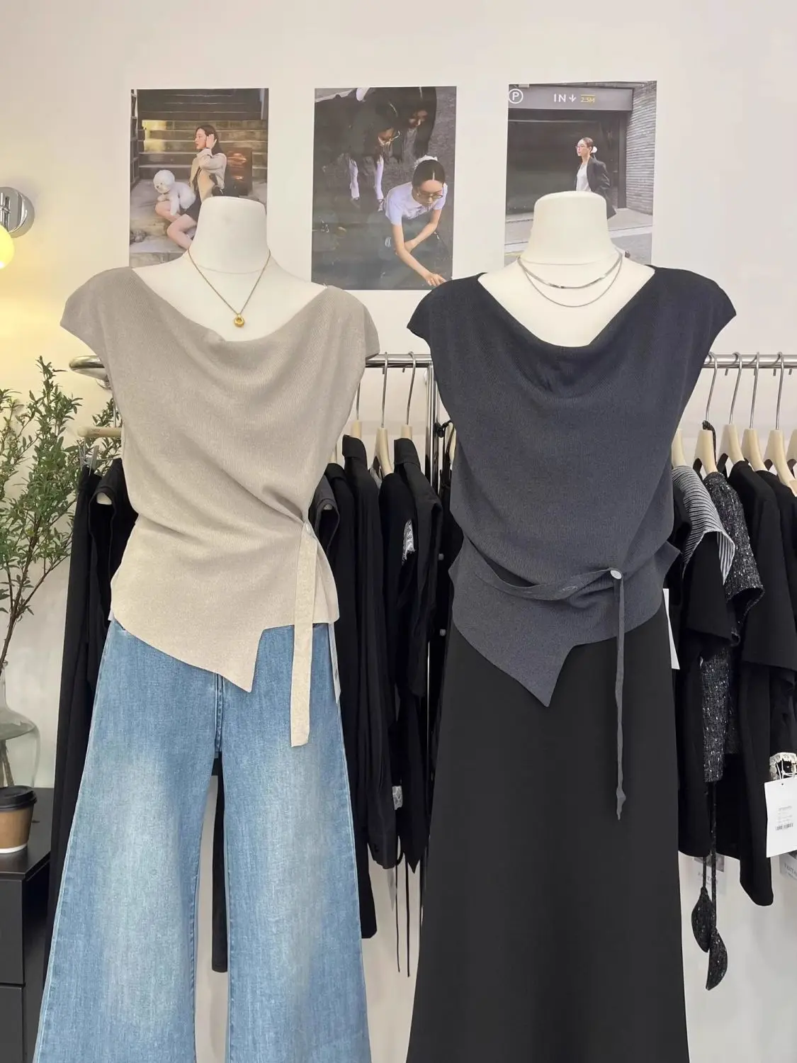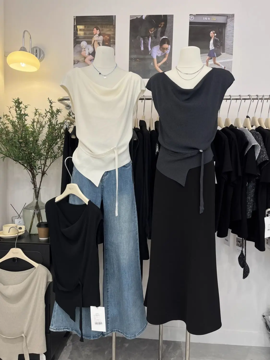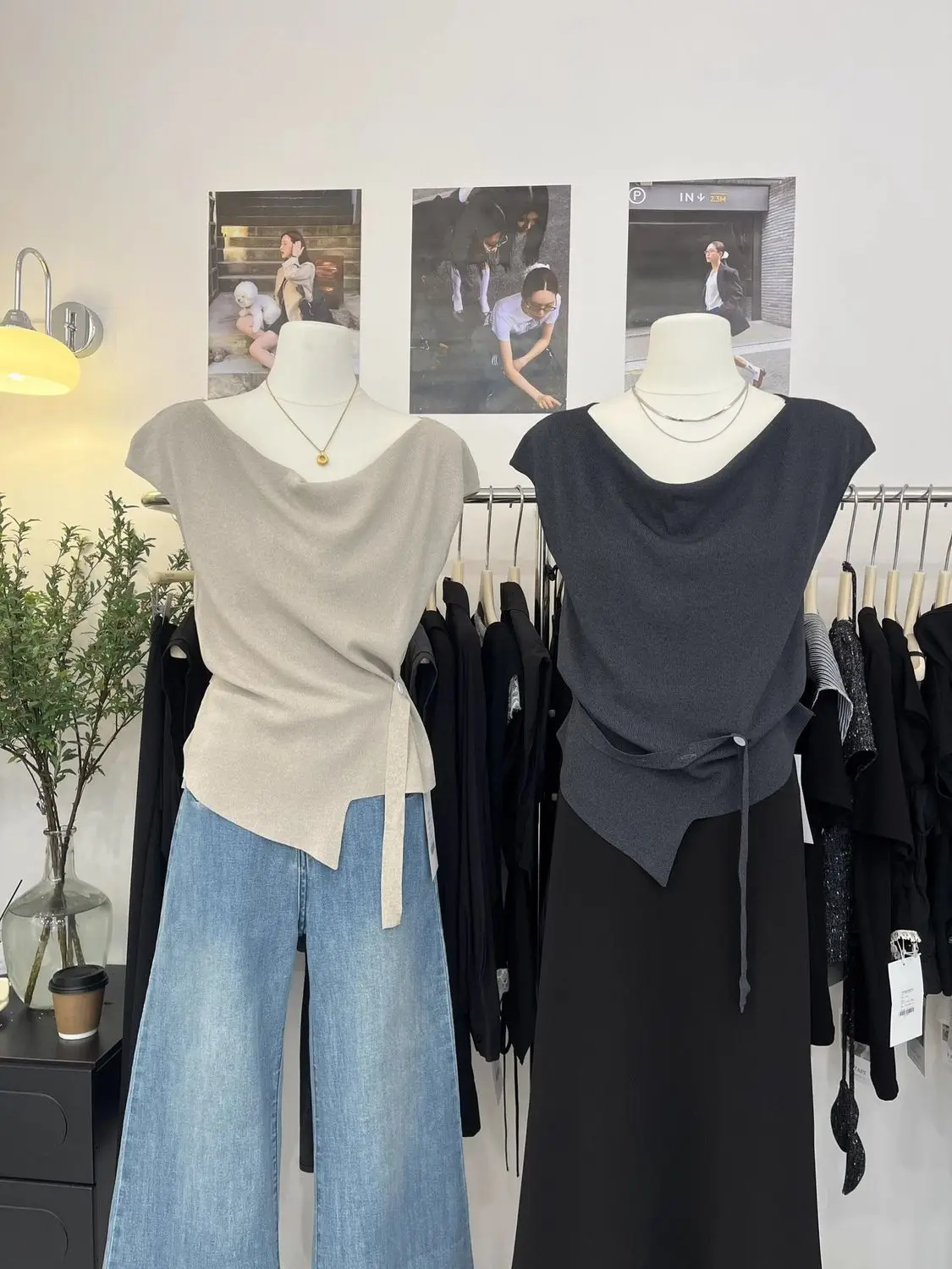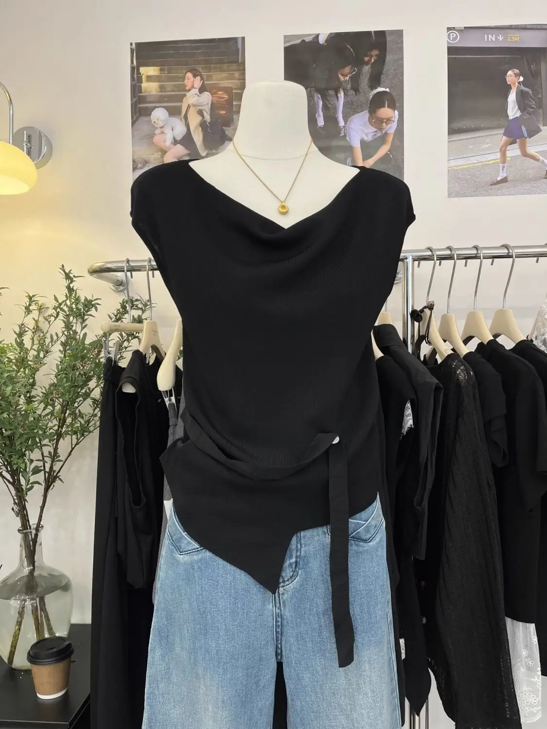 Abbigliamento da donna Camicie lavorate a maglia con maniche volanti piccole Estate Due modi di indossare T-shirt eleganti Lady Slash Neck Top chic irregolari