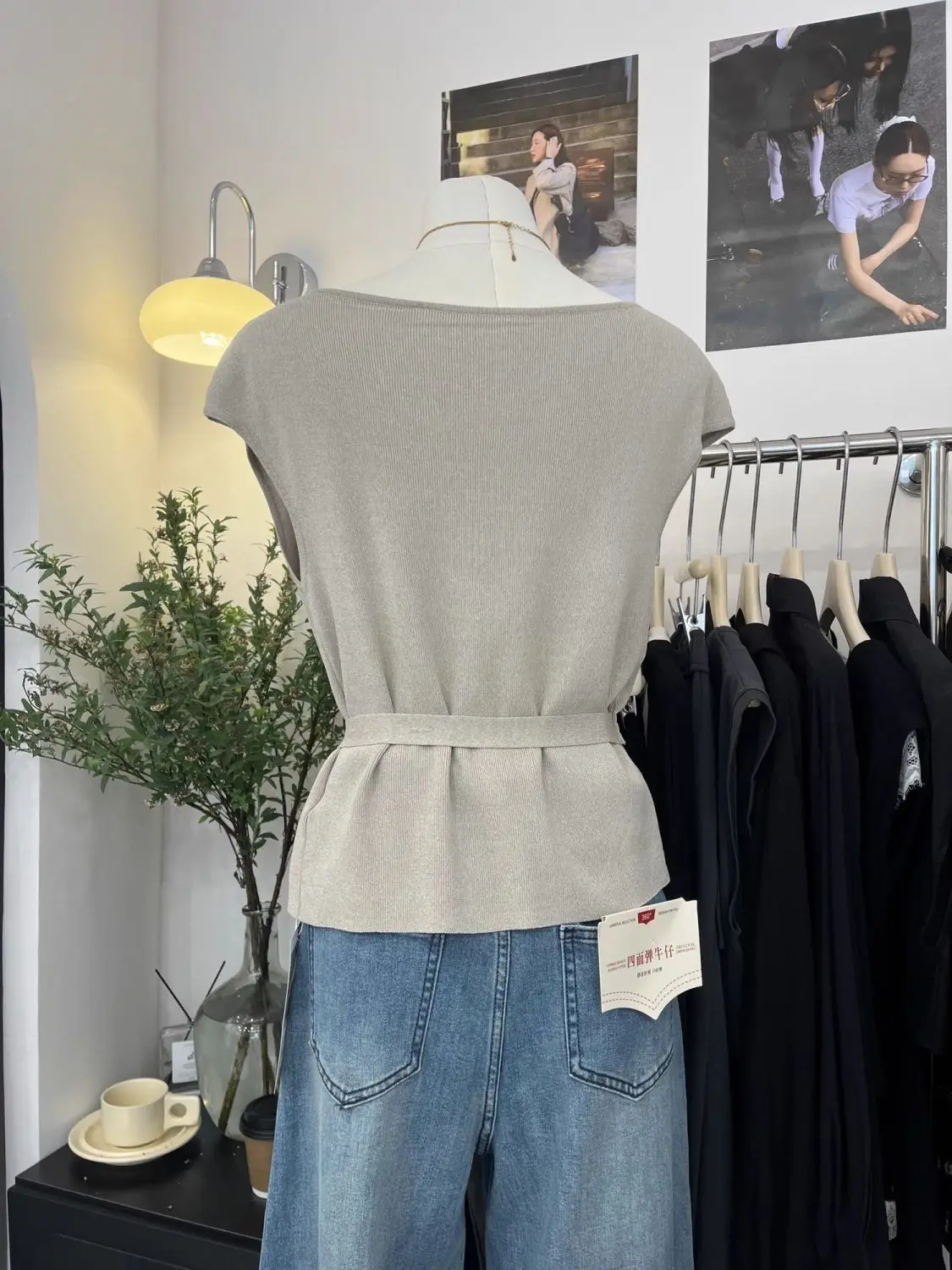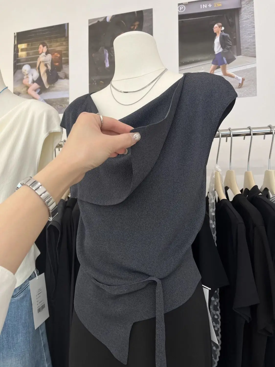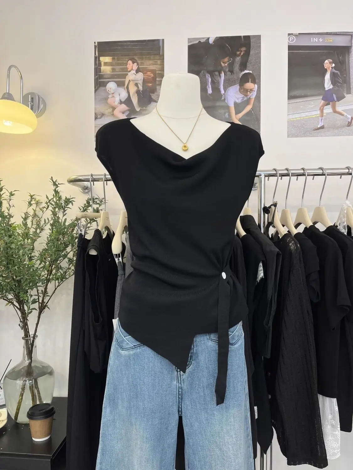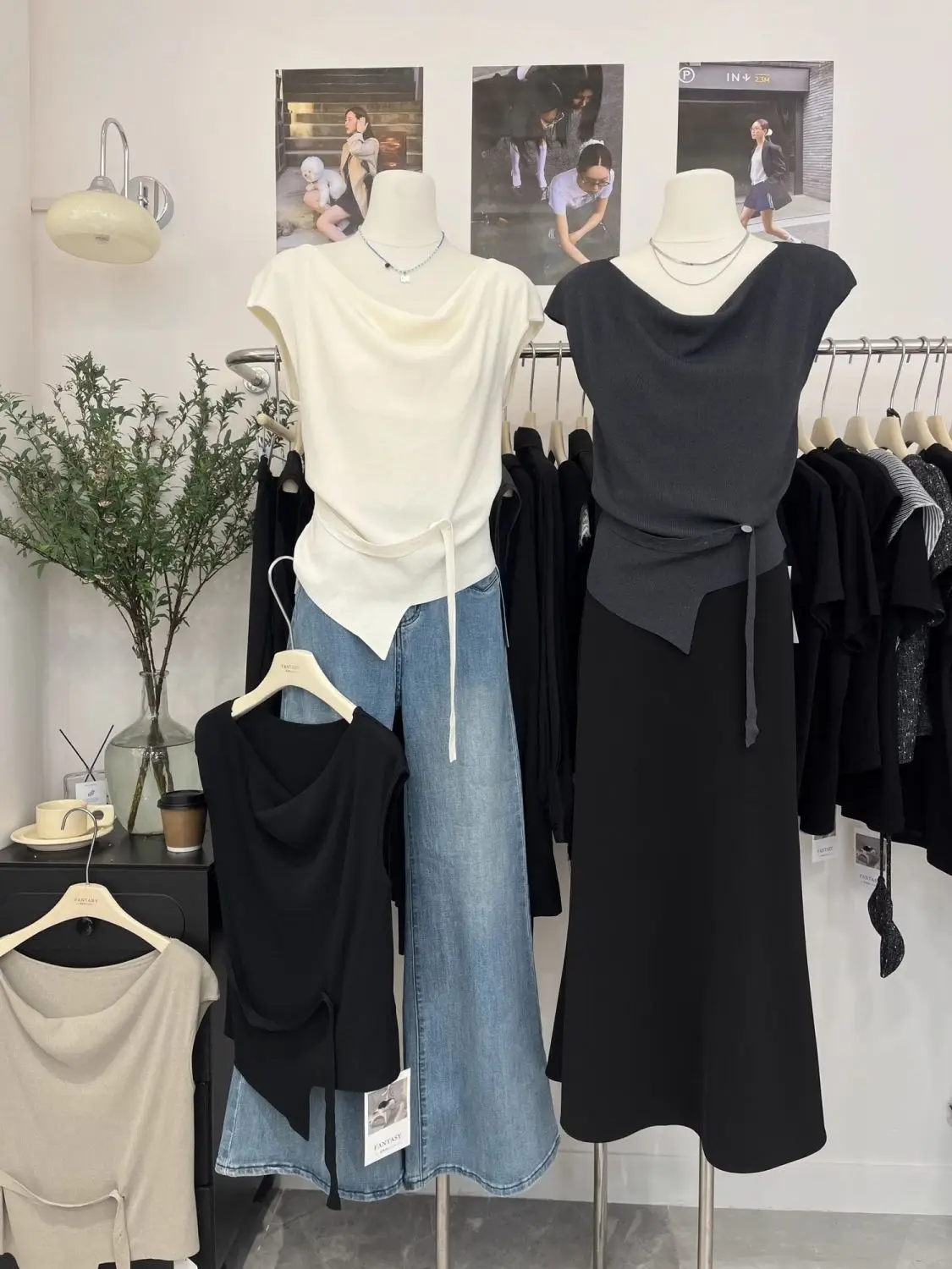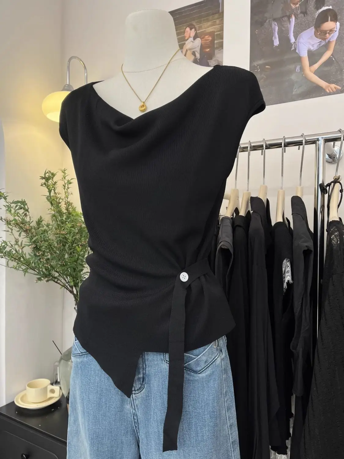 Abbigliamento da donna Camicie lavorate a maglia con maniche volanti piccole Estate Due modi di indossare T-shirt eleganti Lady Slash Neck Top chic irregolari