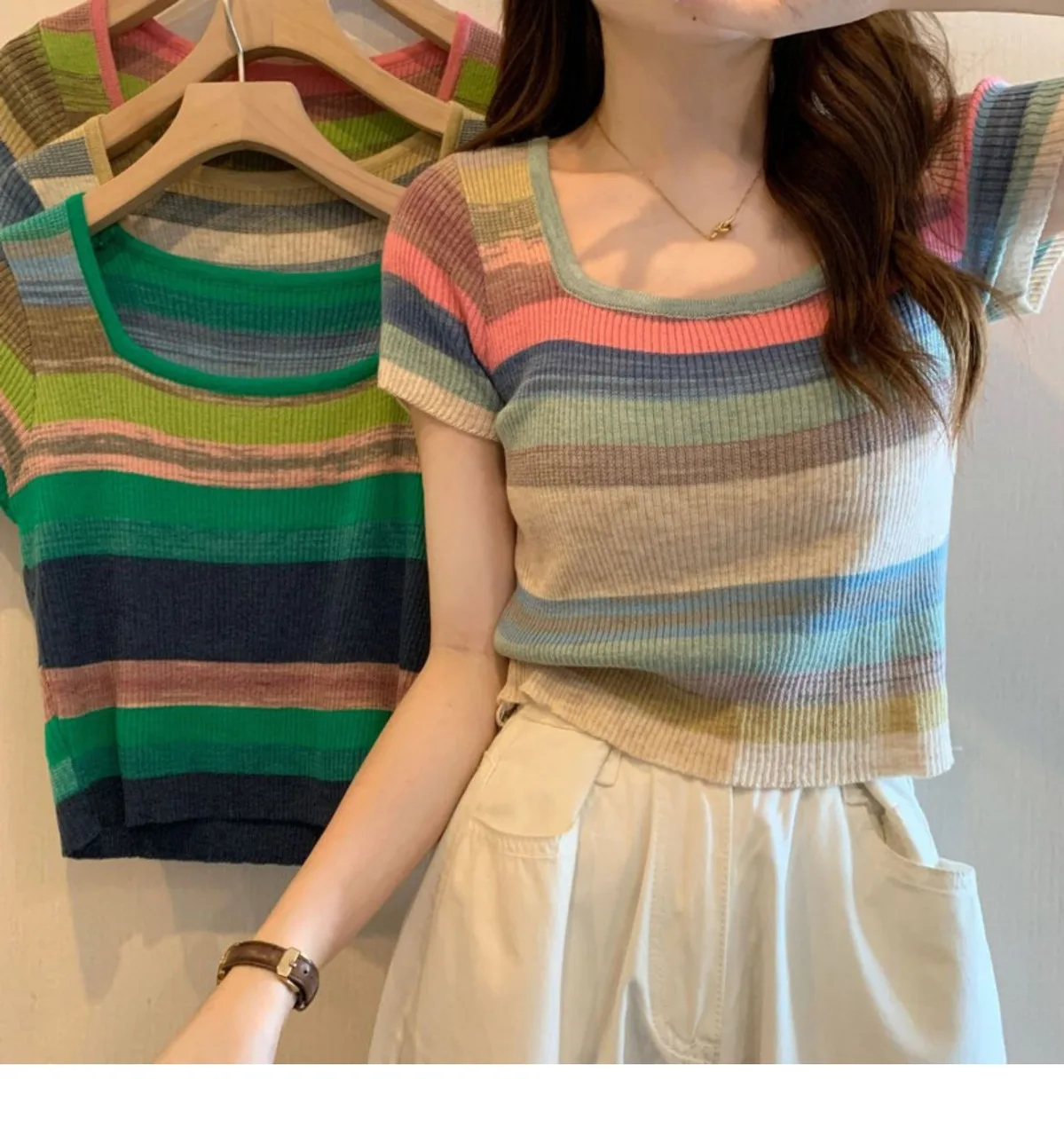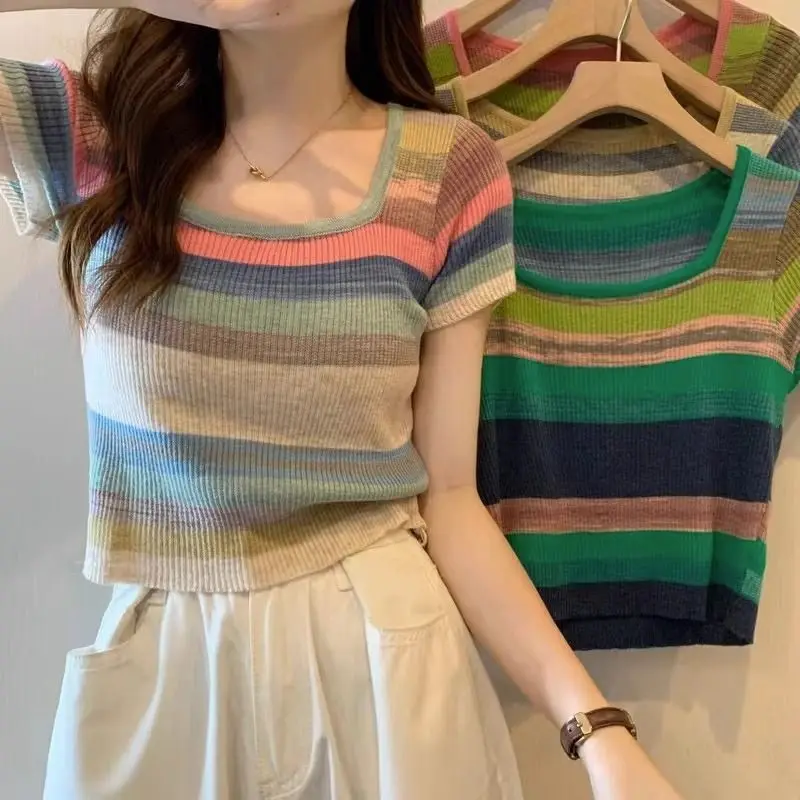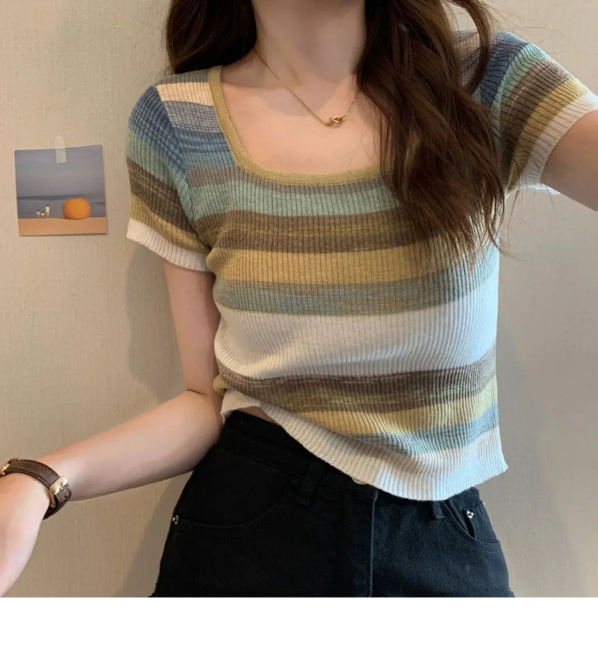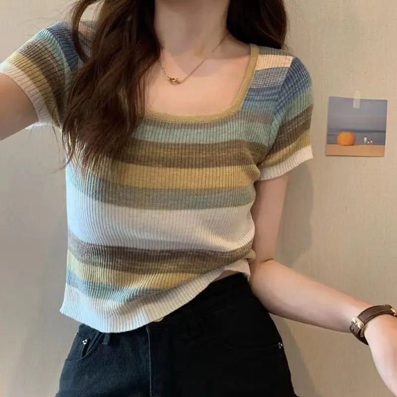 Abbigliamento da donna T-shirt a maniche corte lavorata a maglia a righe moda Estate Casual Slim Colletto quadrato Sottile Top Office Lady Elegante Tee