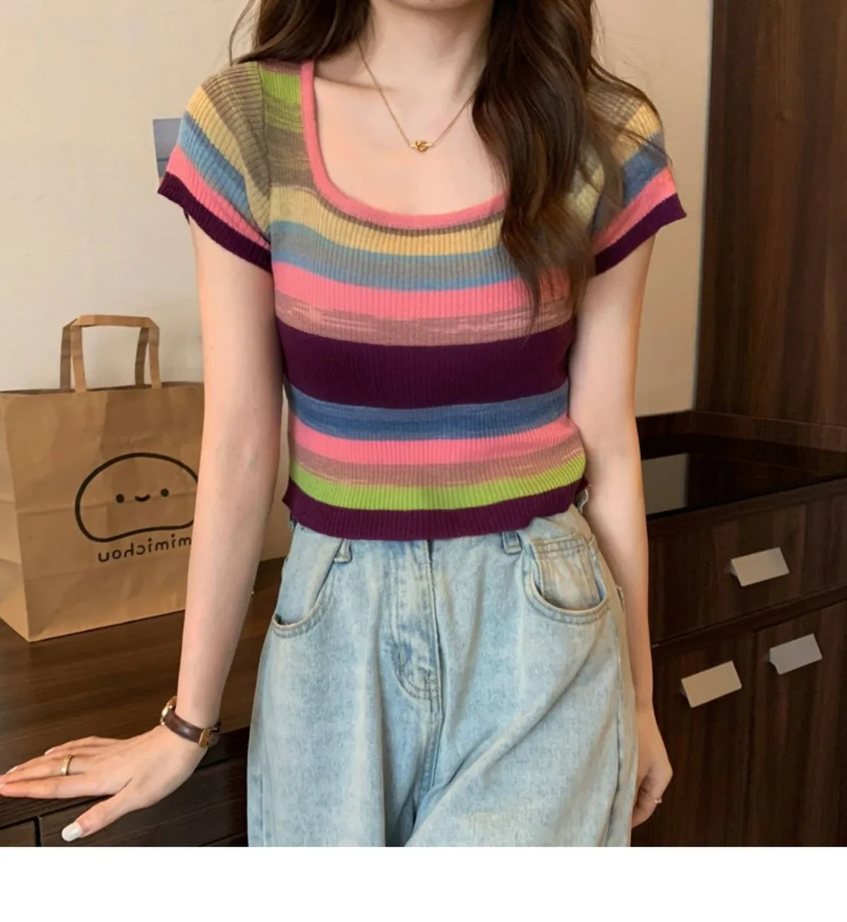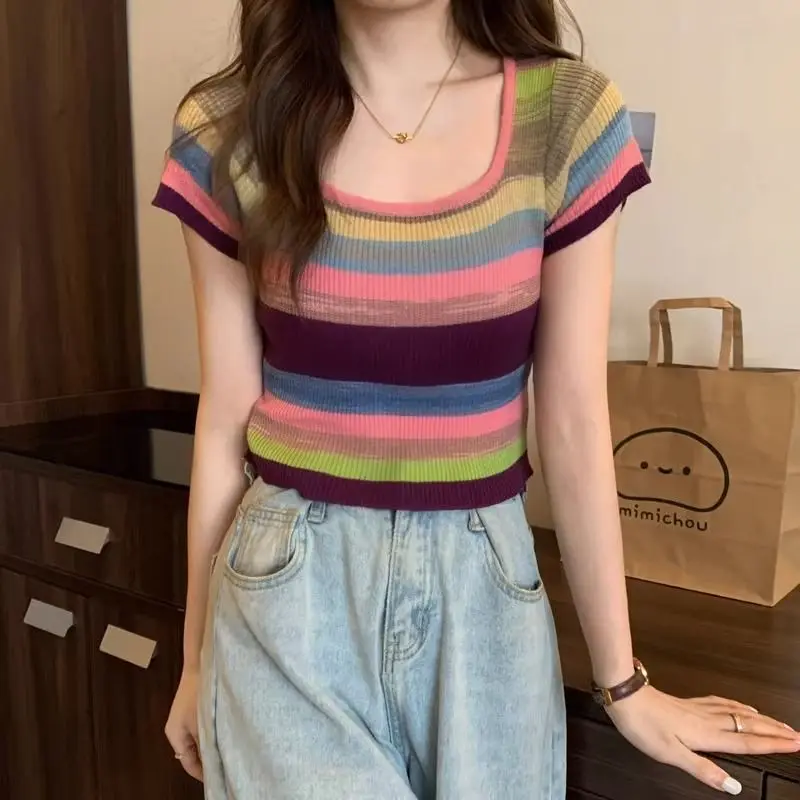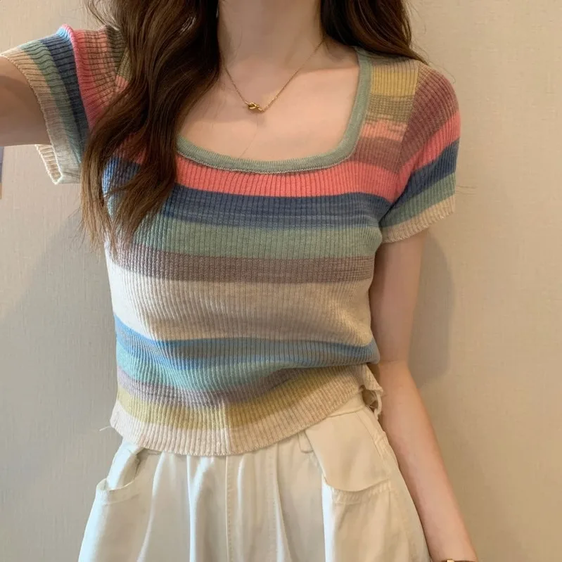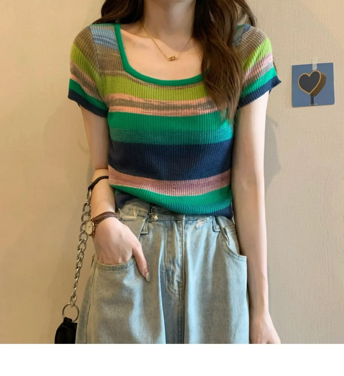Abbigliamento da donna T-shirt a maniche corte lavorata a maglia a righe moda Estate Casual Slim Colletto quadrato Sottile Top Office Lady Elegante Tee