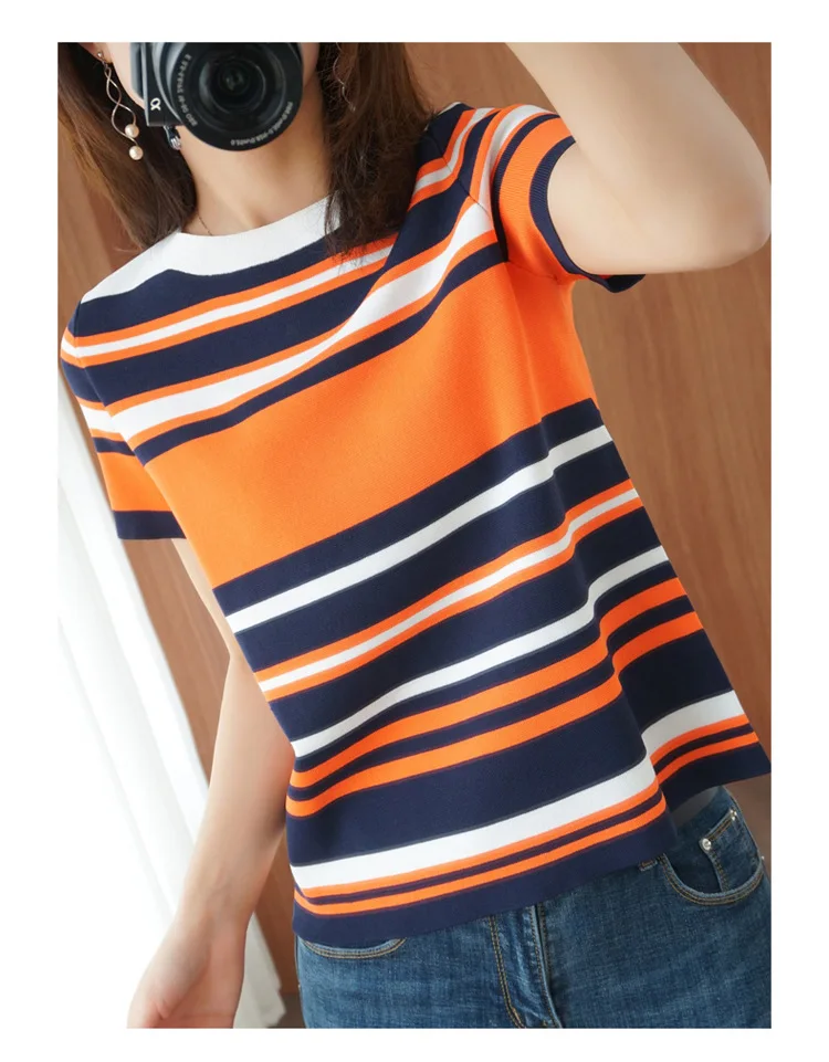 Abbigliamento da donna T-shirt a righe a blocchi di colore Moda estiva Maglia a maniche corte T-shirt stile sottile Lady Pullover O-Collo Top versatili