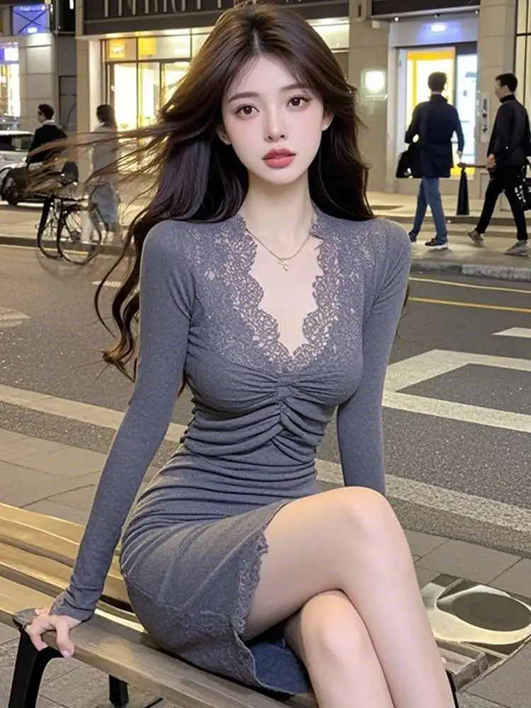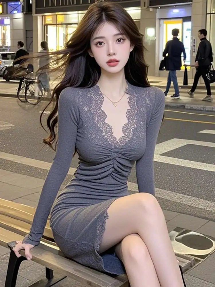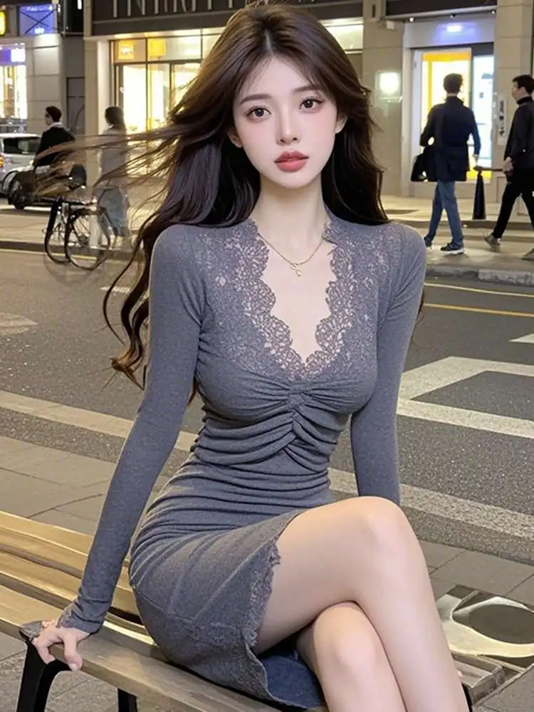 Gonna aderente in pizzo con scollo a V a maniche lunghe stampata slim fit da donna Incontri Abito autunnale versatile ed elegante stile pendolarismo