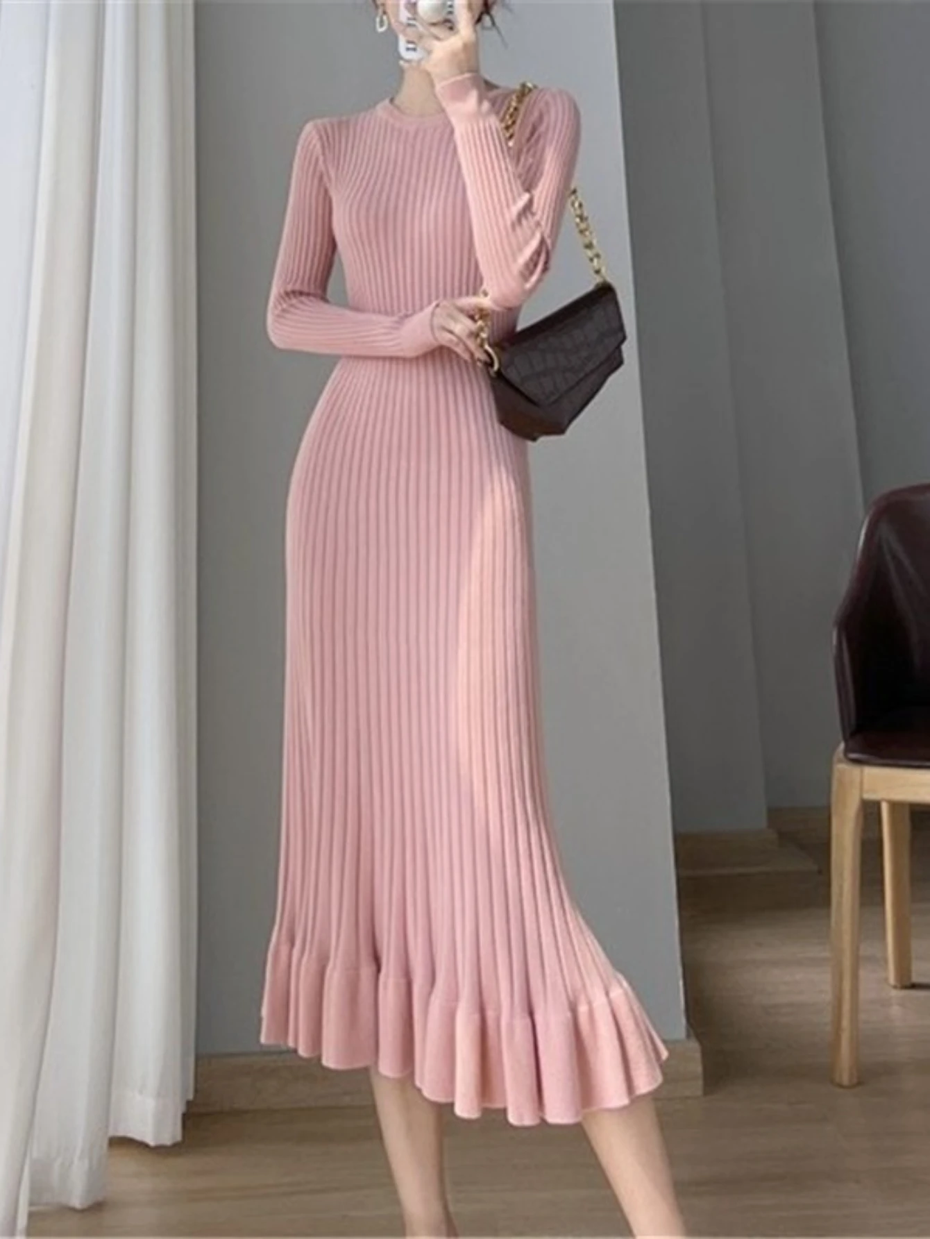 Abiti lunghi lavorati a maglia Abito a strati base da donna Colletto tondo Abito lungo lavorato a maglia increspato 2025 Abiti da donna da ufficio autunno inverno