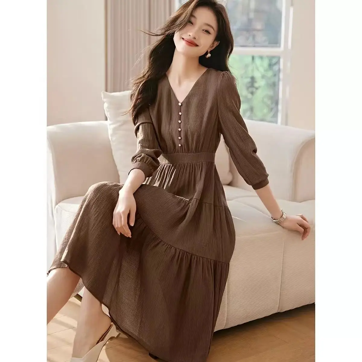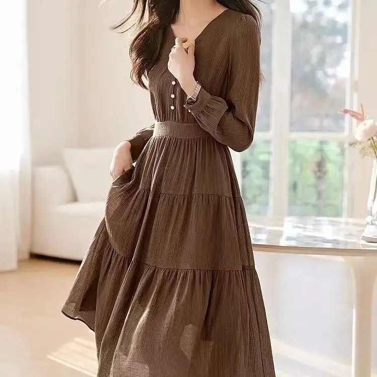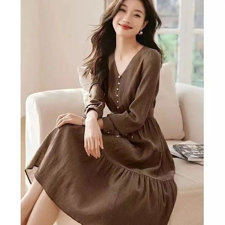 Abito a maniche lunghe in vita casual versatile slim fit tinta unita con scollo a V cucito da donna alla moda 2025
