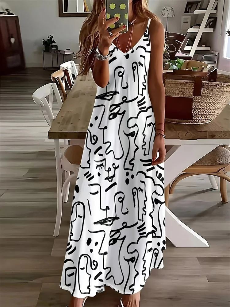Abito al ginocchio con scollo a V casual stampato con pittura a lavaggio con inchiostro 3D, abito lungo da donna casual alla moda di strada all’aperto, ampio e casual
