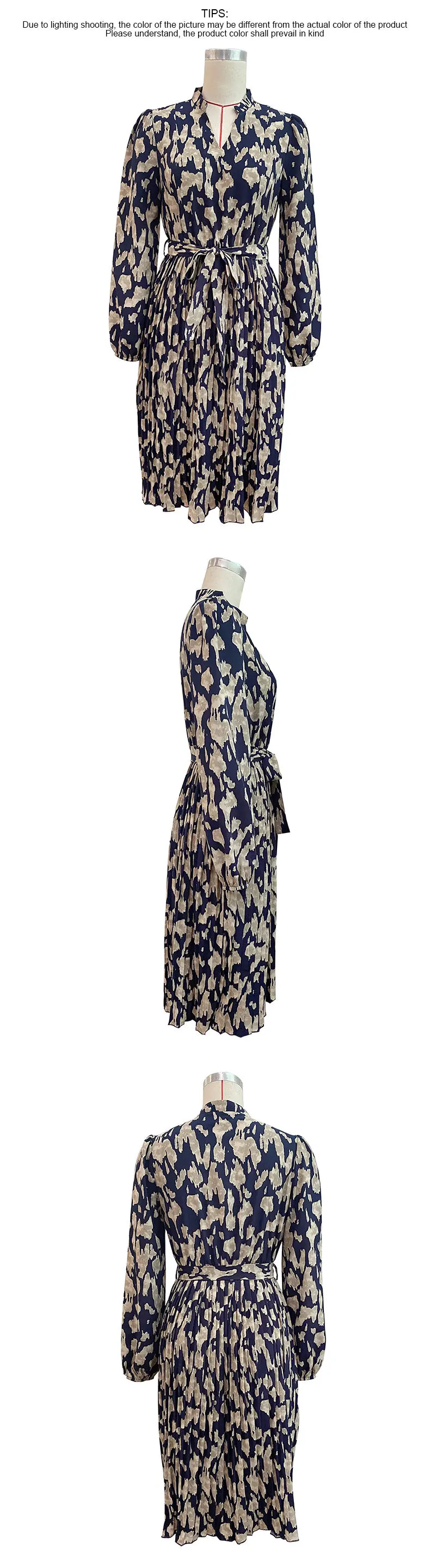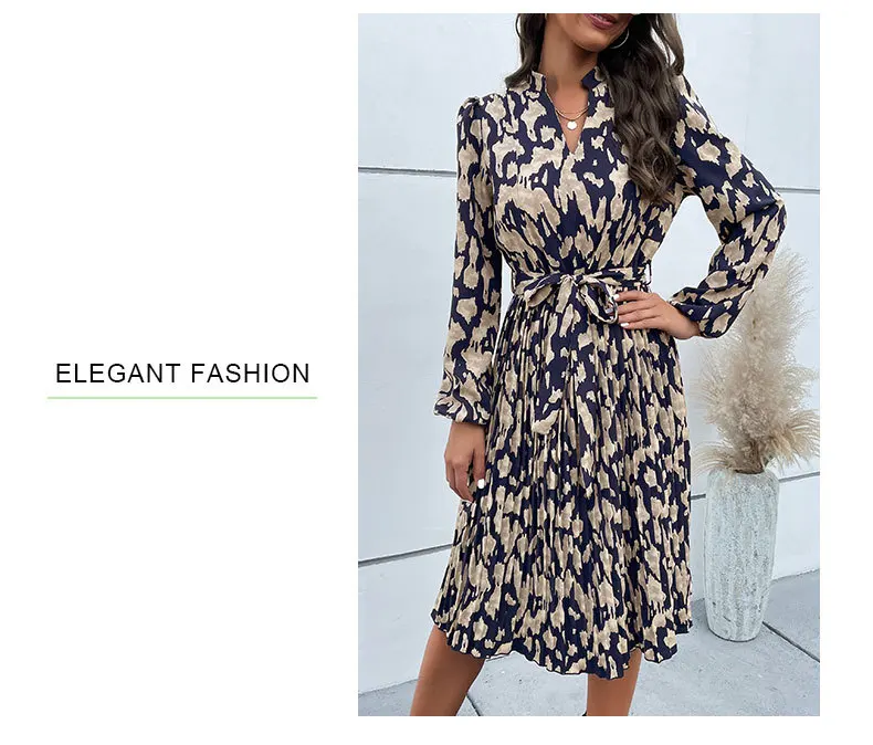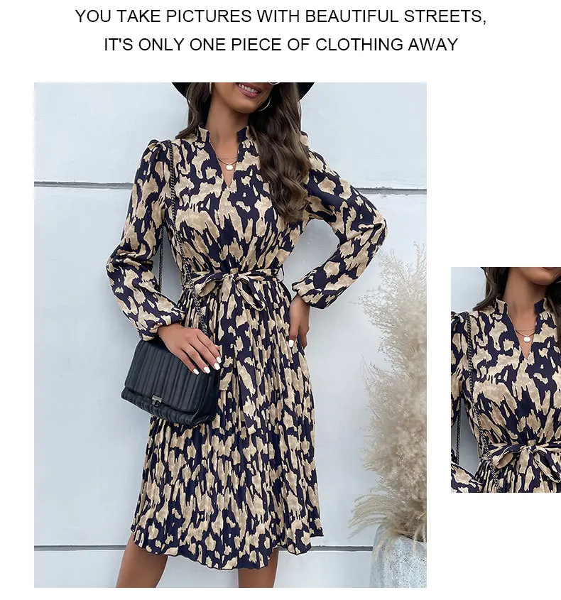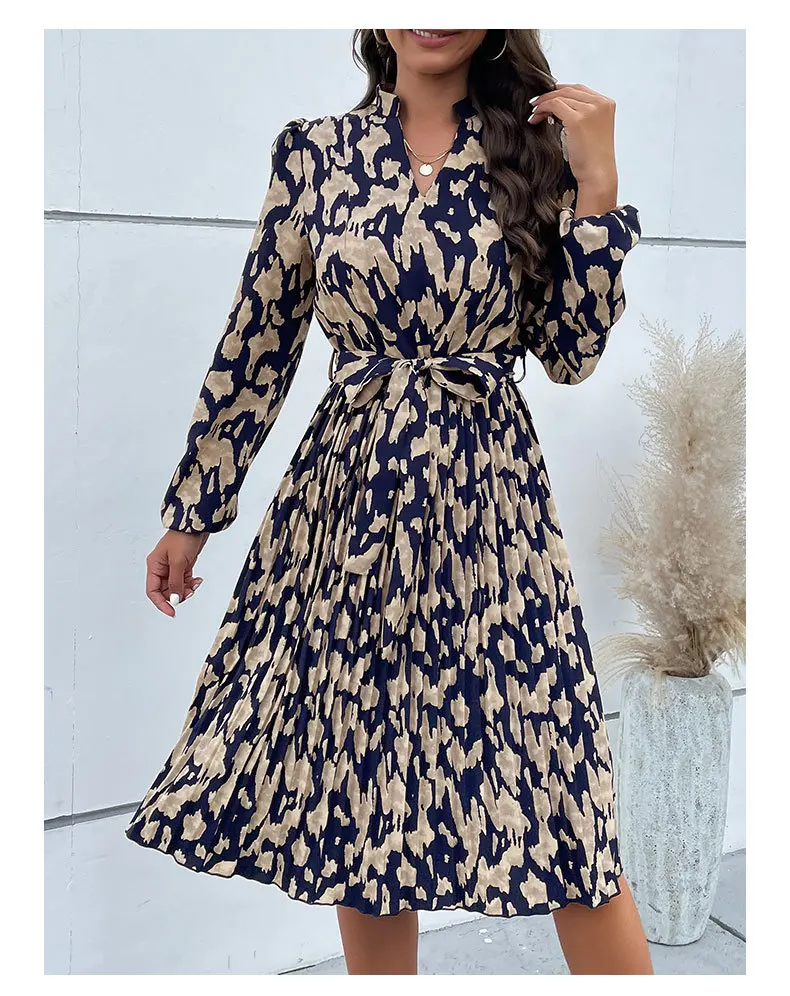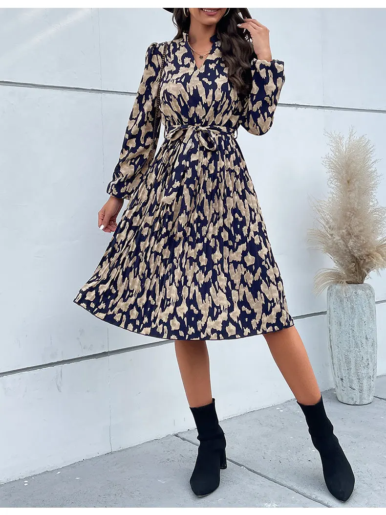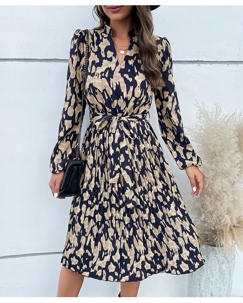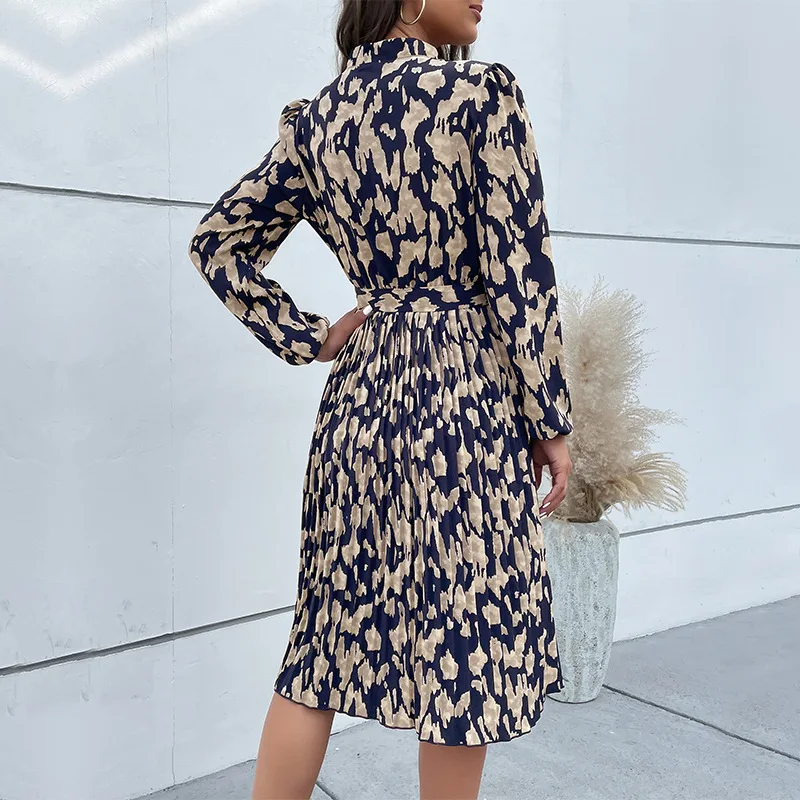 Abito altalena al ginocchio con lacci stampato retrò da donna 2024 Autunno da donna Nuovo abito a maniche lunghe pieghettato Abiti da Mujer Плаusе