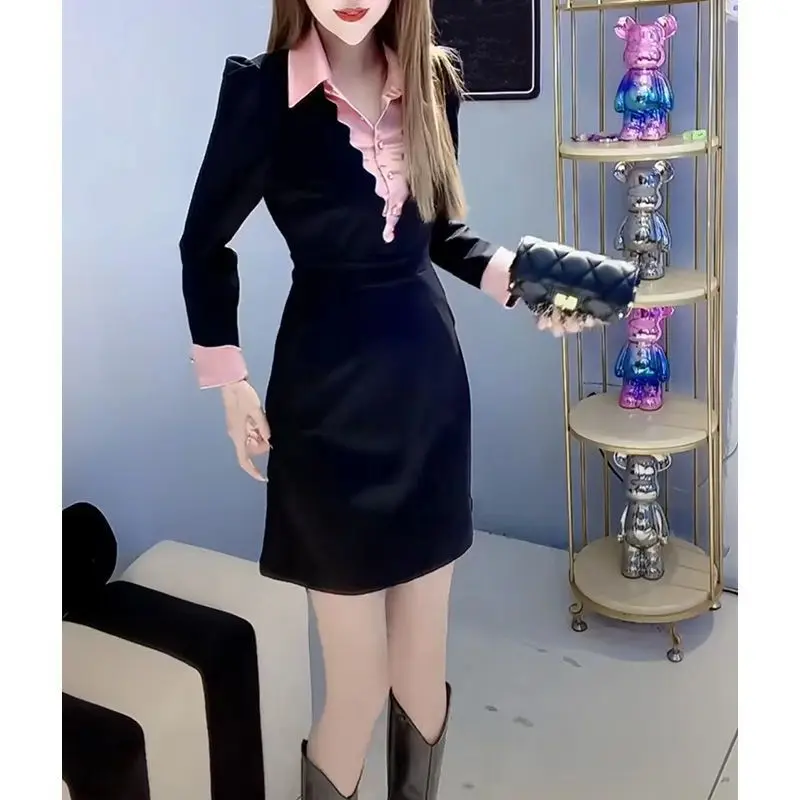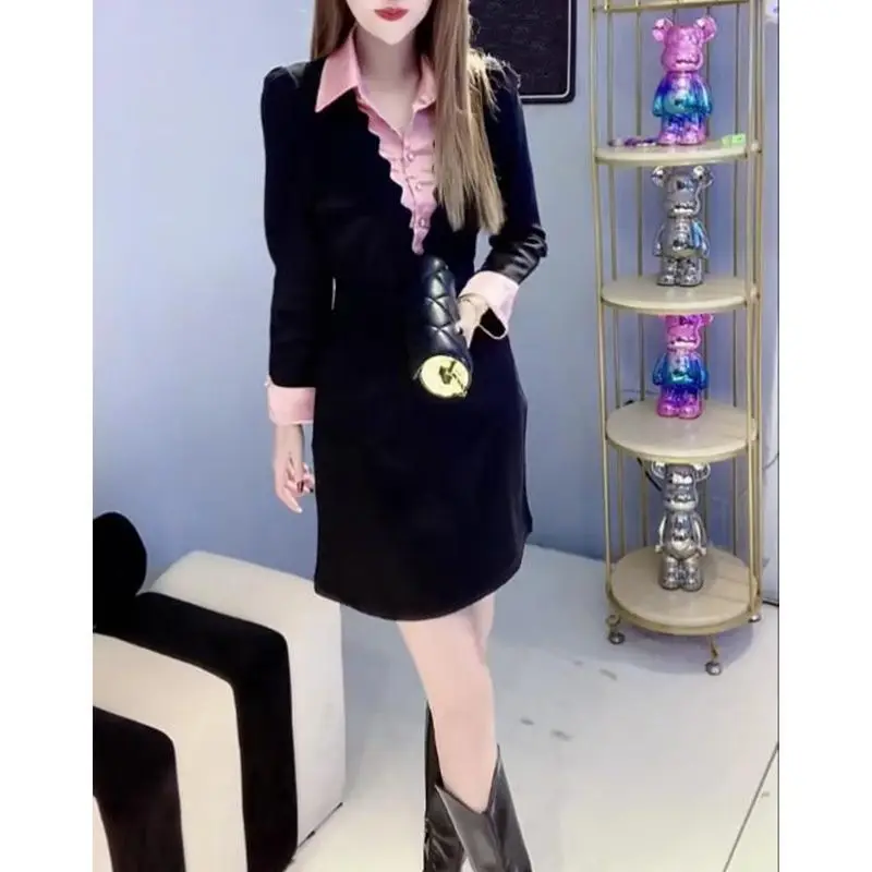 Abito con colletto a camicia piccolo da donna in autunno e inverno Nuova gonna di media lunghezza attillata in vita sottile