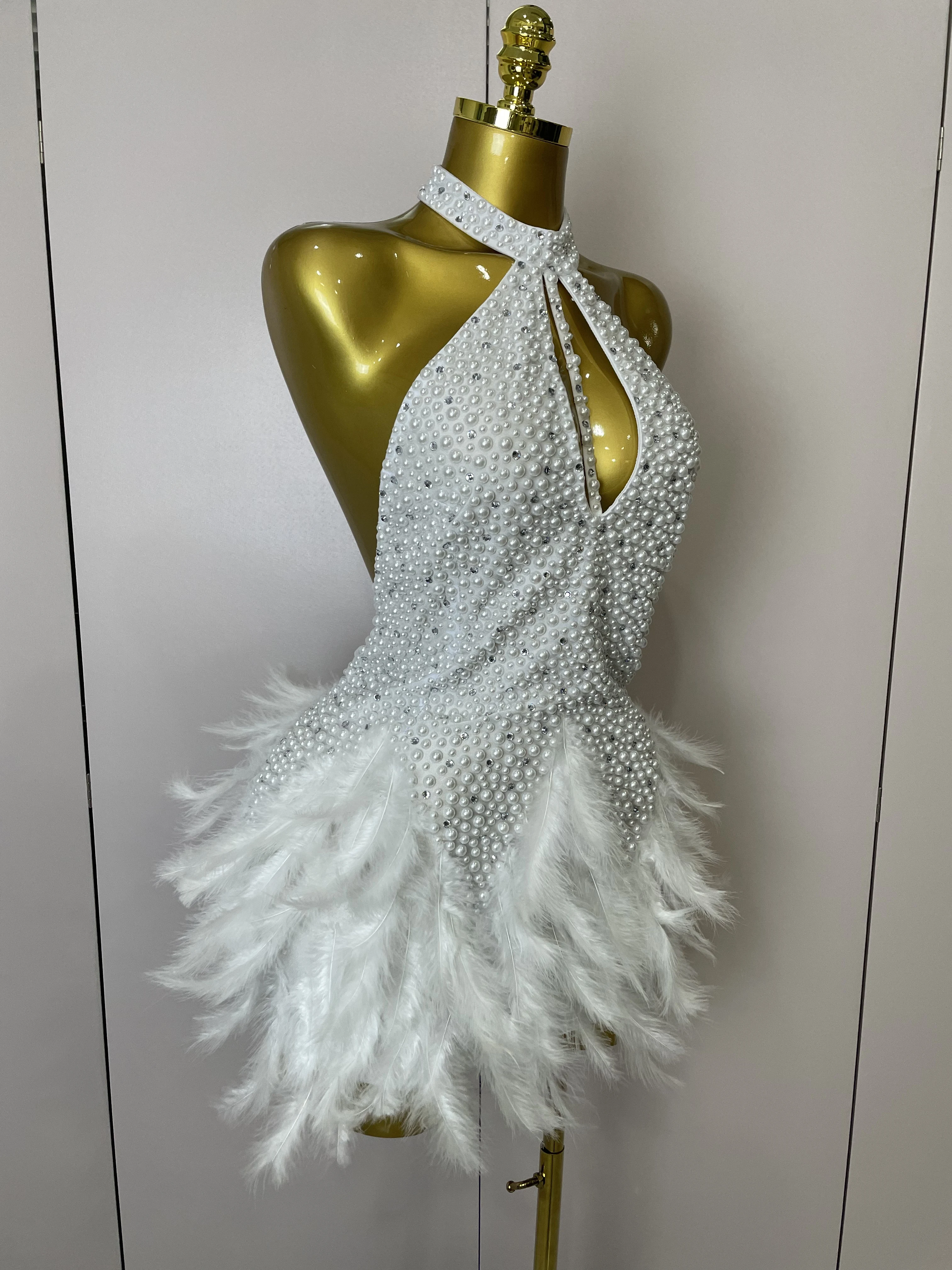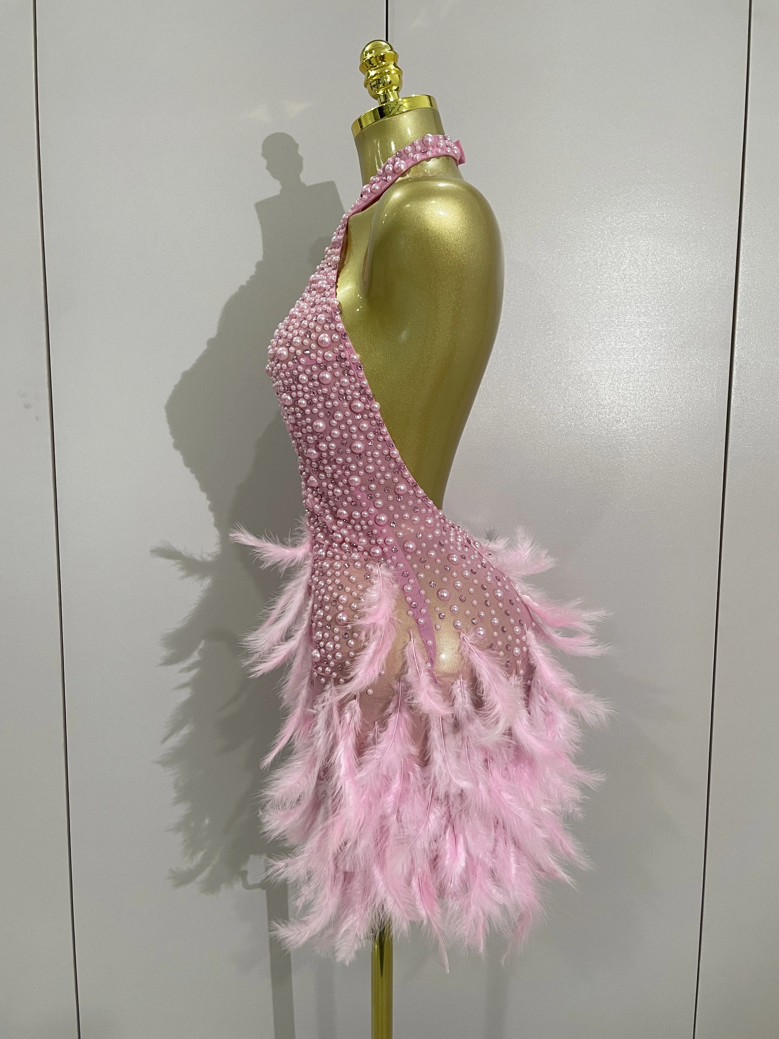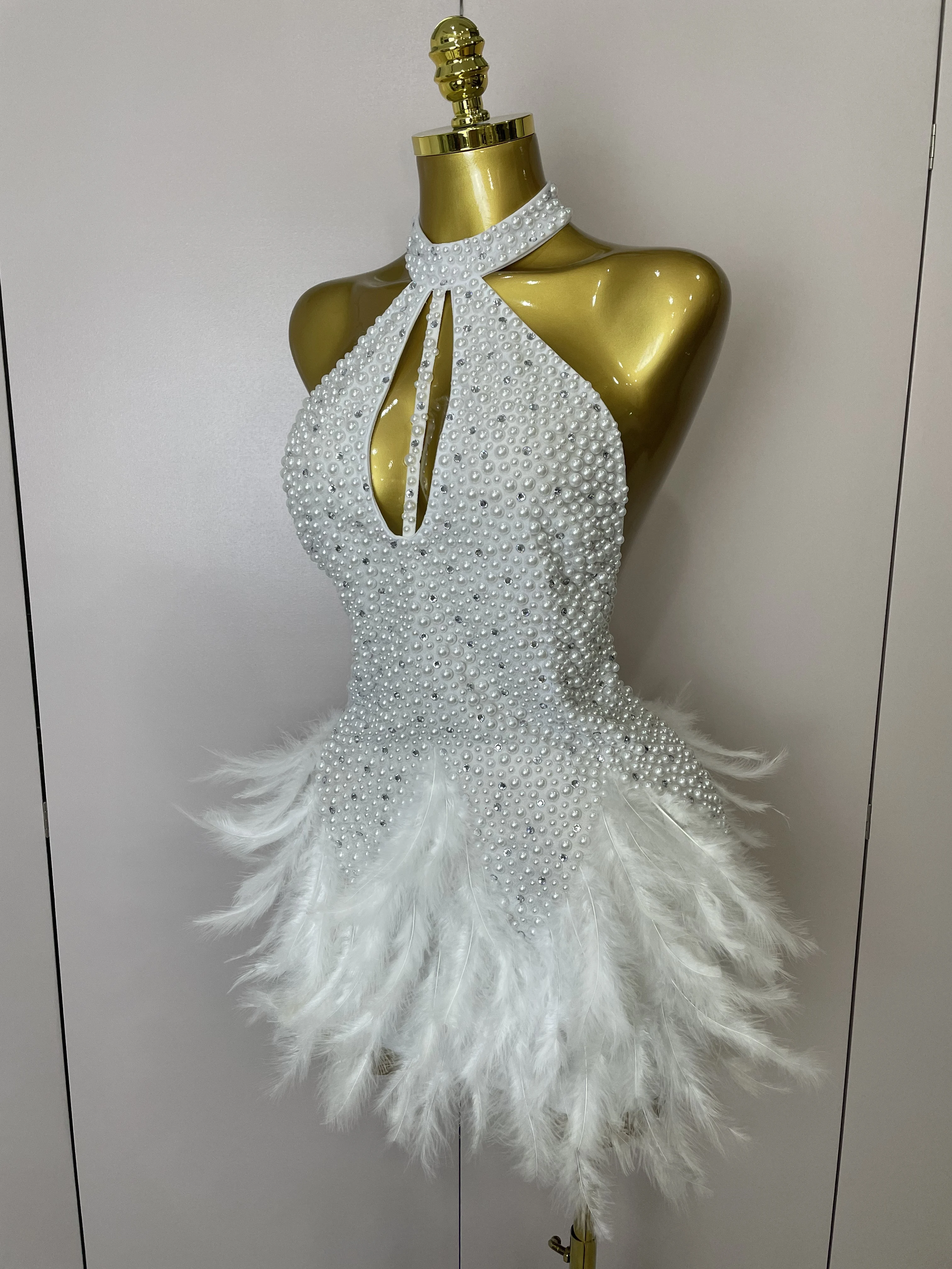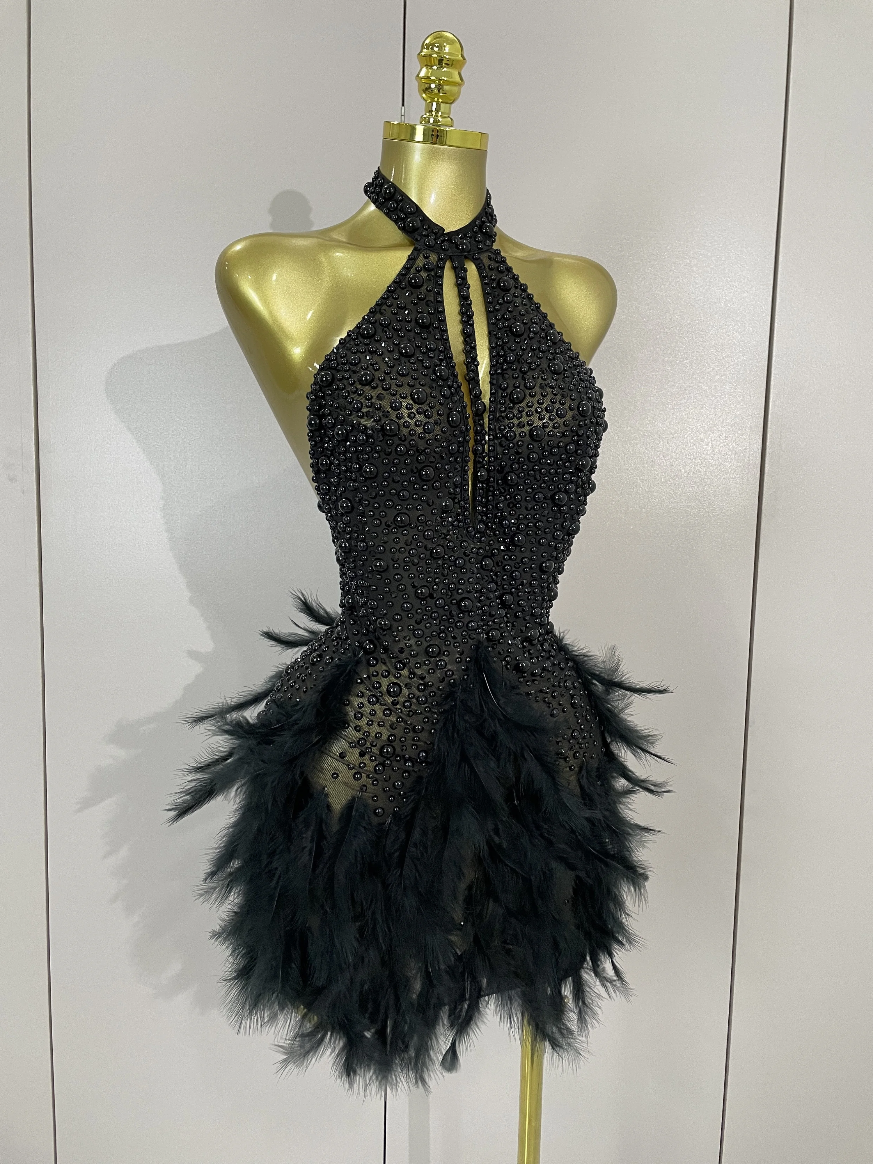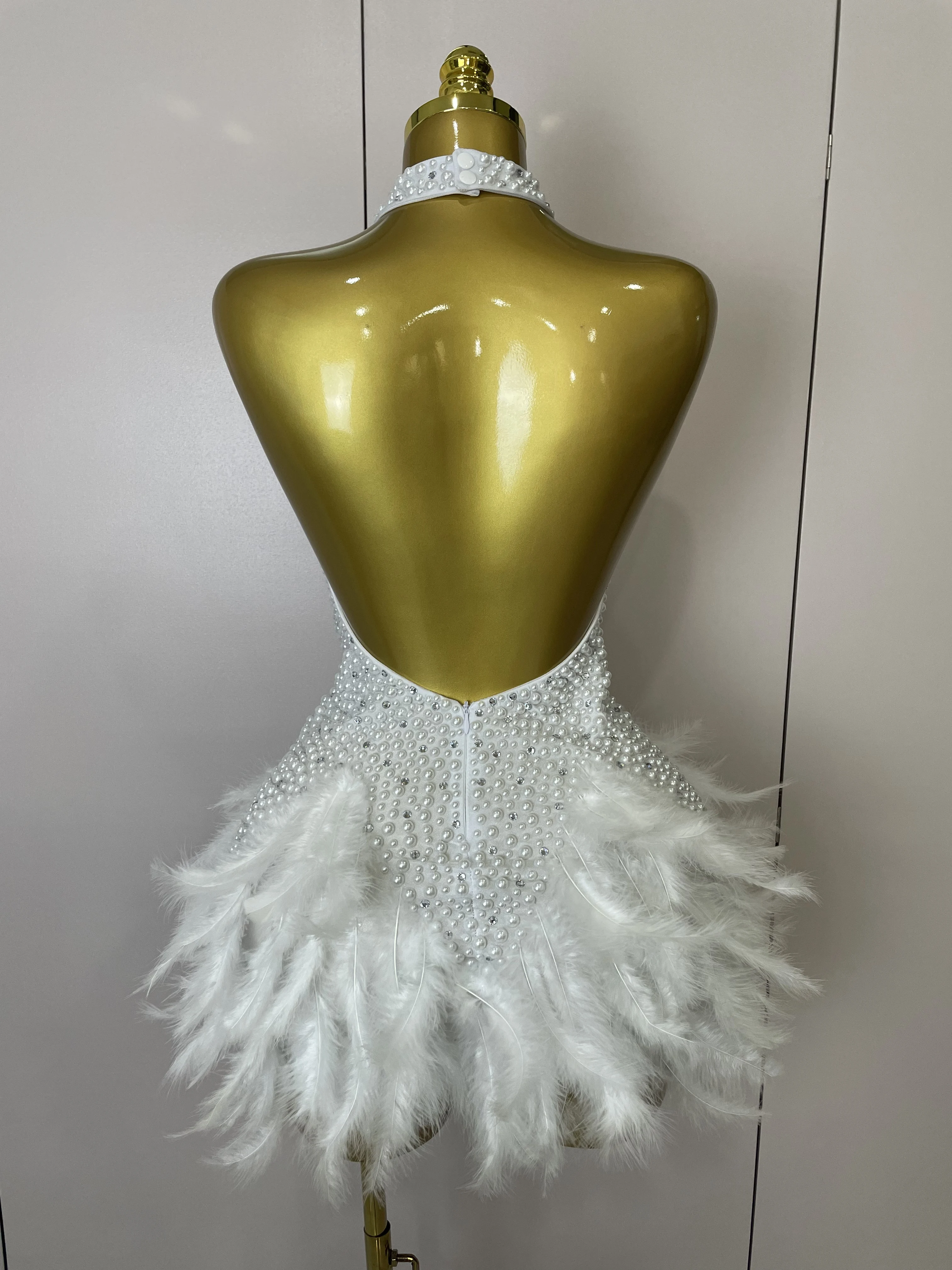 Abito corto da donna con strass di lusso, perle, piume, scollo all’americana, senza schienale, da donna, sexy, per festeggiare il compleanno, discoteca, costume di scena