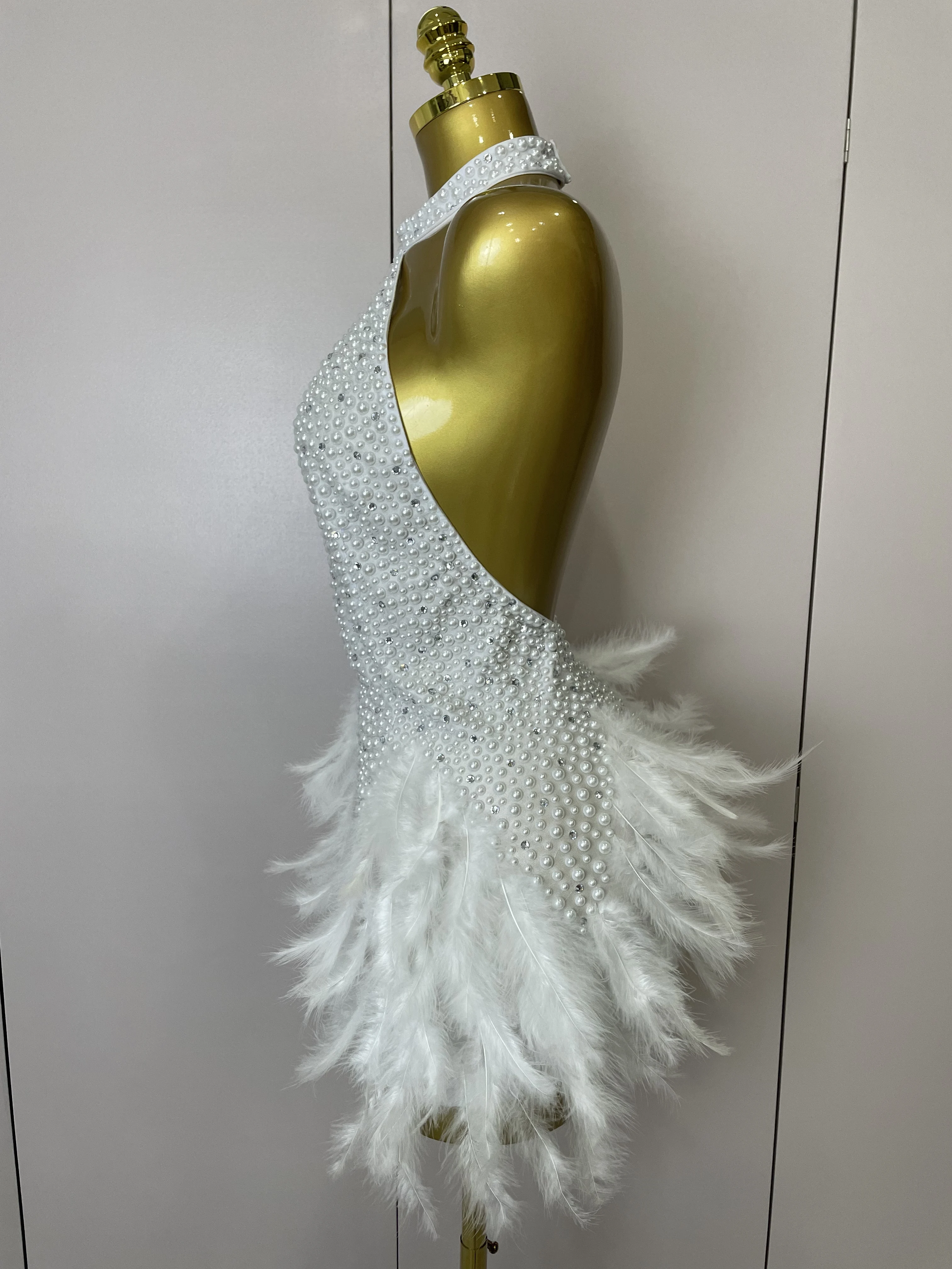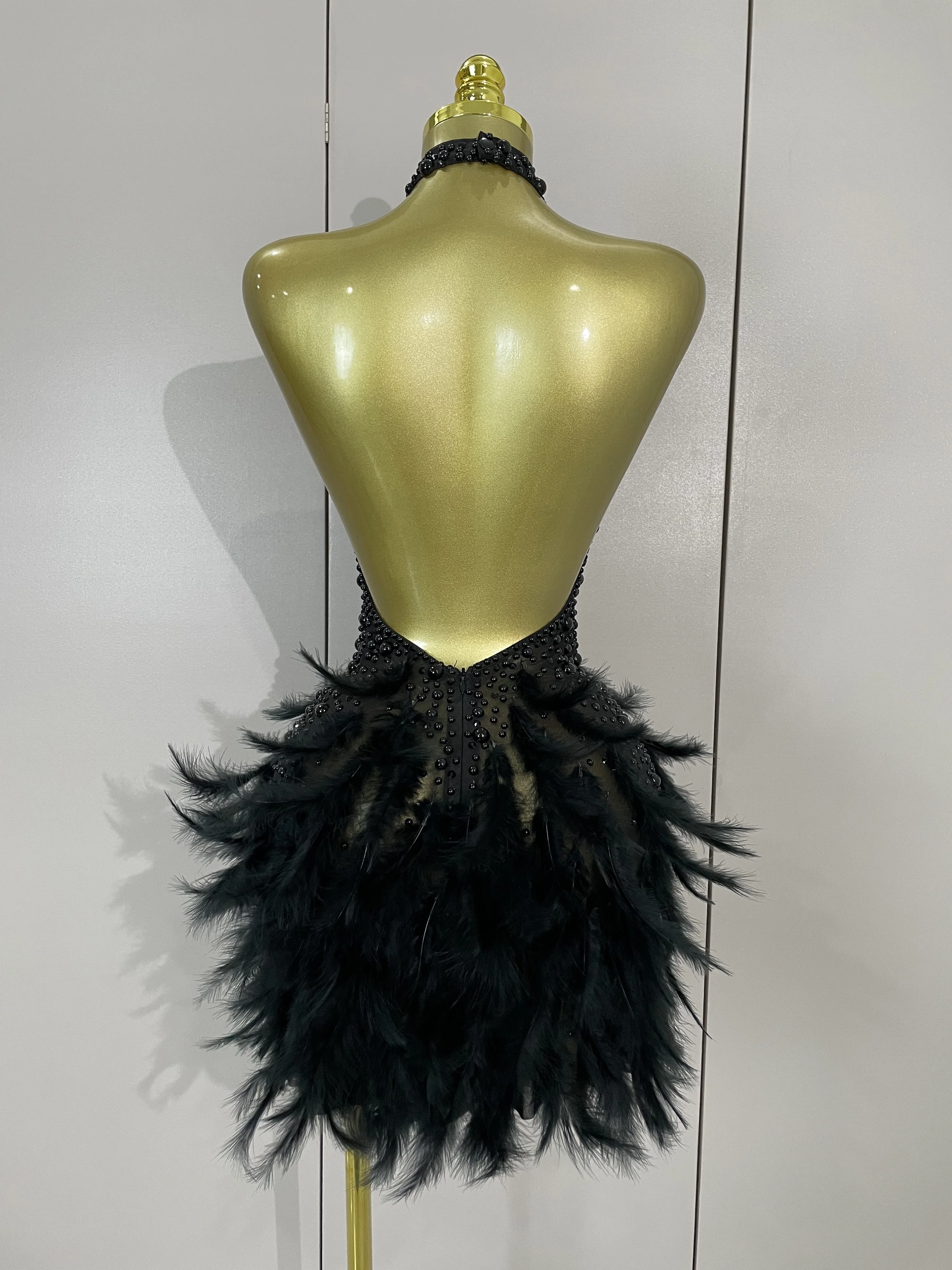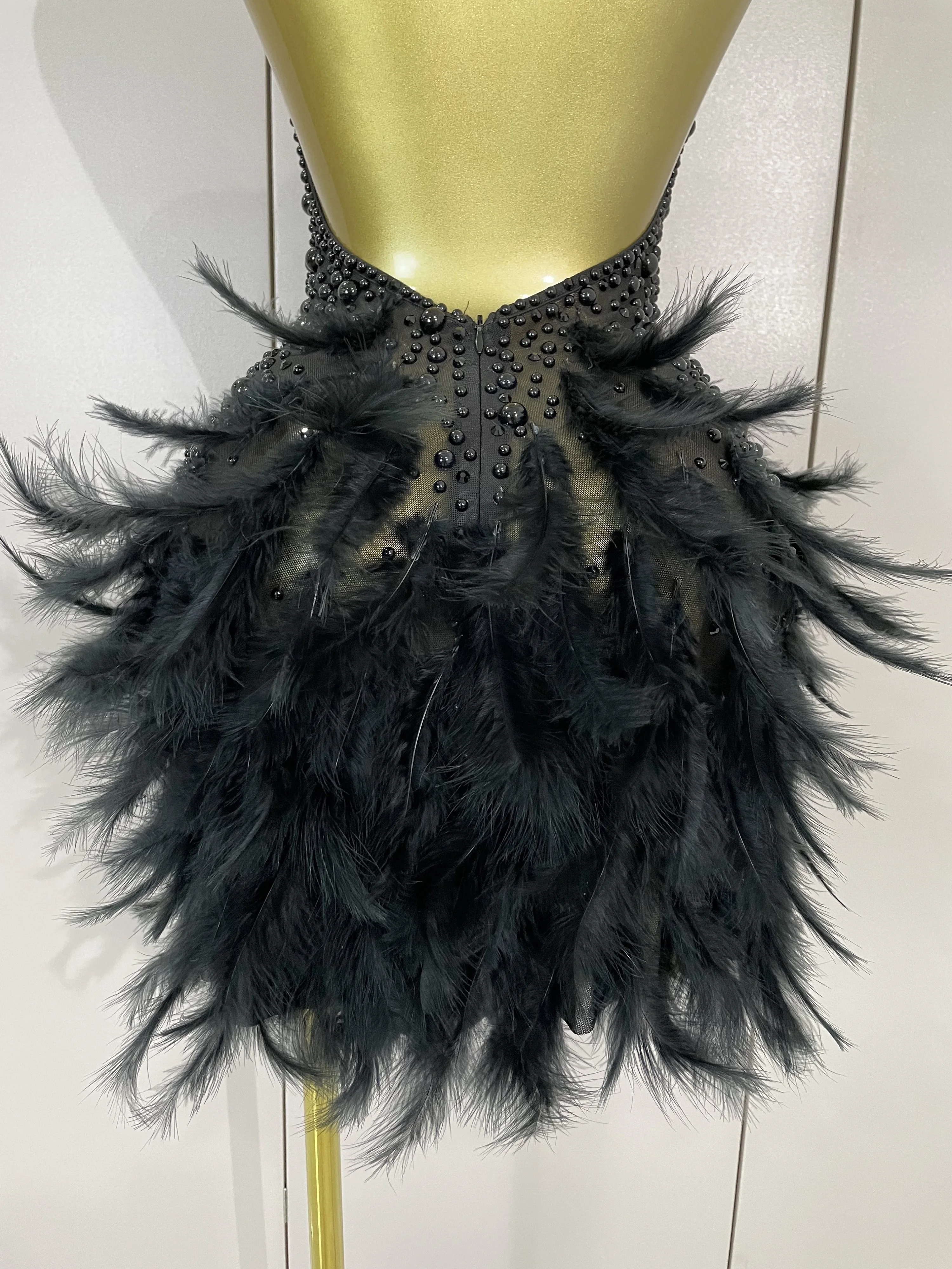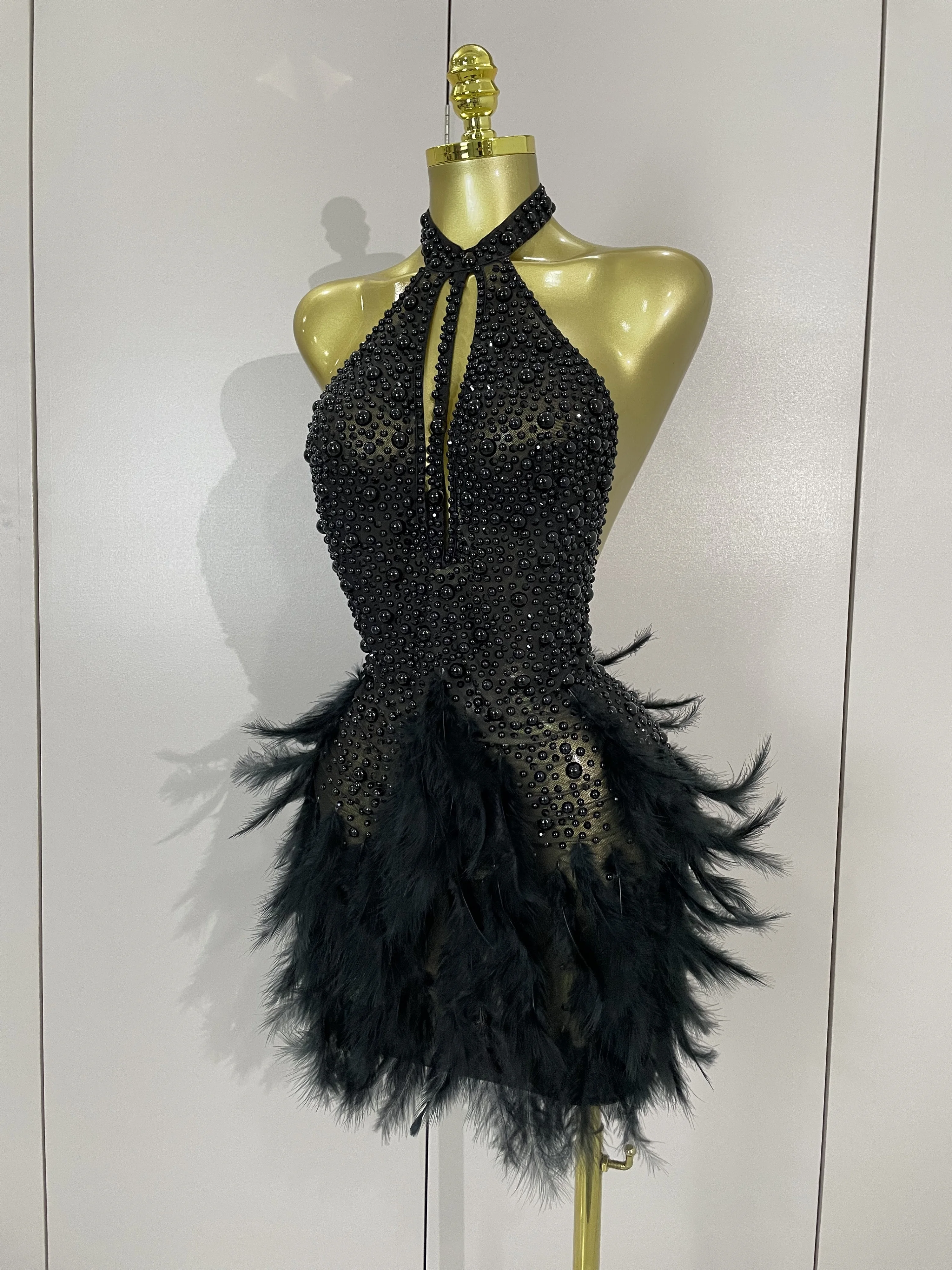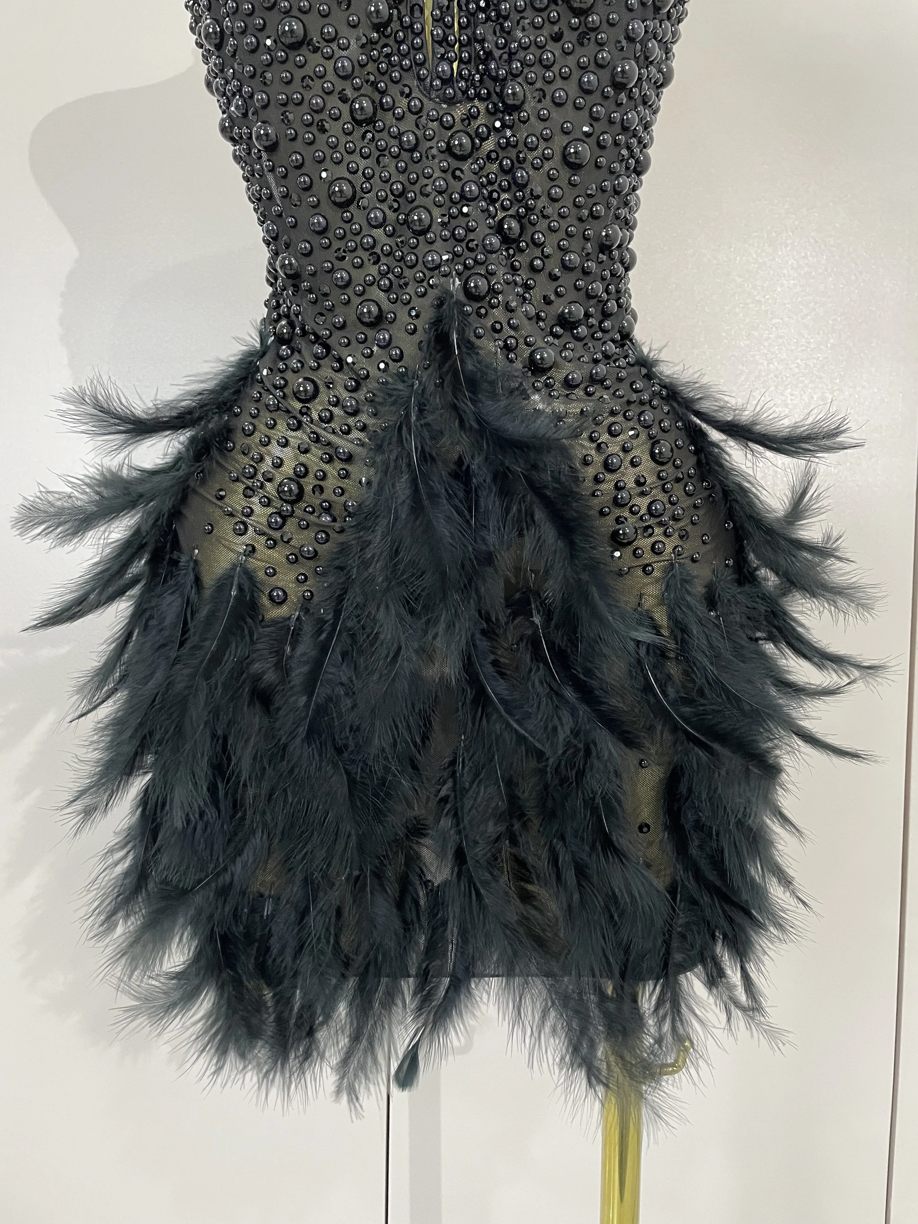 Abito corto da donna con strass di lusso, perle, piume, scollo all’americana, senza schienale, da donna, sexy, per festeggiare il compleanno, discoteca, costume di scena