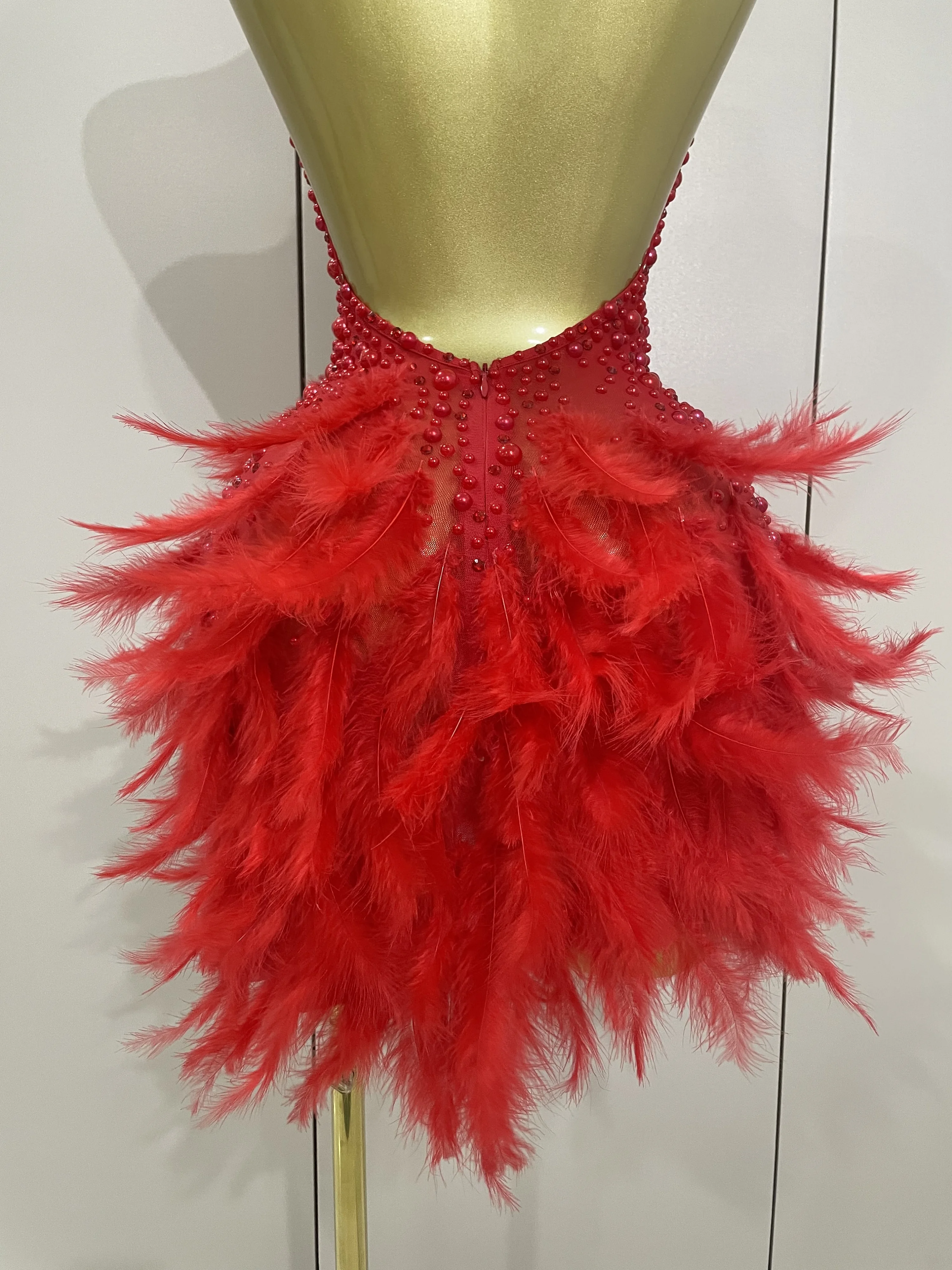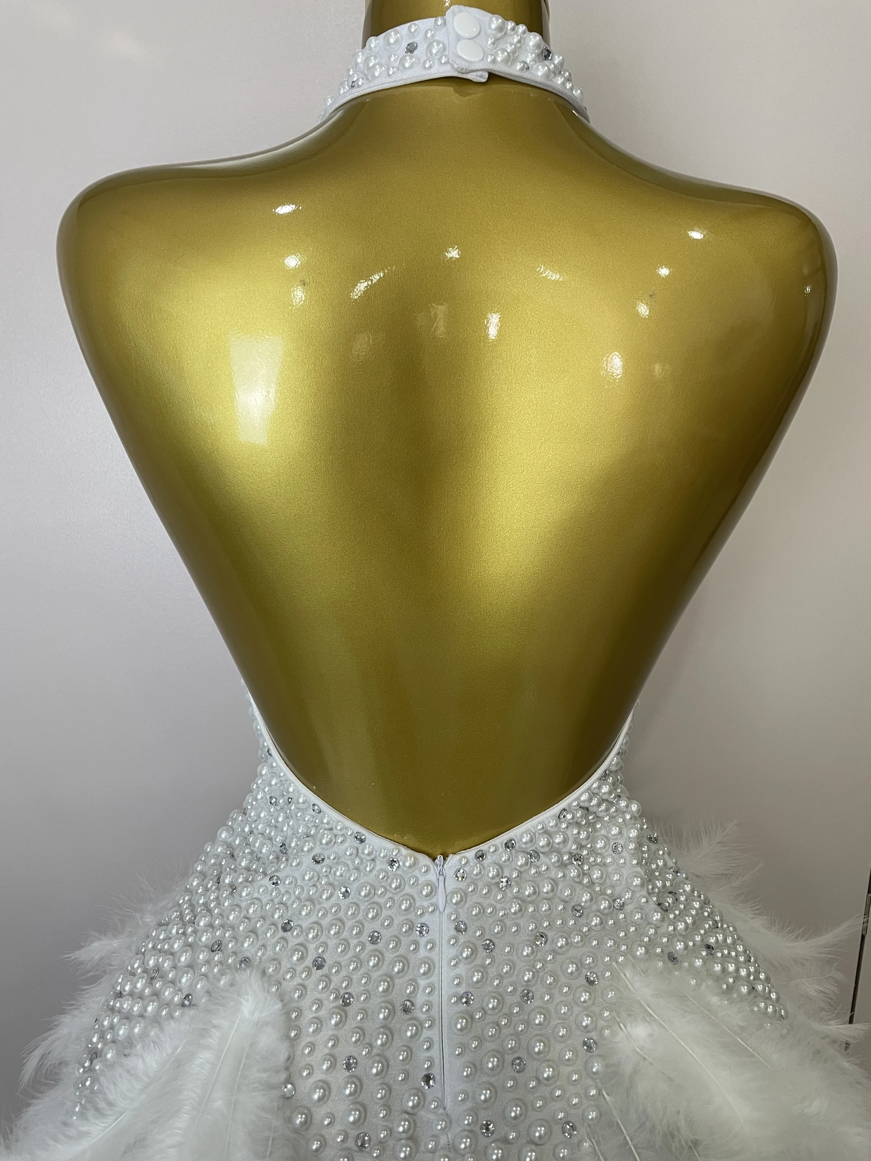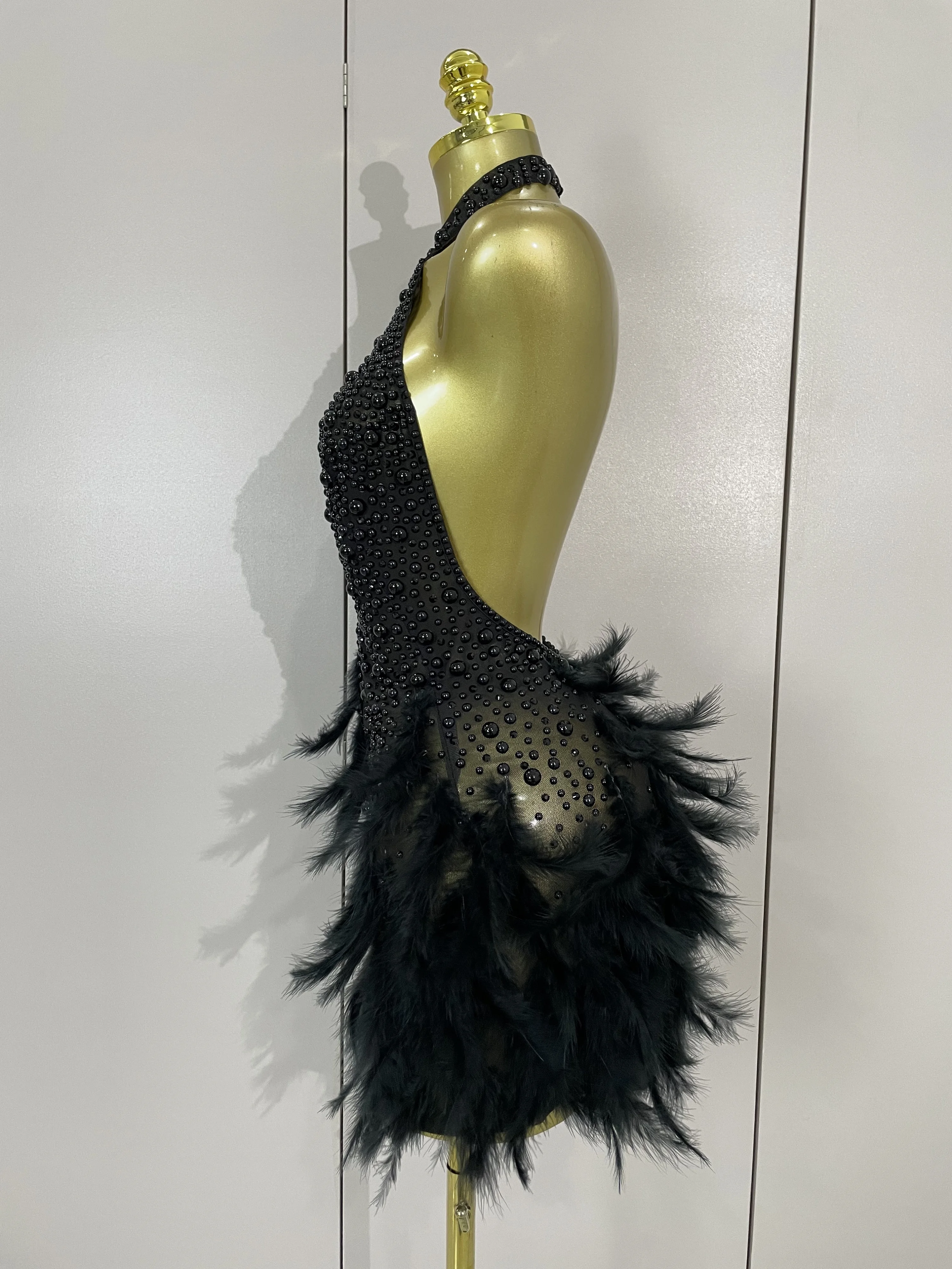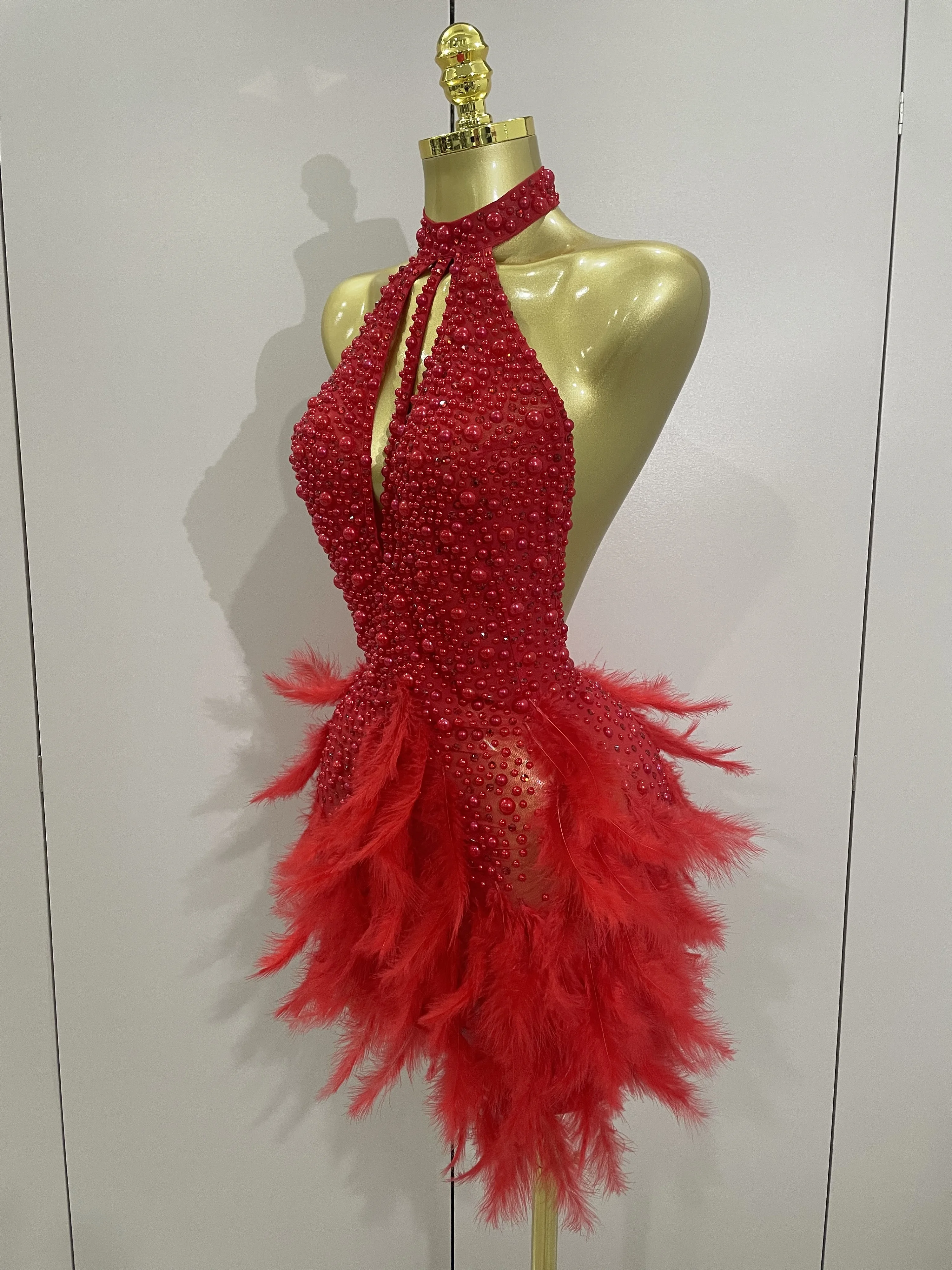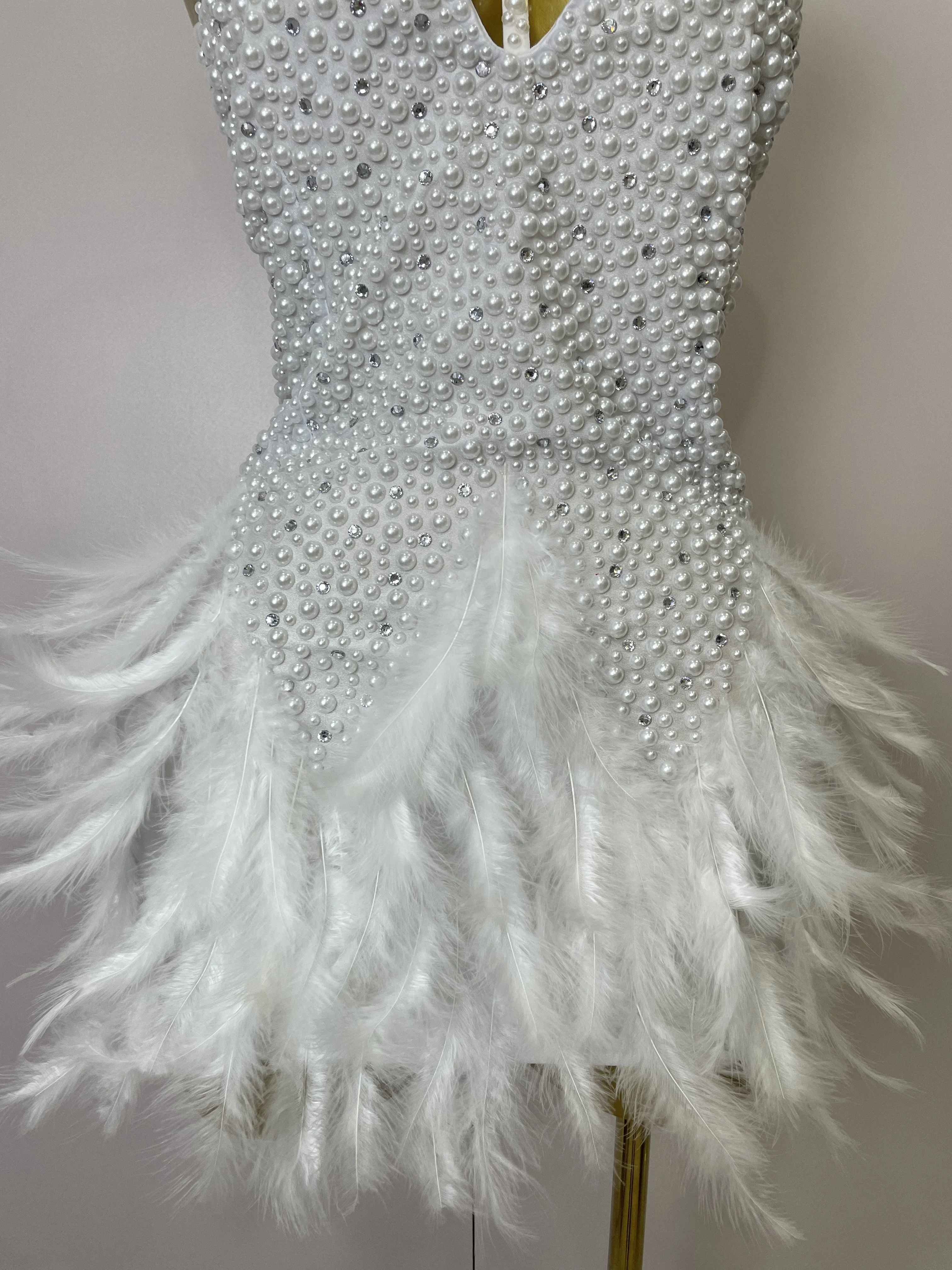 Abito corto da donna con strass di lusso, perle, piume, scollo all’americana, senza schienale, da donna, sexy, per festeggiare il compleanno, discoteca, costume di scena