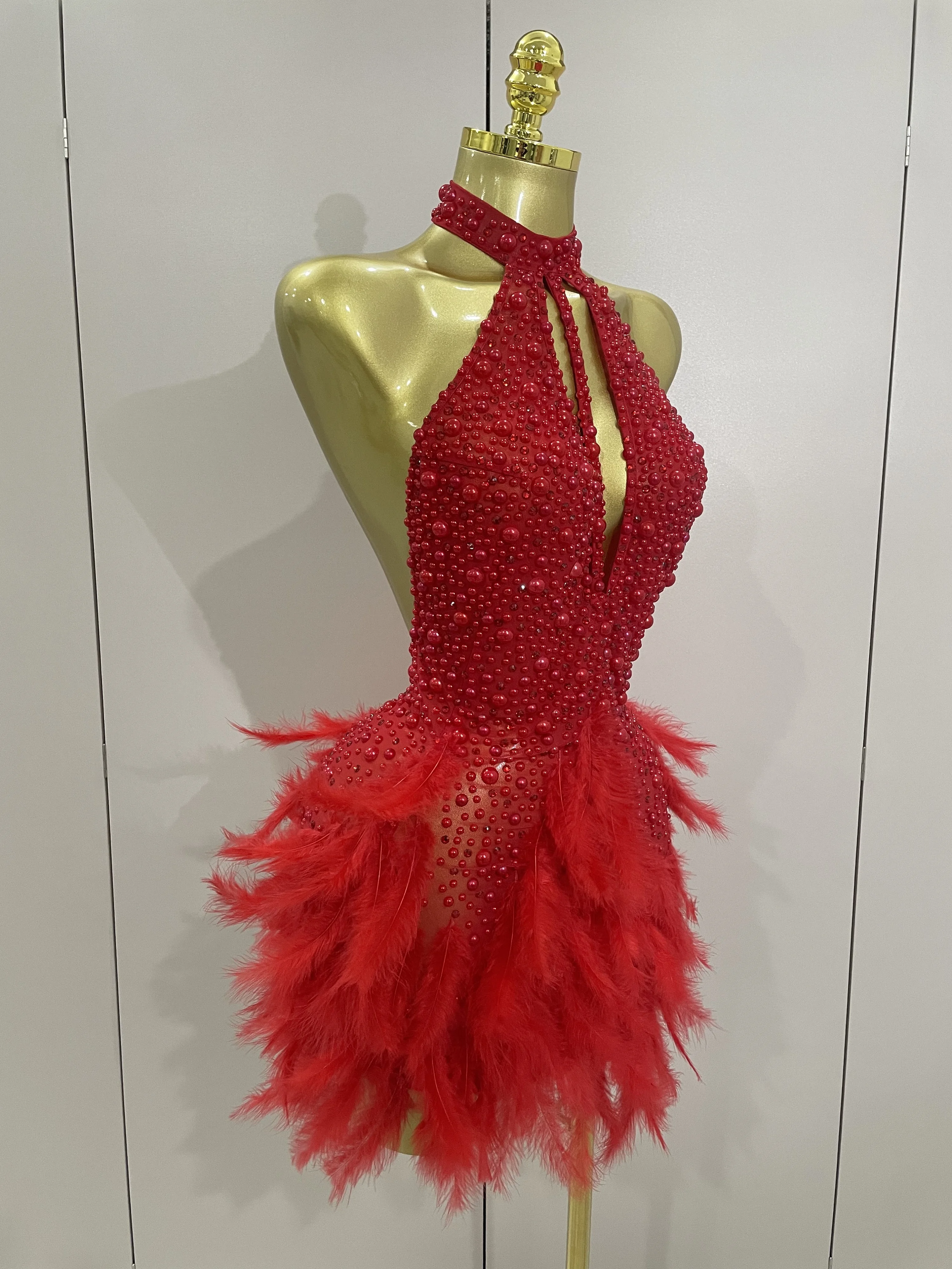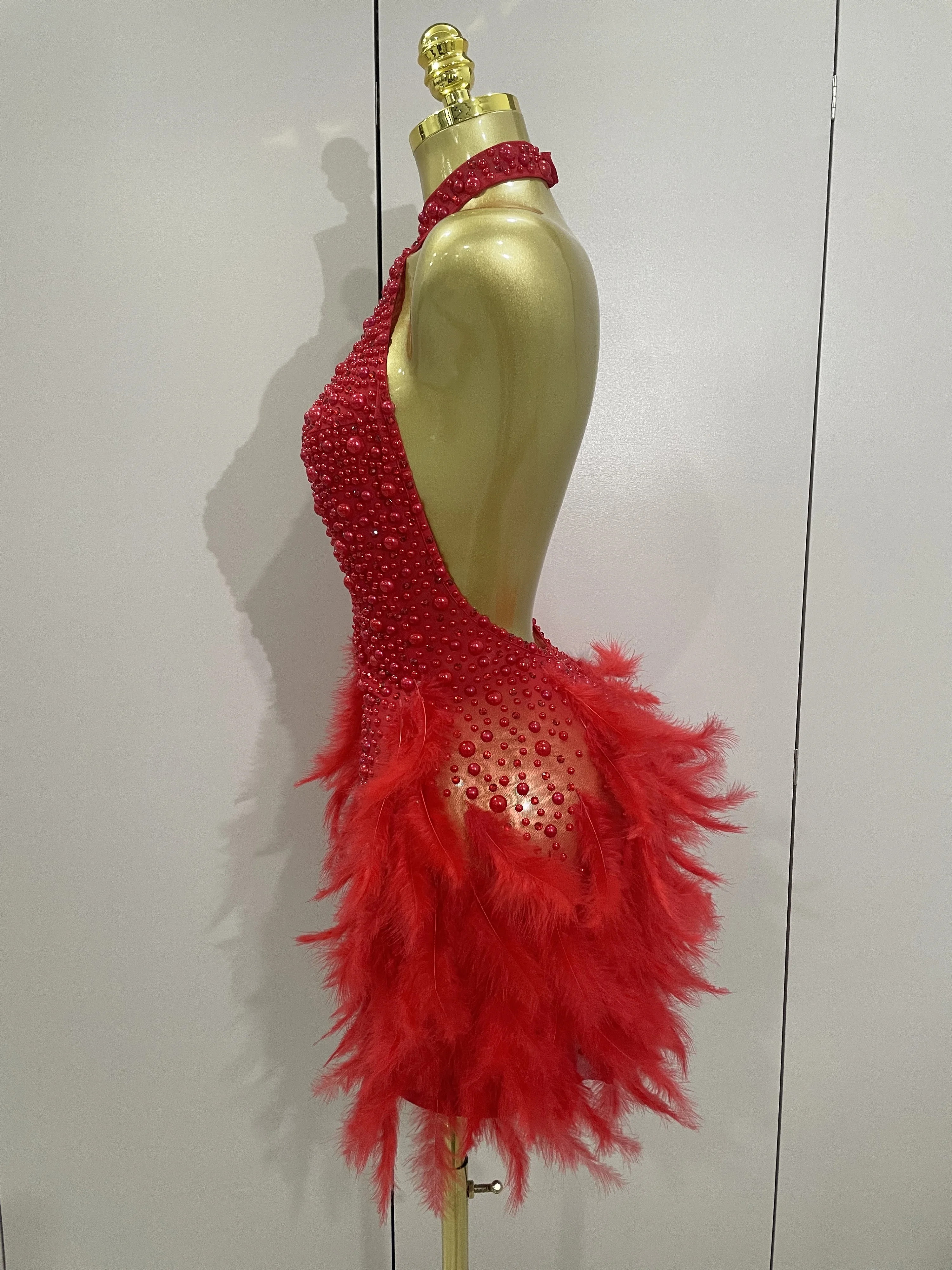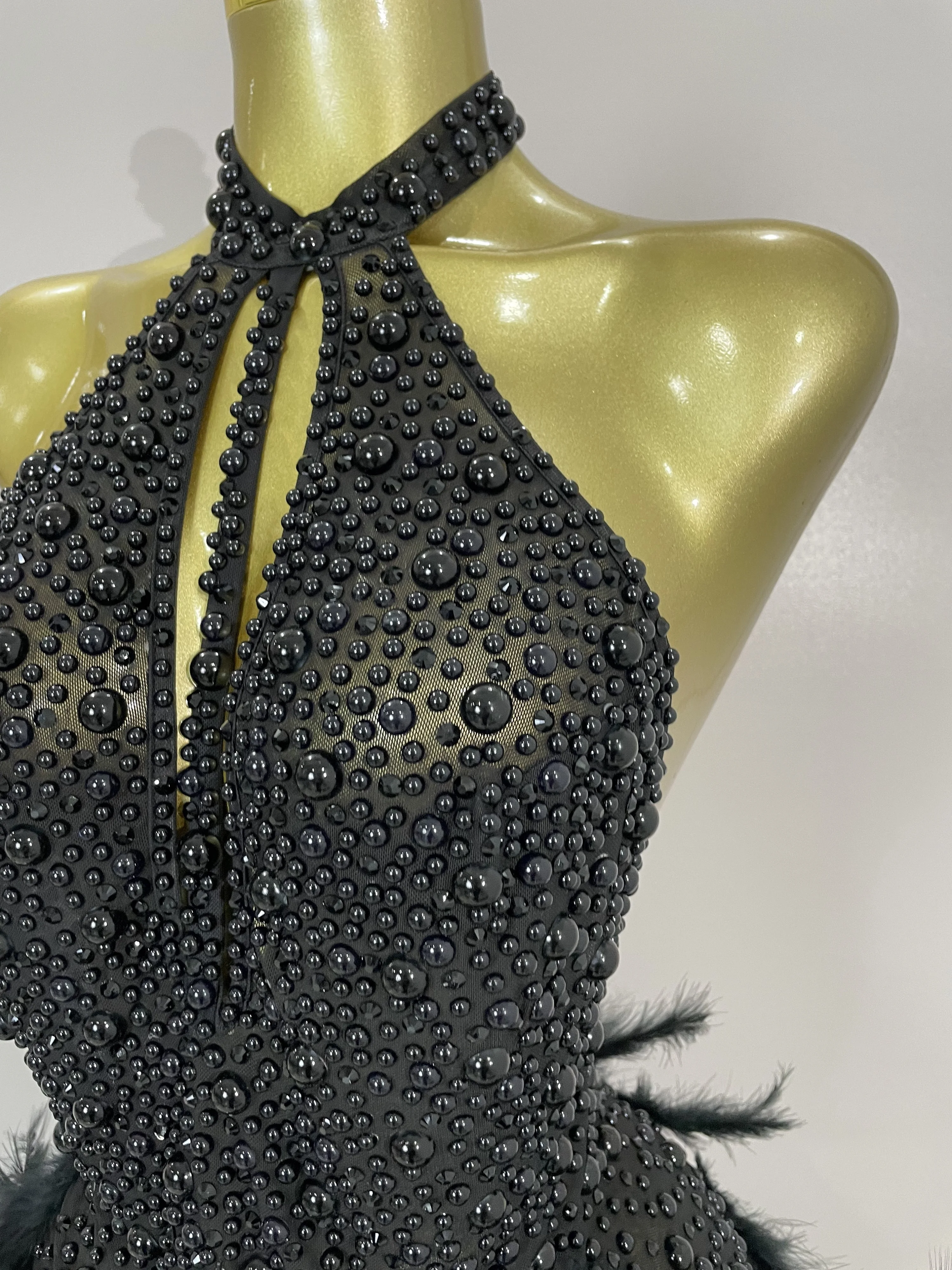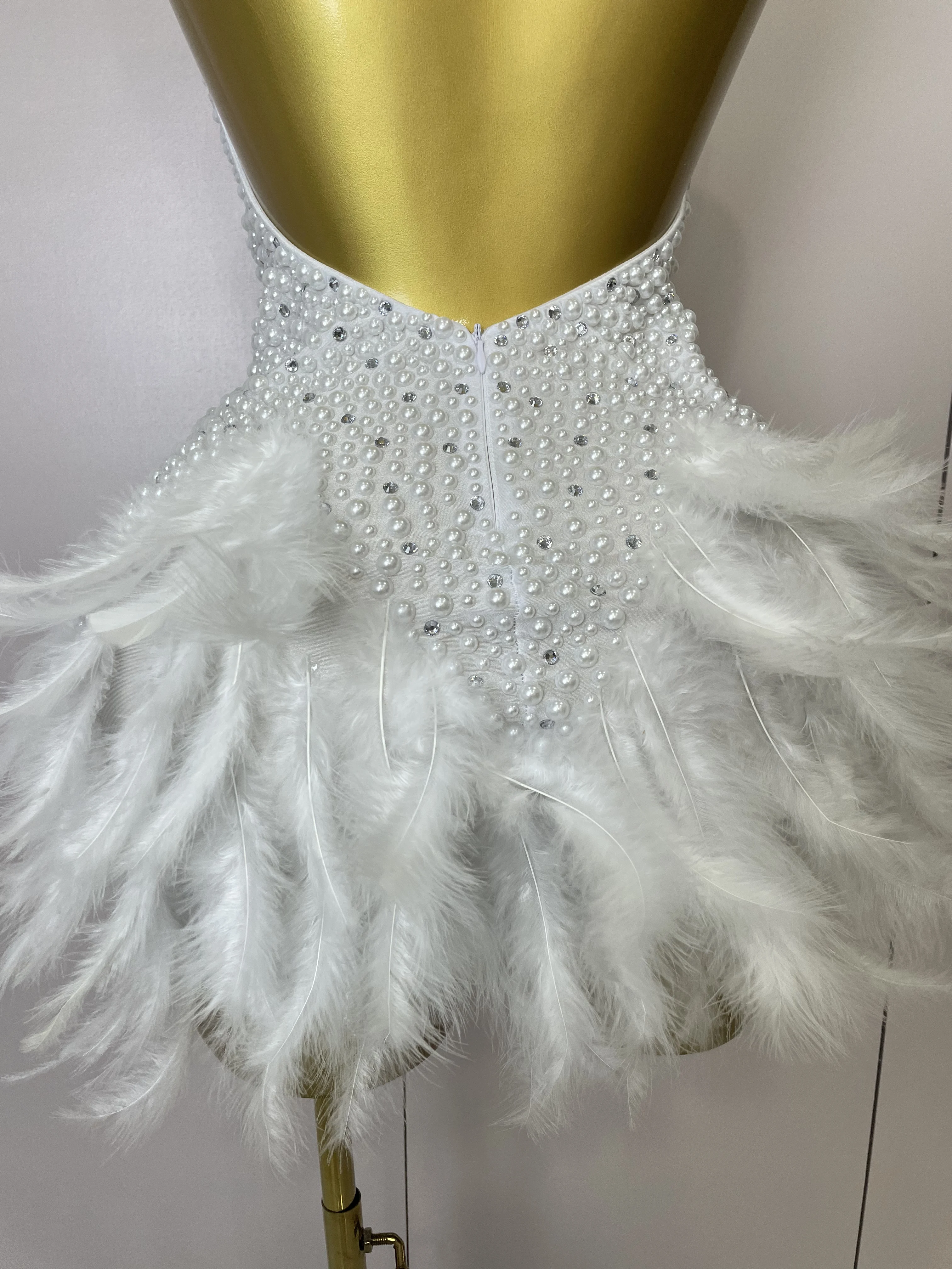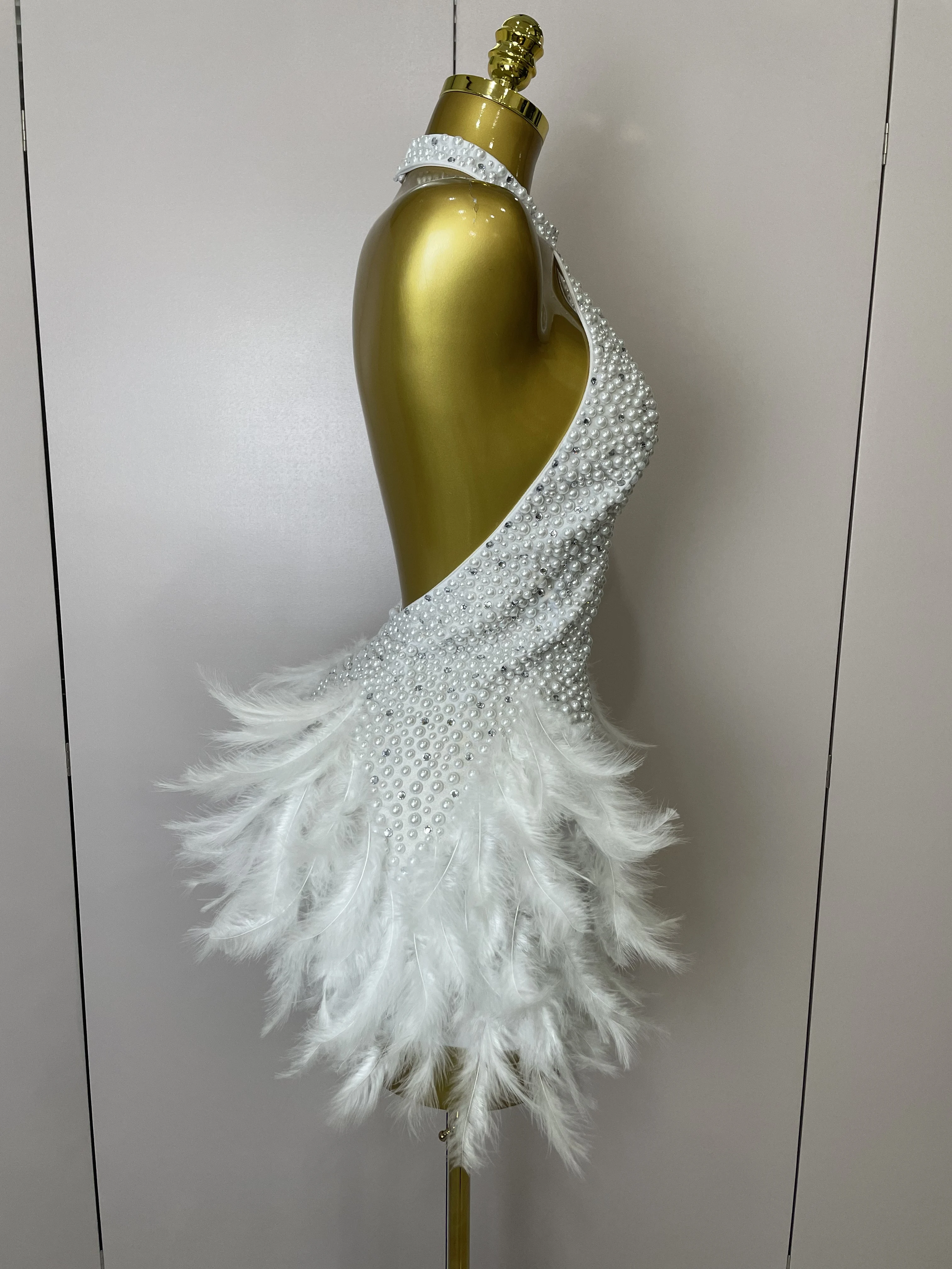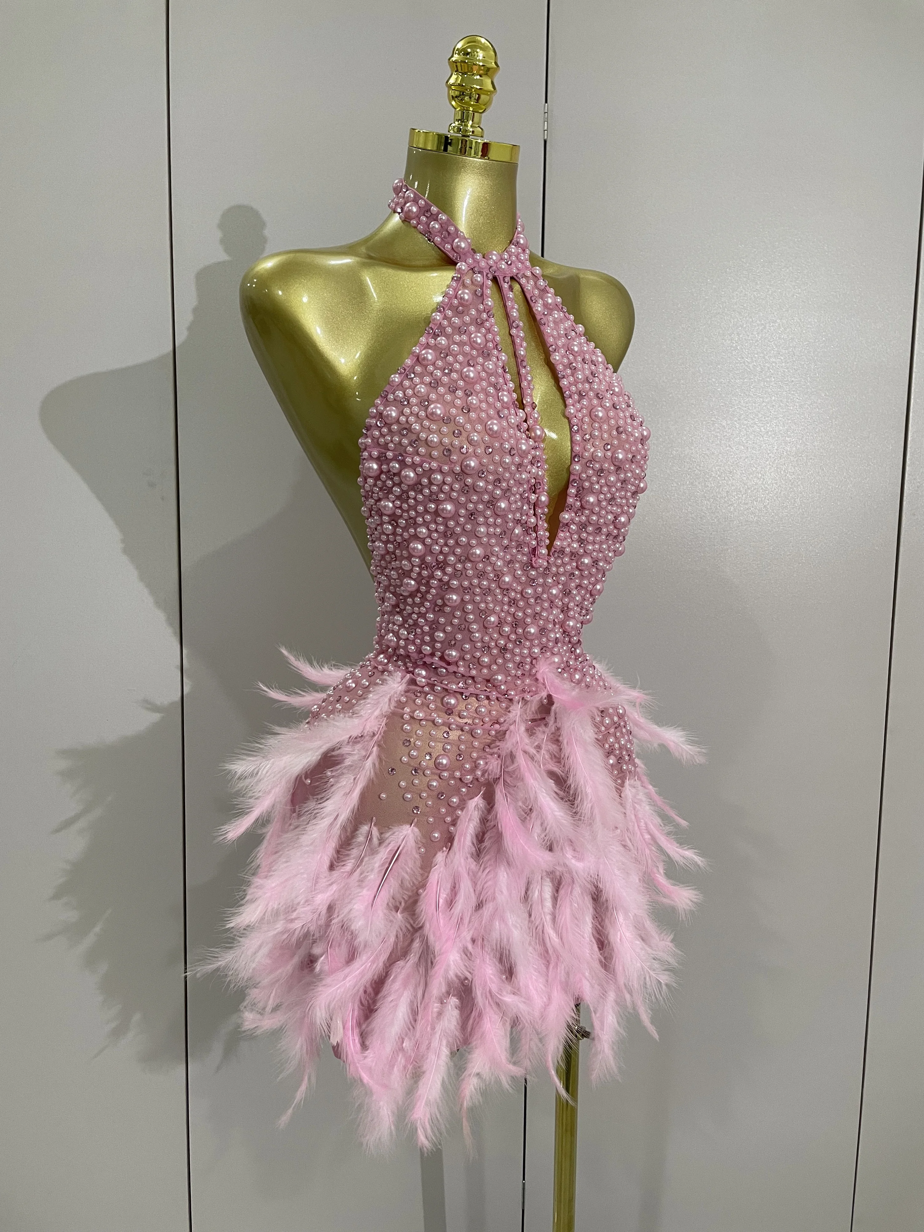 Abito corto da donna con strass di lusso, perle, piume, scollo all’americana, senza schienale, da donna, sexy, per festeggiare il compleanno, discoteca, costume di scena