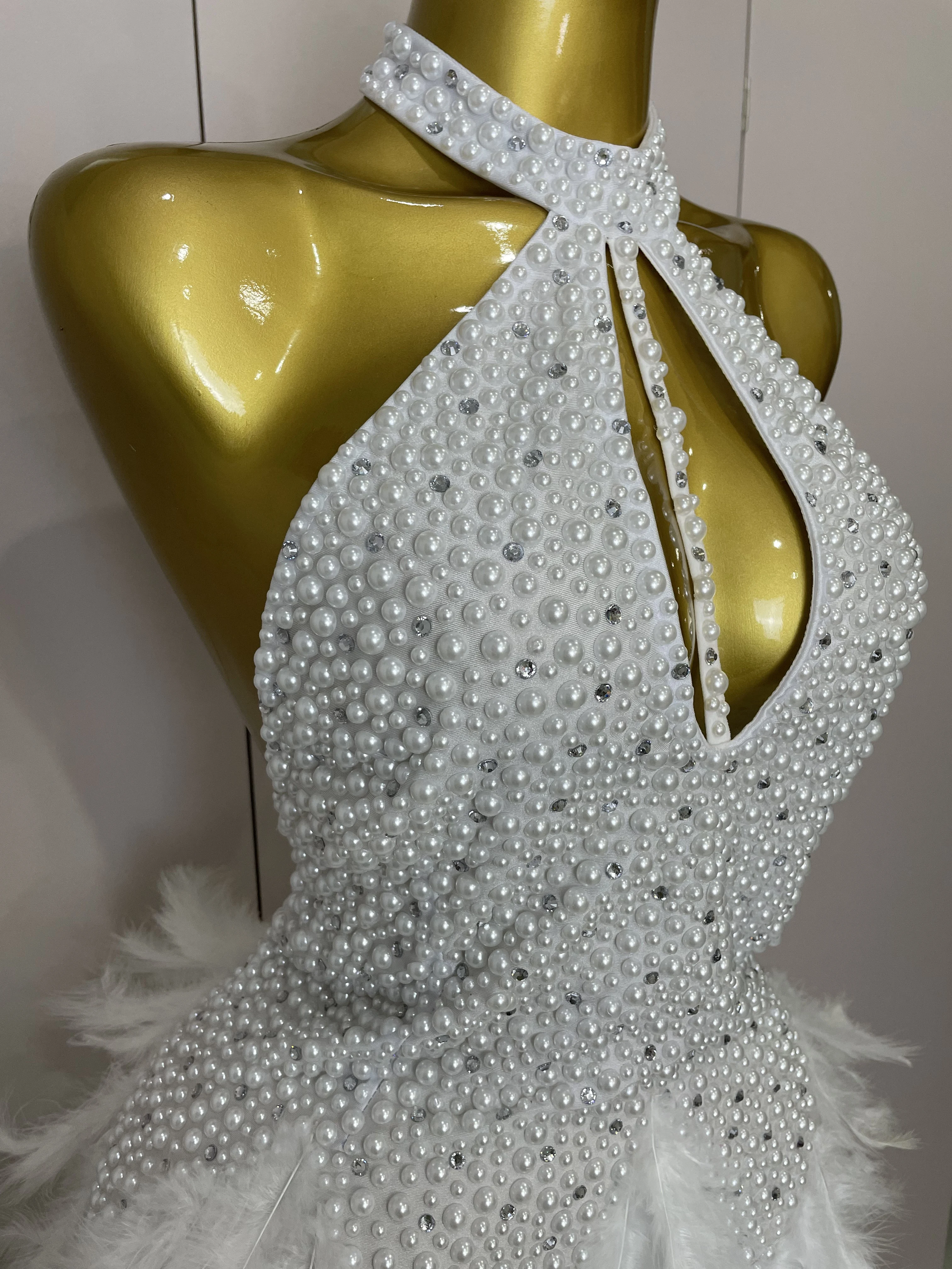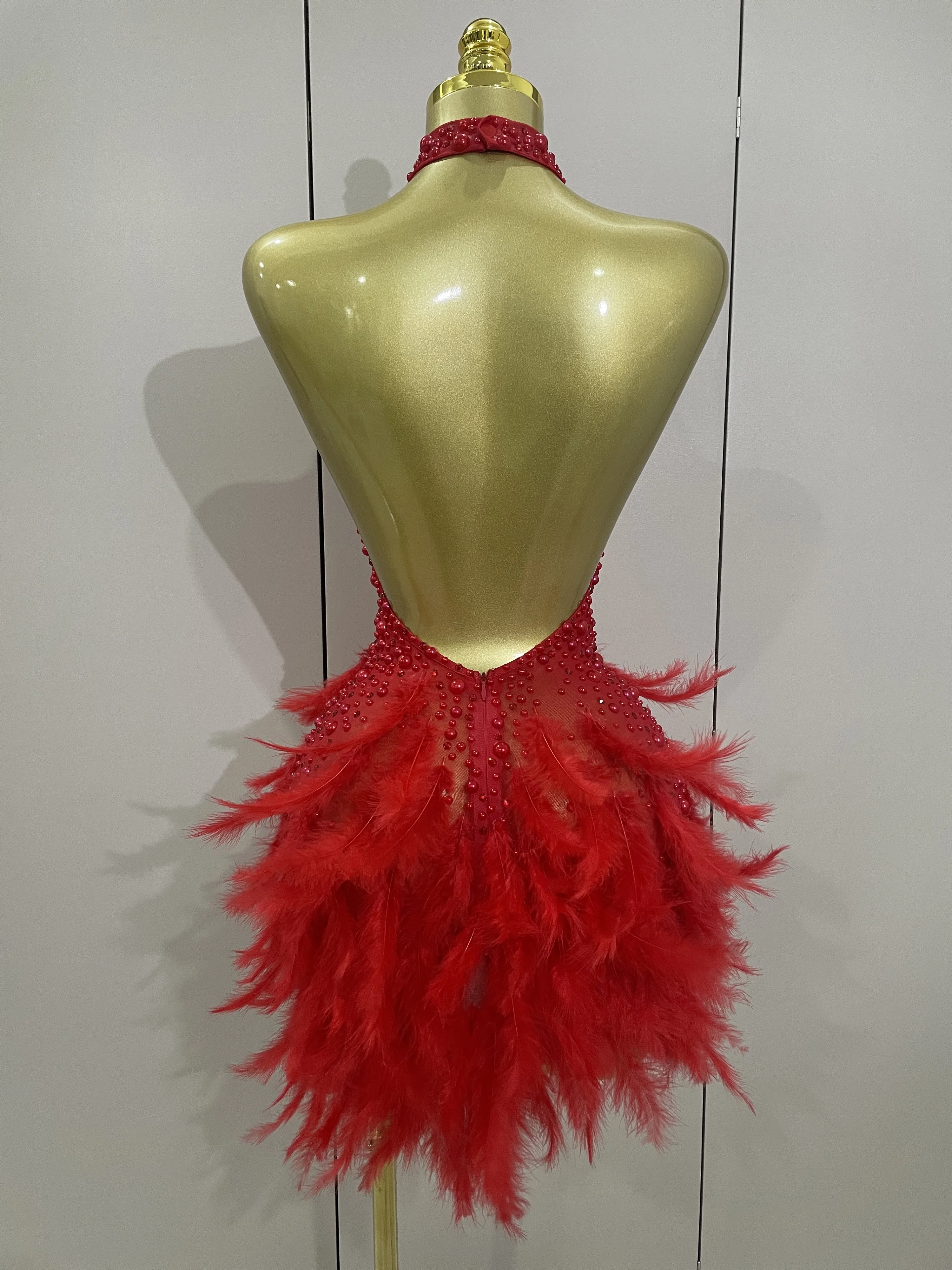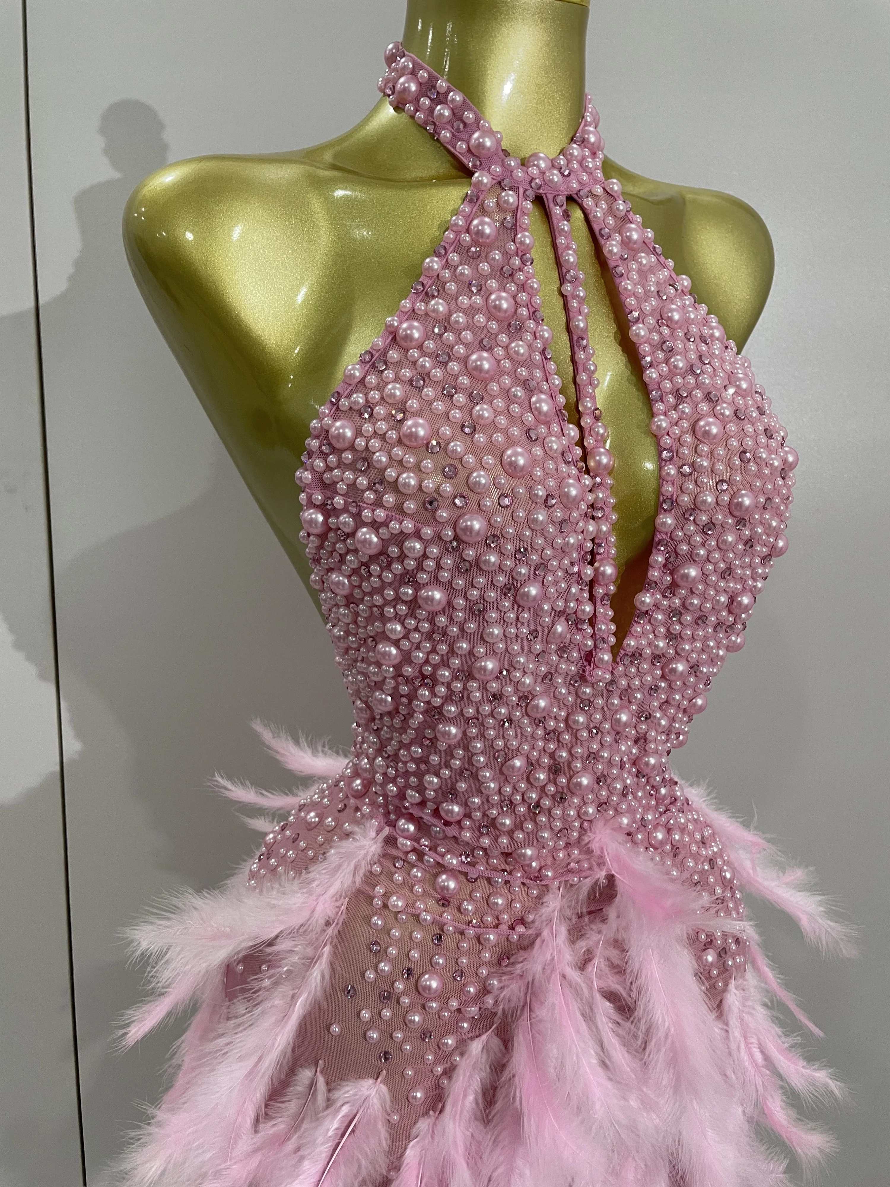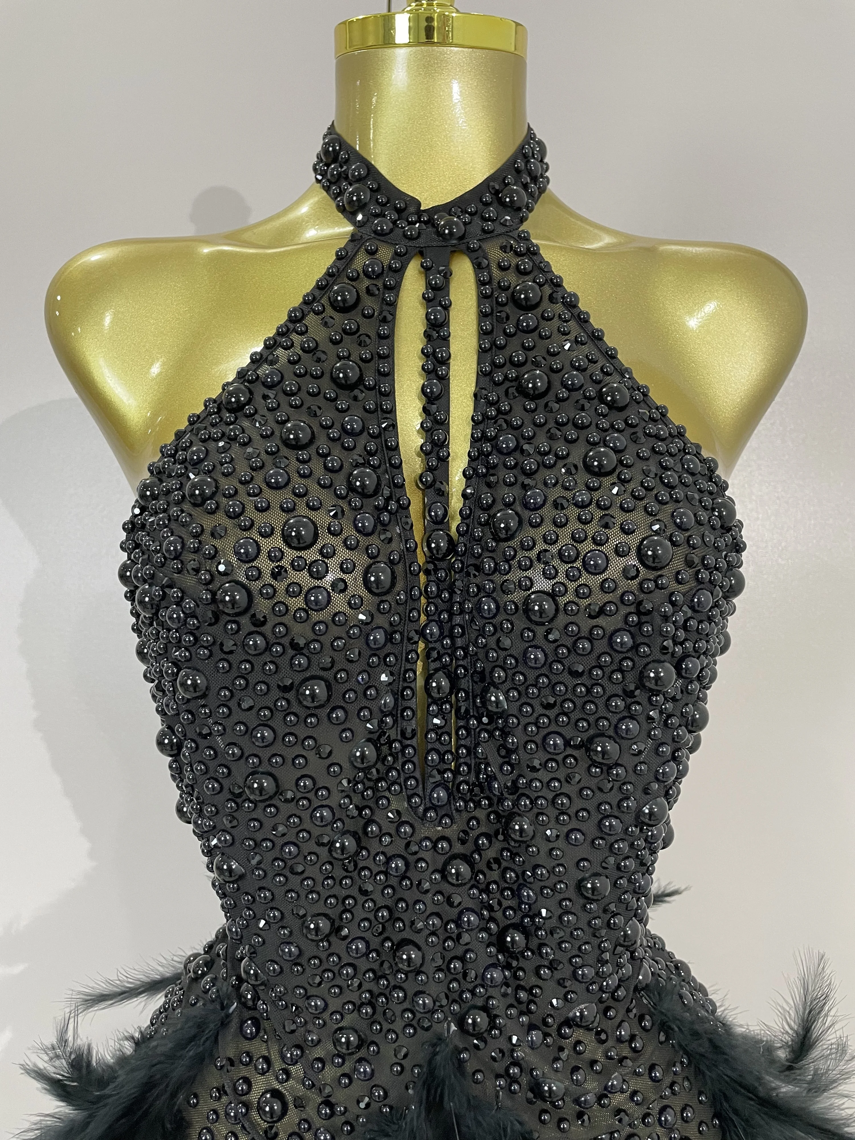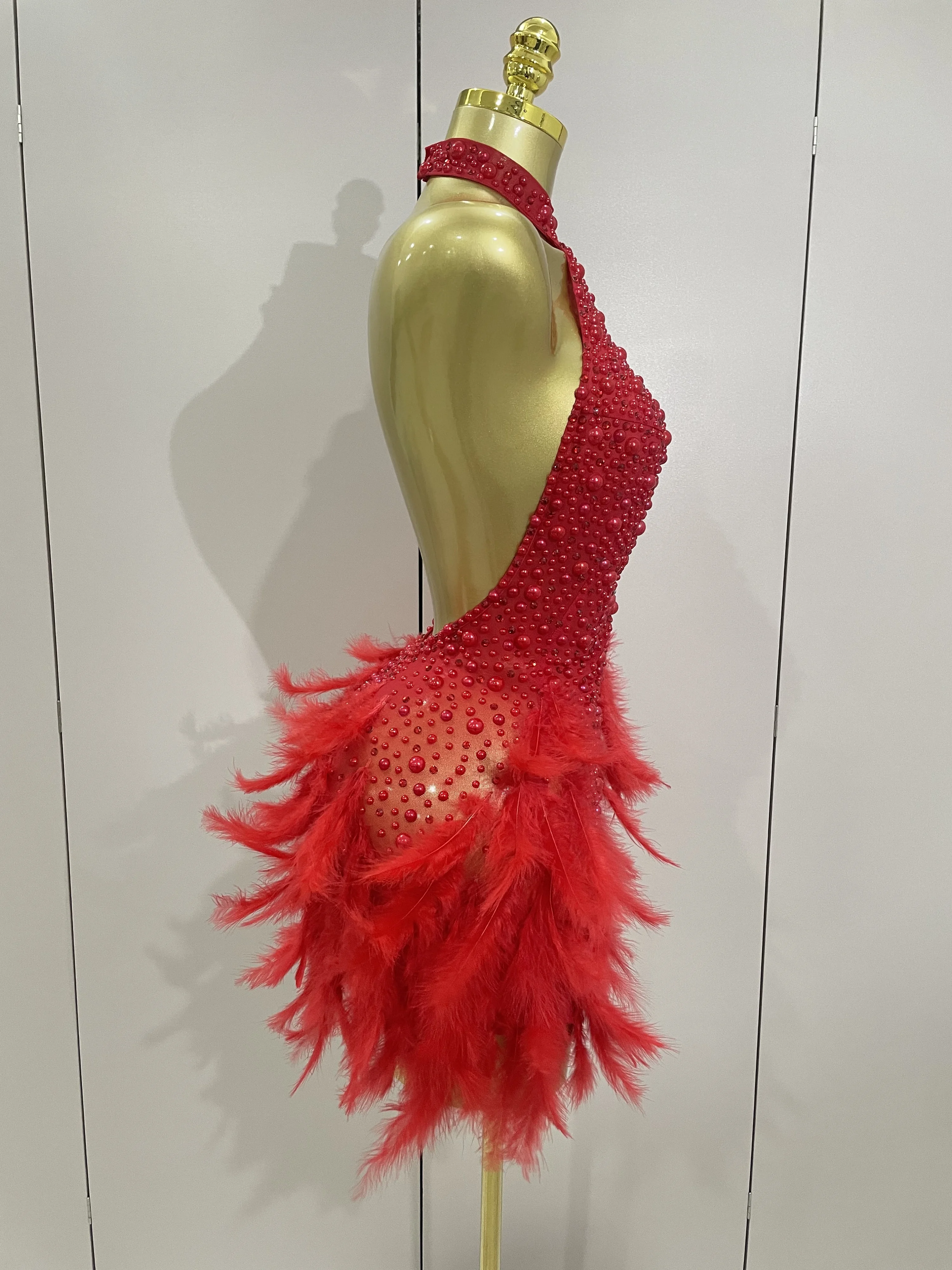 Abito corto da donna con strass di lusso, perle, piume, scollo all’americana, senza schienale, da donna, sexy, per festeggiare il compleanno, discoteca, costume di scena