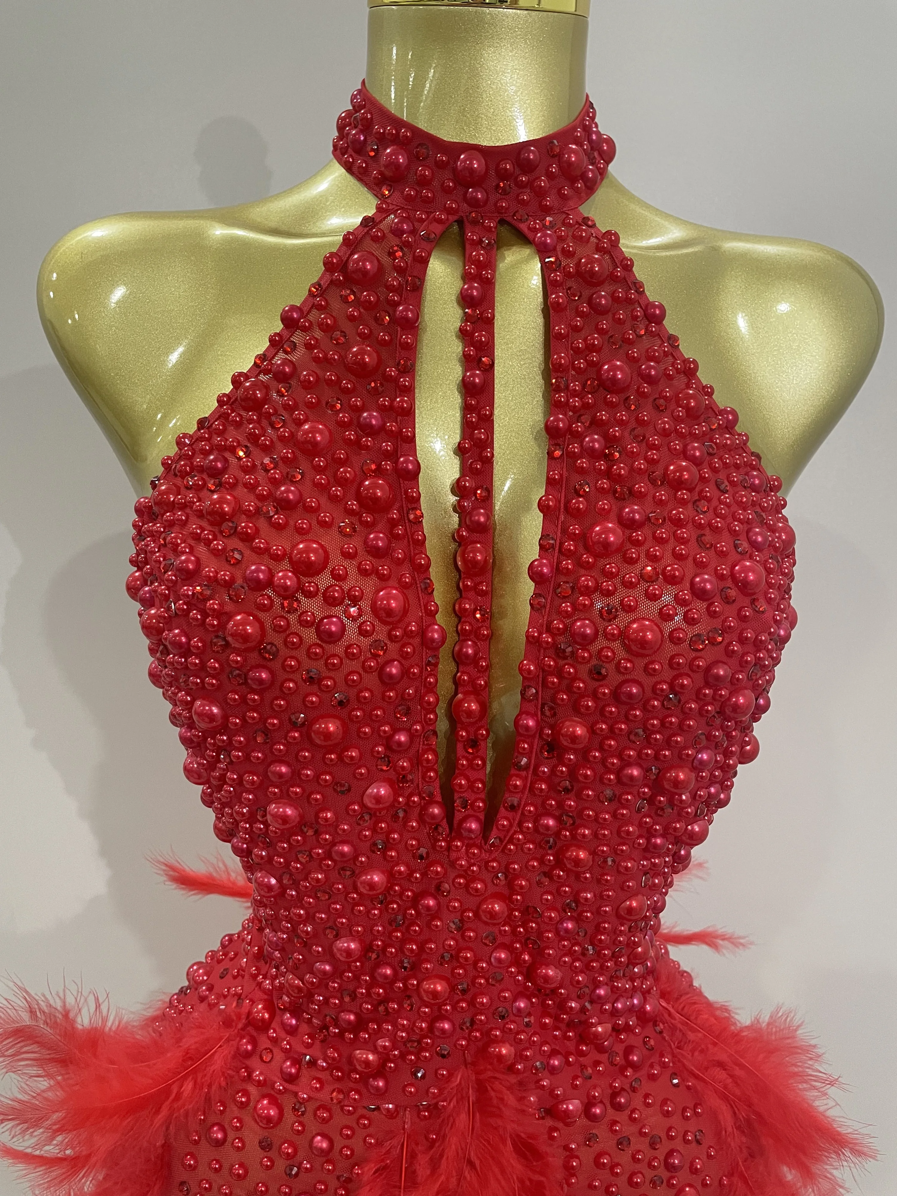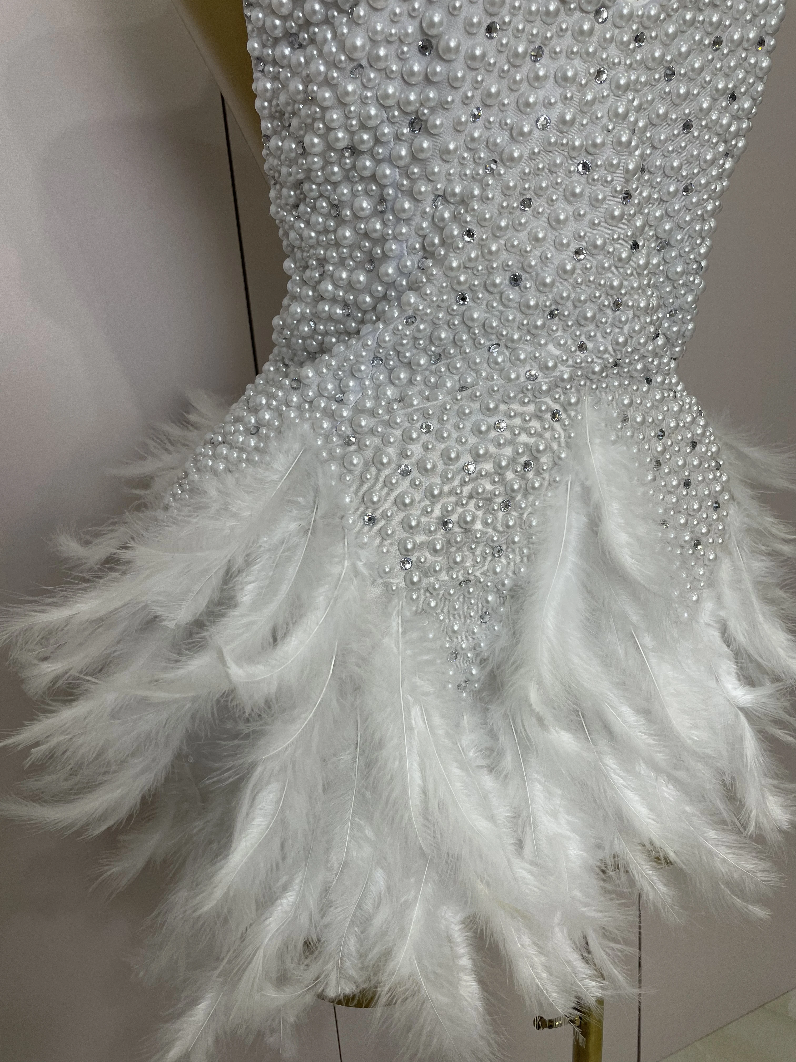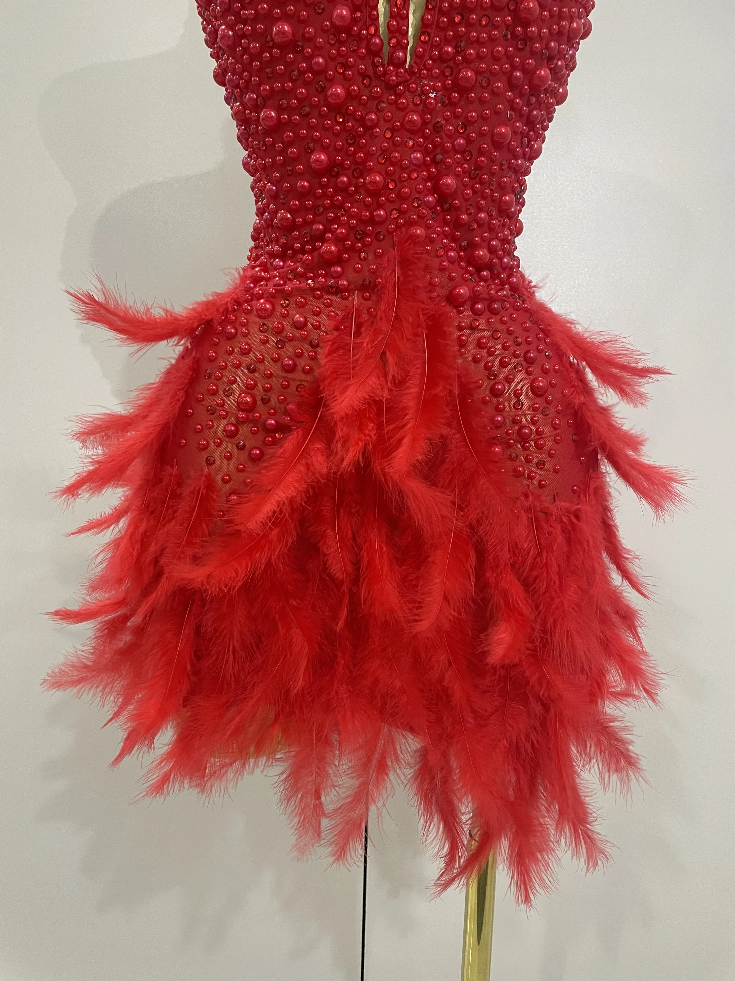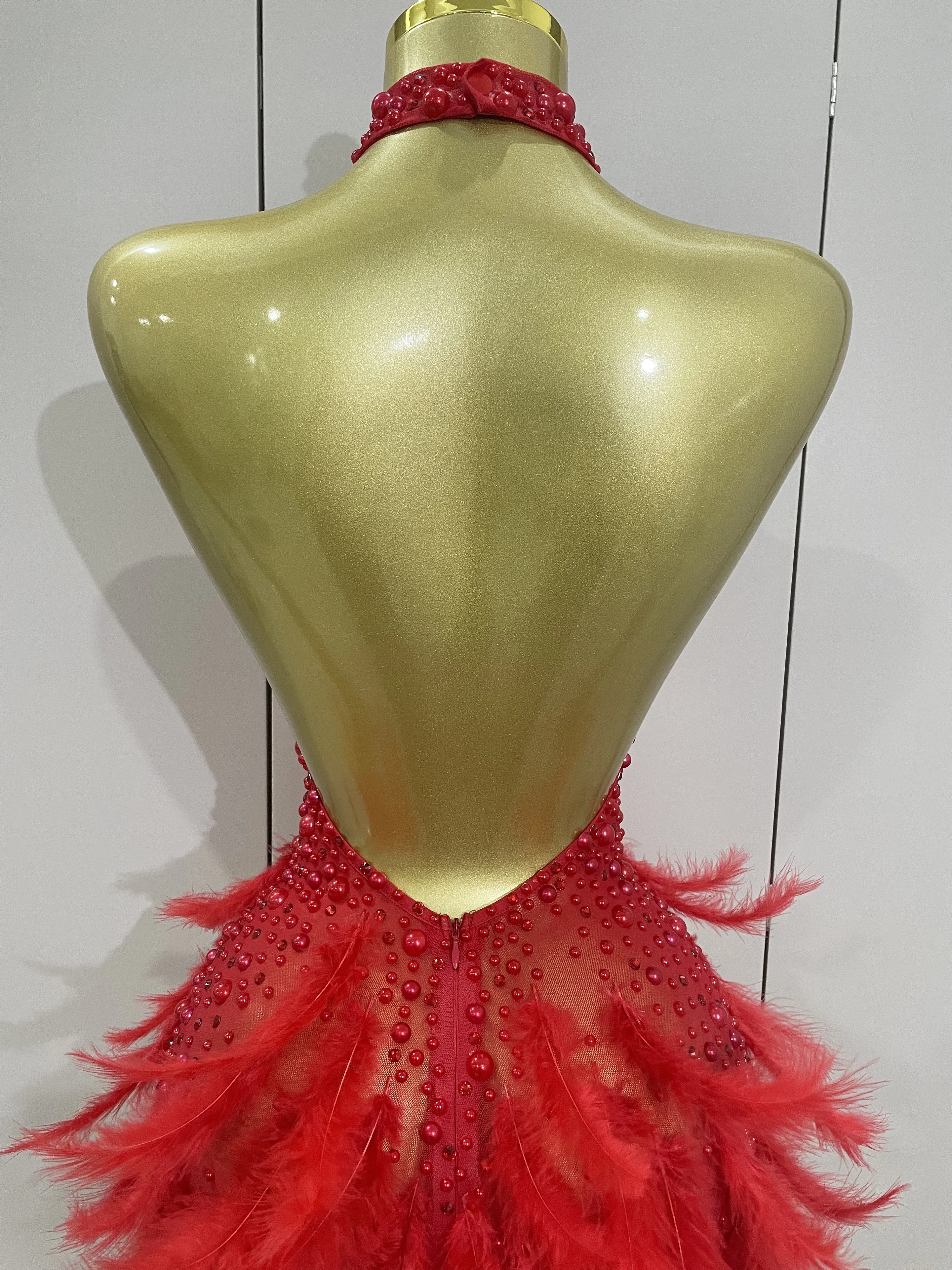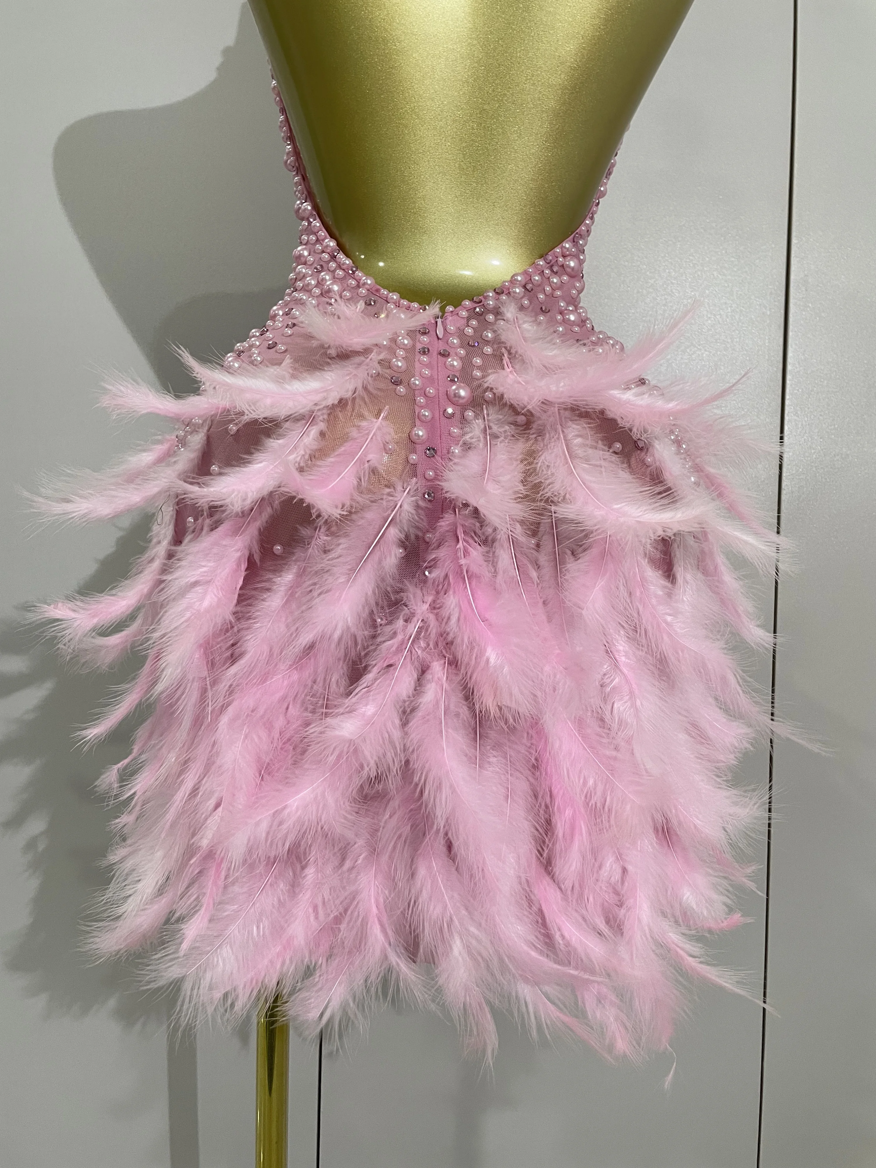 Abito corto da donna con strass di lusso, perle, piume, scollo all’americana, senza schienale, da donna, sexy, per festeggiare il compleanno, discoteca, costume di scena