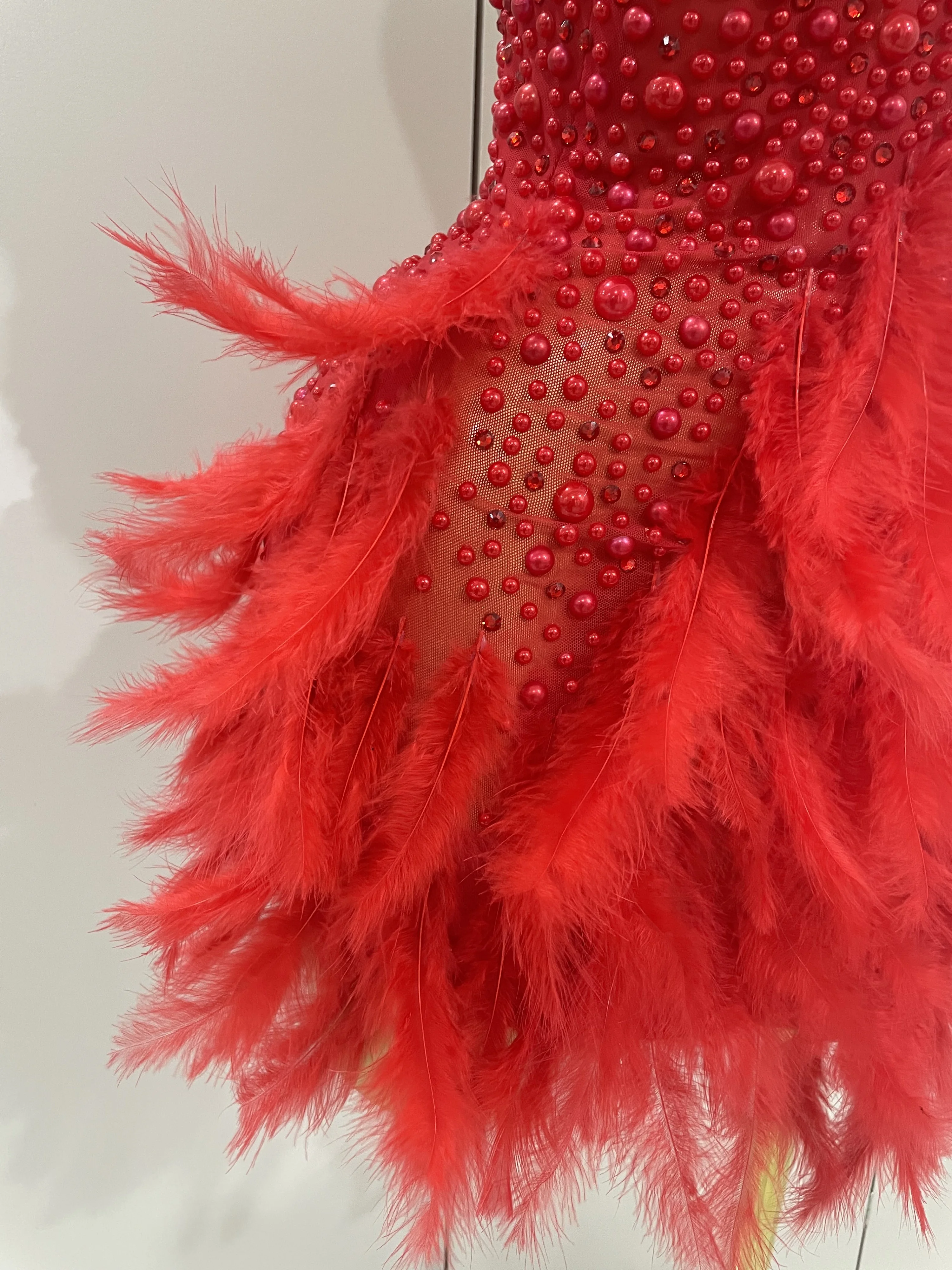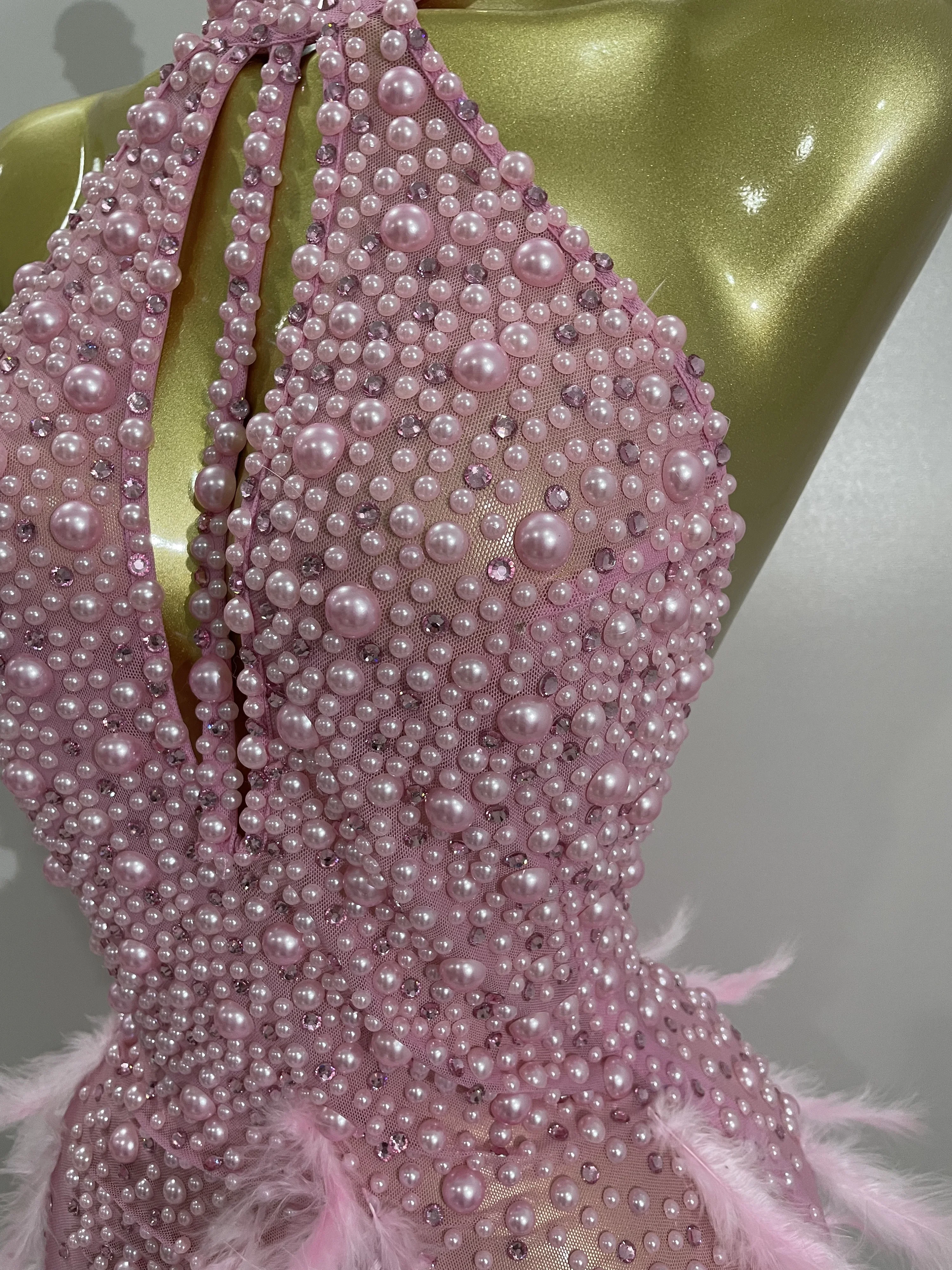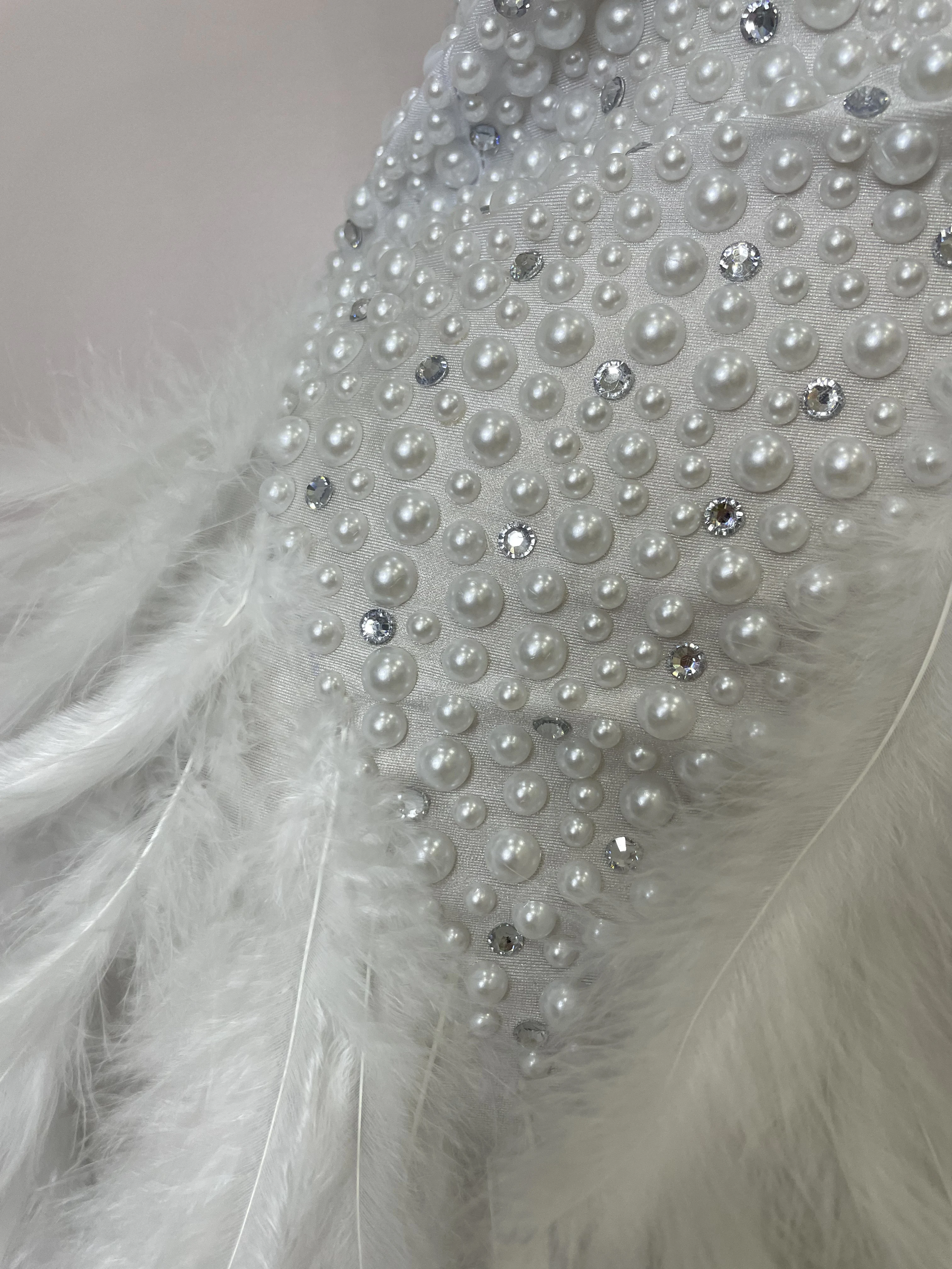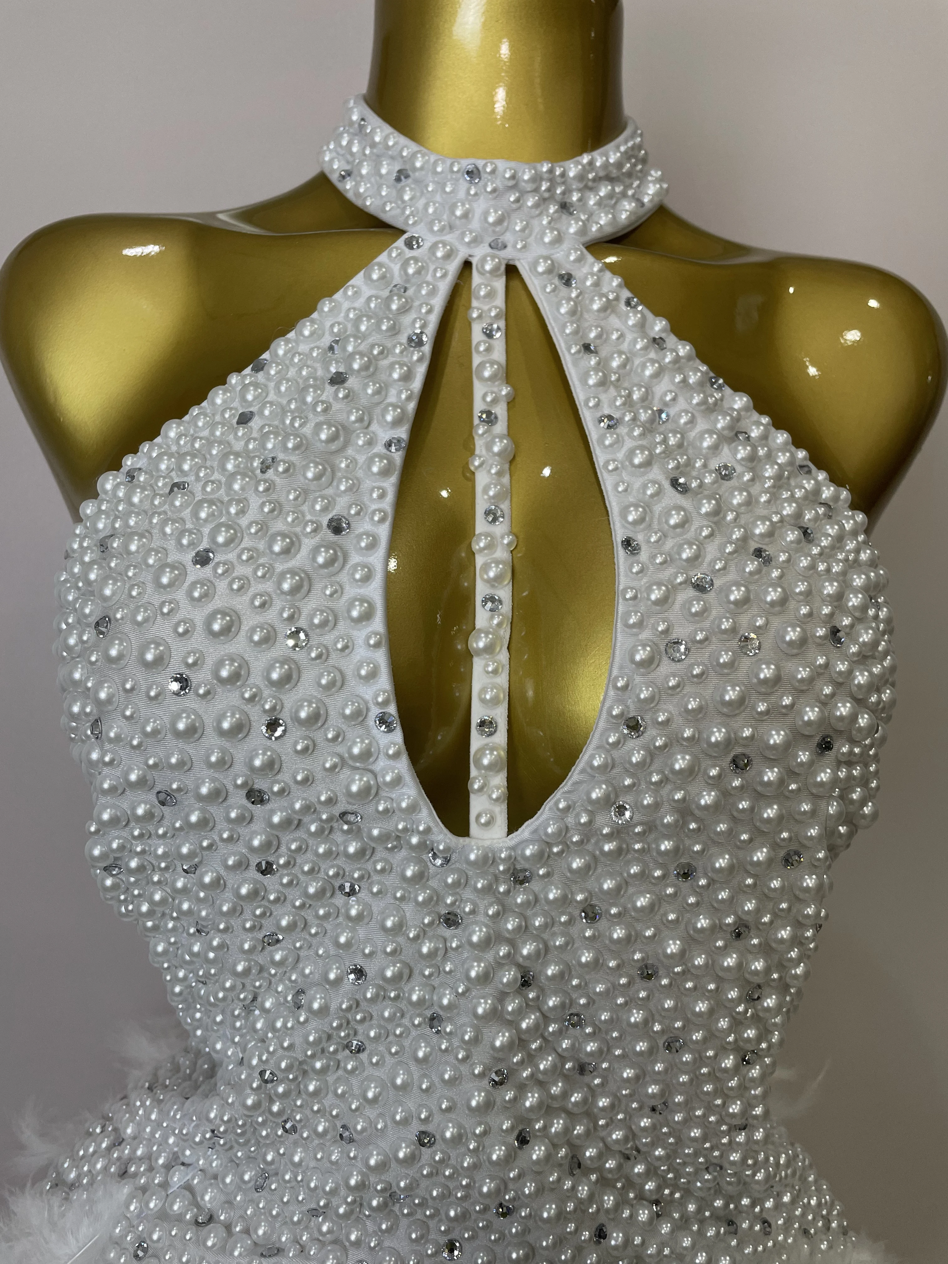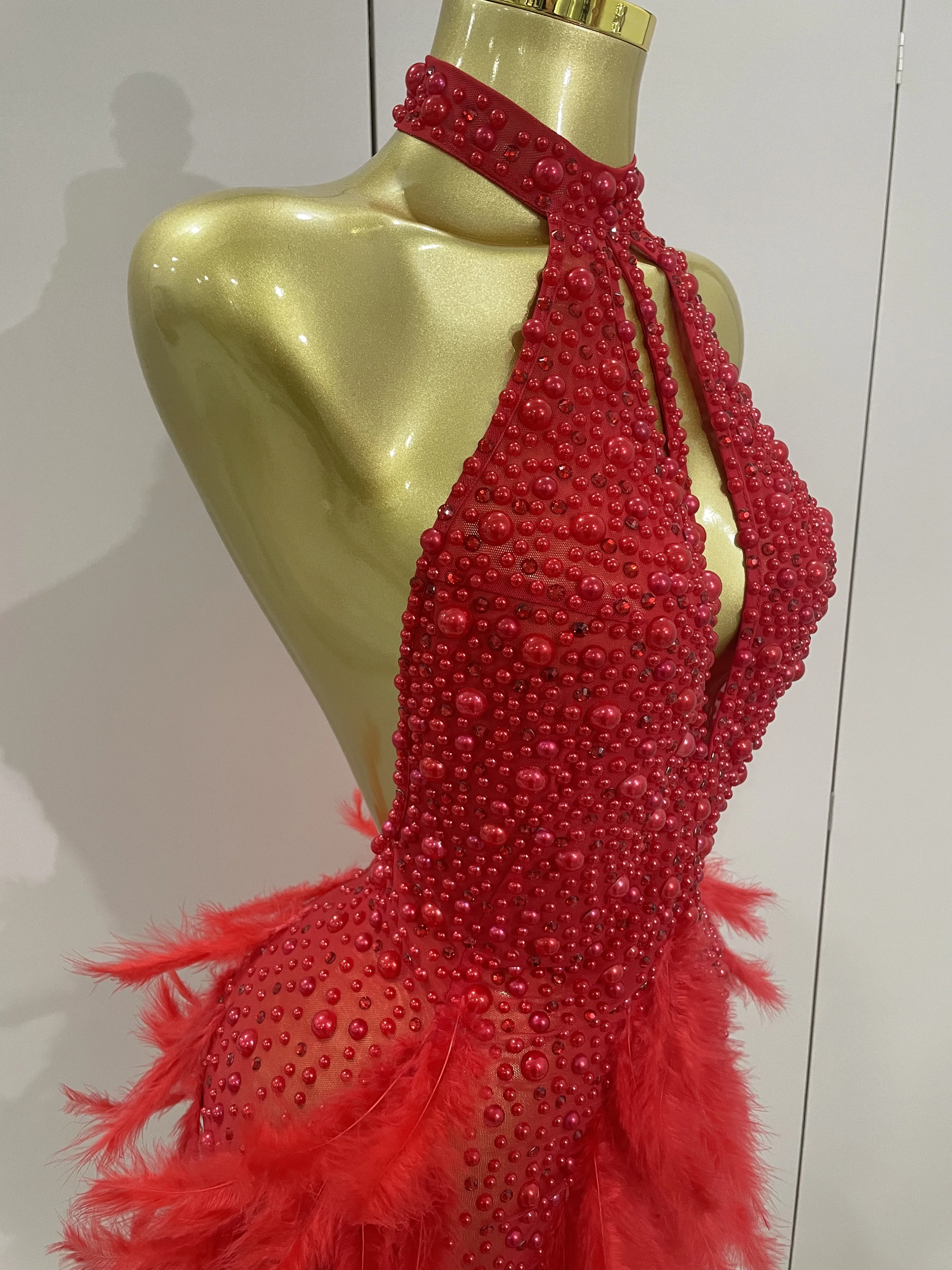 Abito corto da donna con strass di lusso, perle, piume, scollo all’americana, senza schienale, da donna, sexy, per festeggiare il compleanno, discoteca, costume di scena