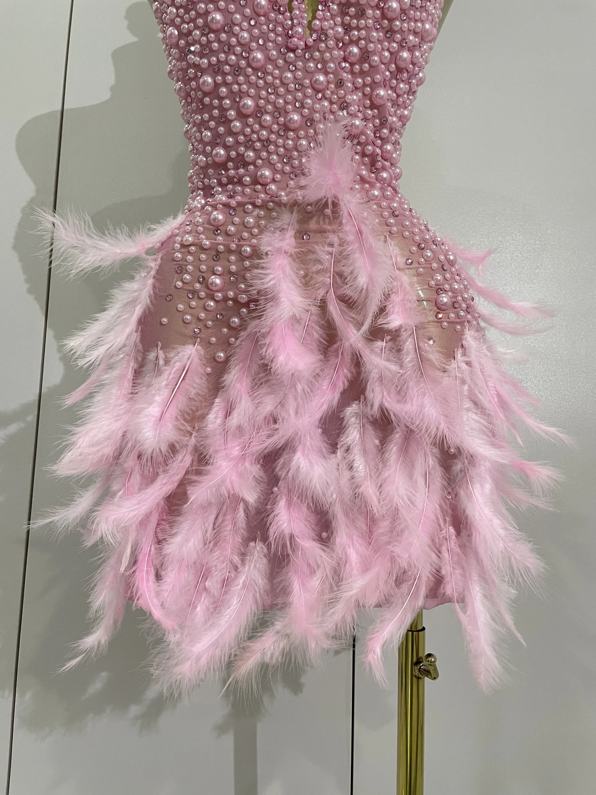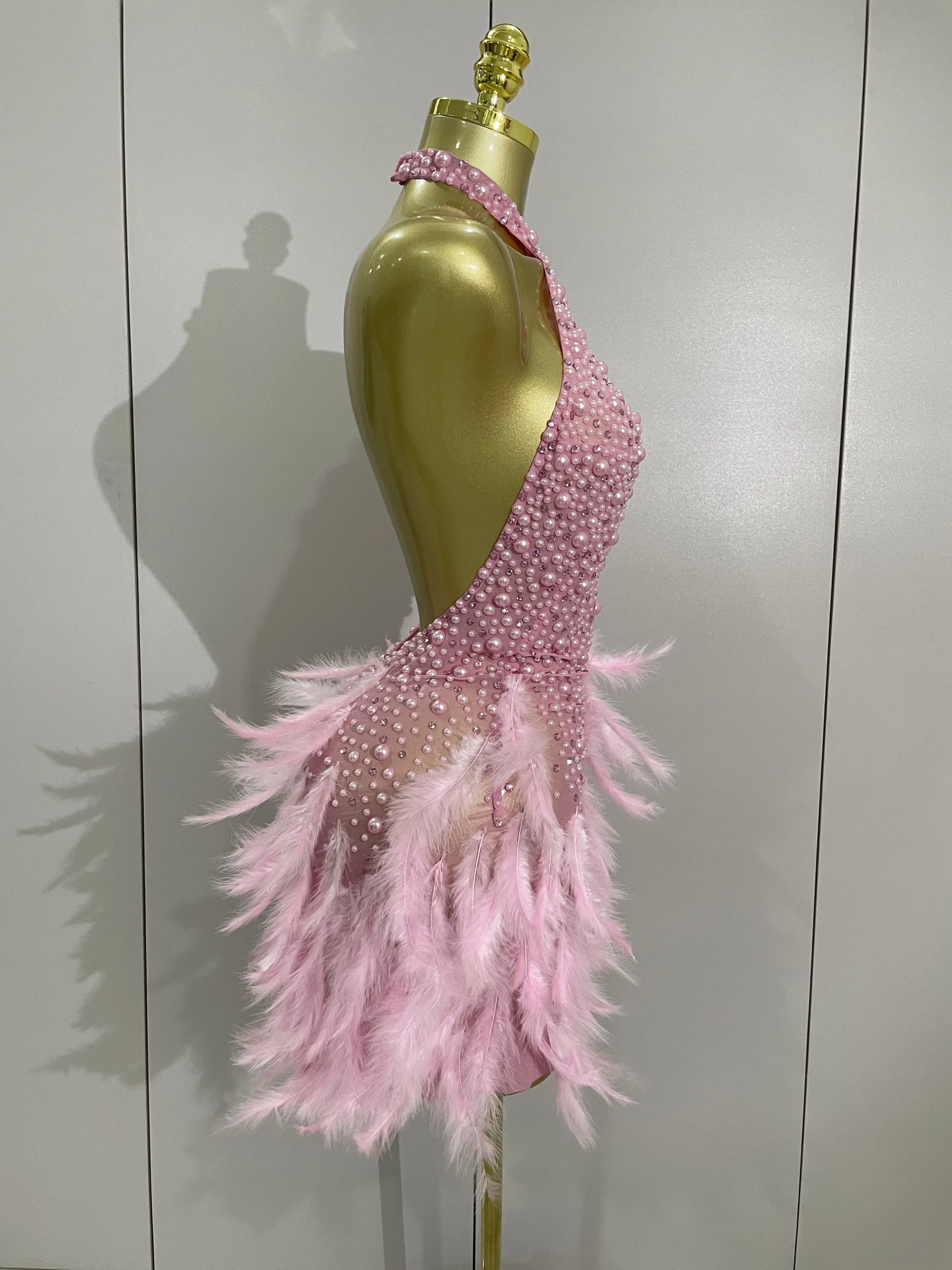 Abito corto da donna con strass di lusso, perle, piume, scollo all’americana, senza schienale, da donna, sexy, per festeggiare il compleanno, discoteca, costume di scena