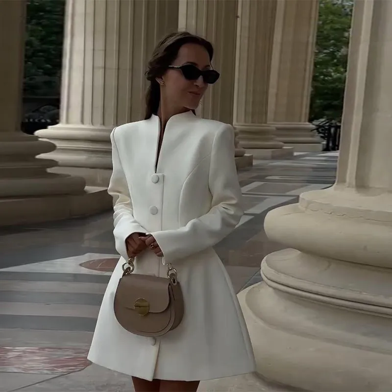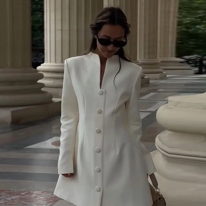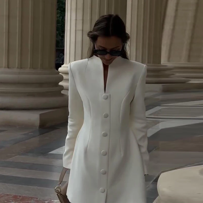 Abito da donna a vita chiusa con scollo a V manica lunga con bottoni Solid Lady A-Line Dresess 2025 Autunno elegante capispalla femminile