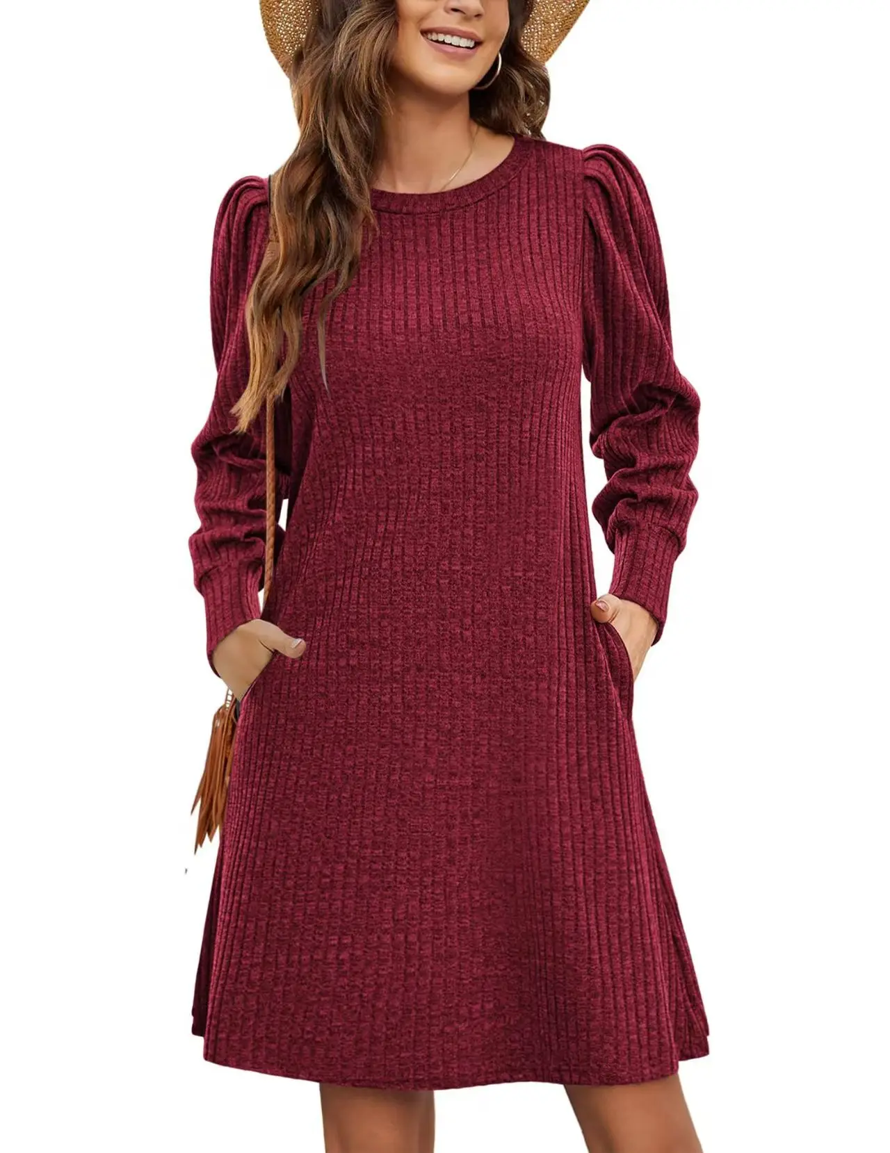 Abito ampio altalena pieghettato a maniche lunghe da donna Abito casual girocollo tinta unita da donna Abiti autunno inverno