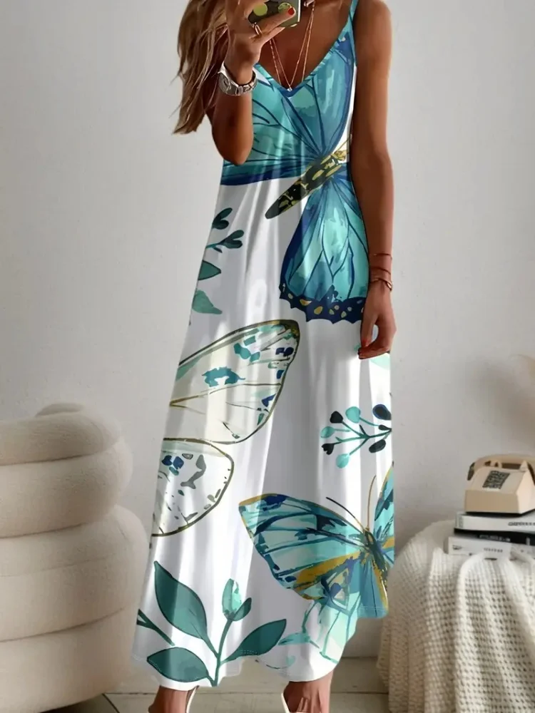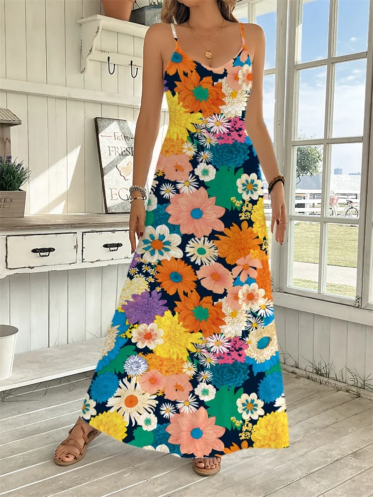Abito da donna casual alla caviglia con stampa floreale fresca, abito sexy con scollo a V di tendenza urbana da strada, abito da sera lungo per feste