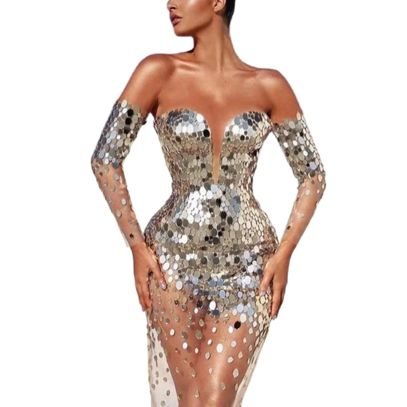 Girare la testa con questo abito lungo in rete trasparente con paillettes scintillanti, presenta un sorprendente dorato/argento è fantastico per realizzare una dichiarazione attraente.