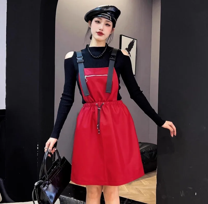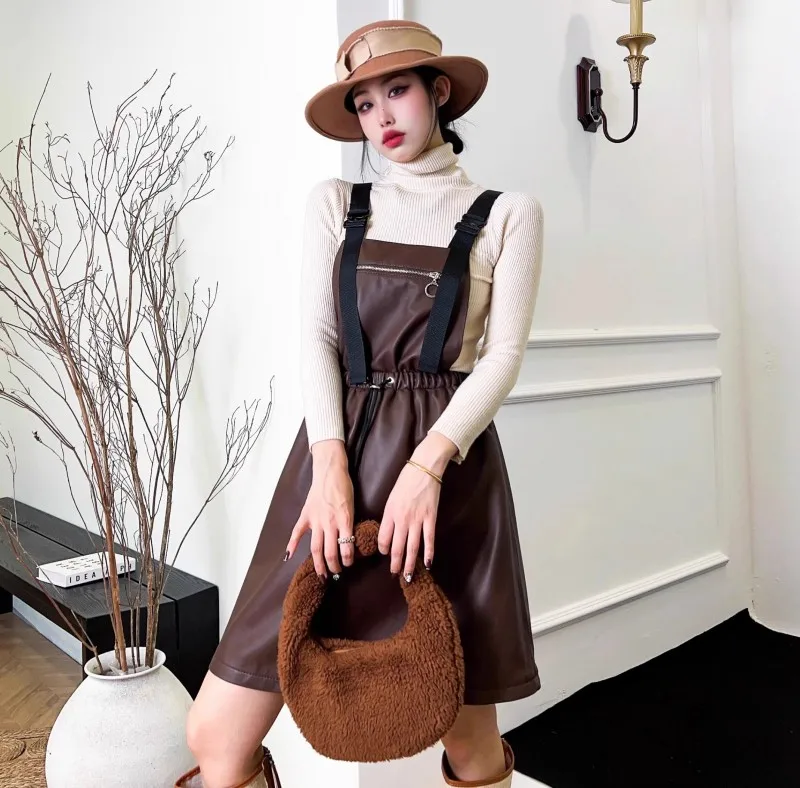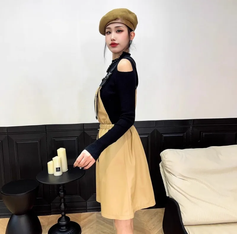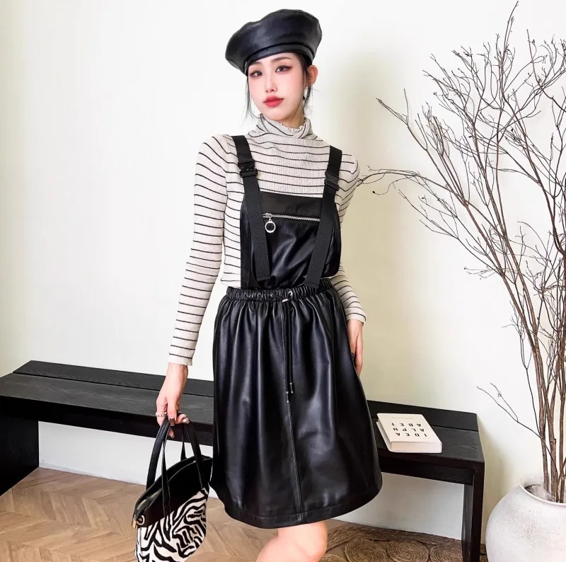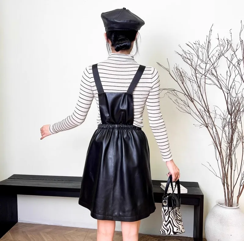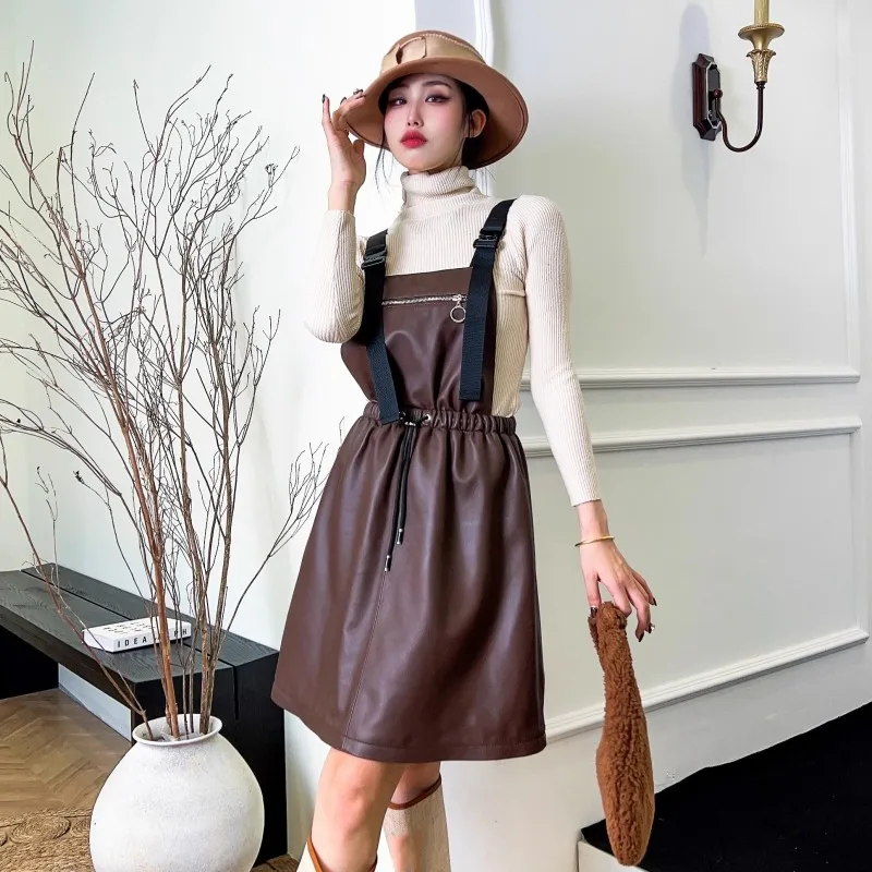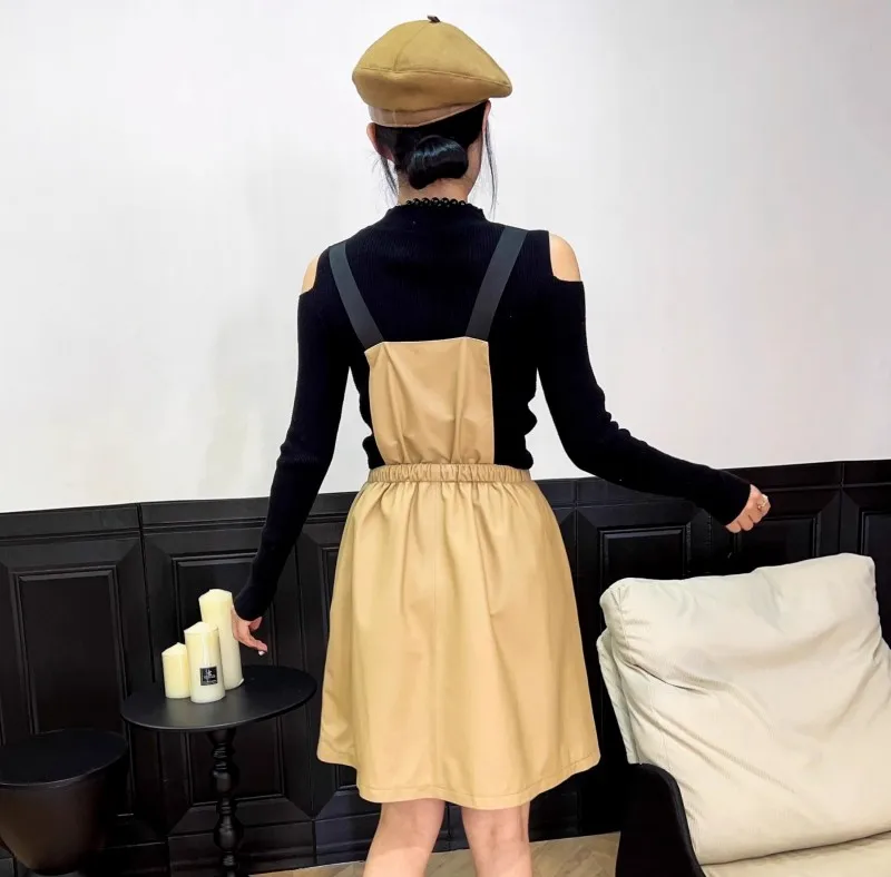 Abito da donna in vera pelle elastico a vita alta dolce casual colletto quadrato scava fuori pullover senza maniche abiti con cinghie a linea 1Abito da donna in vera pelle elastico a vita alta dolce casual colletto quadrato scava fuori pullover senza maniche abiti con cinghie a linea