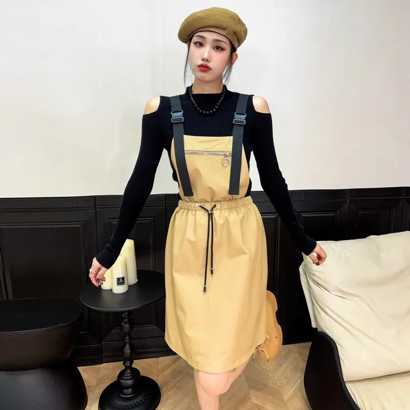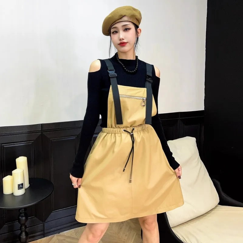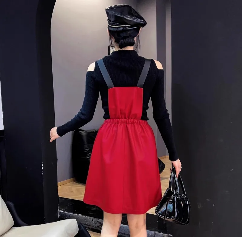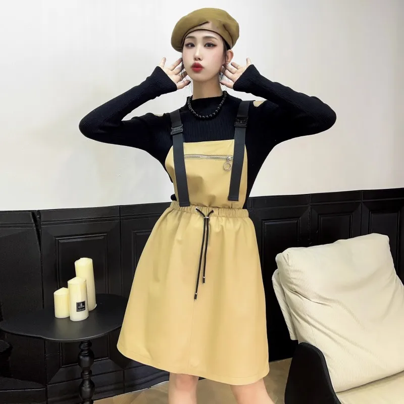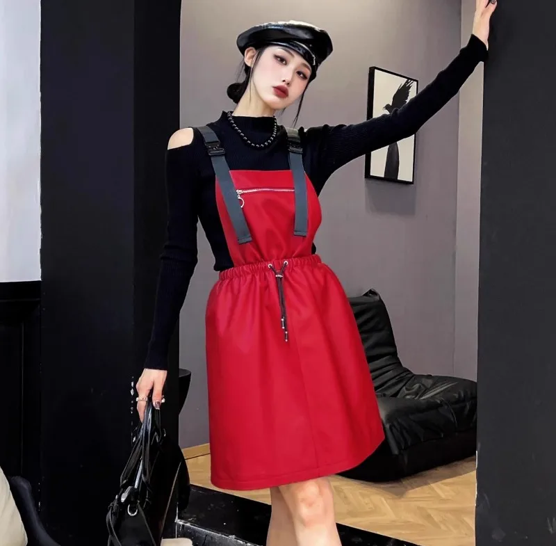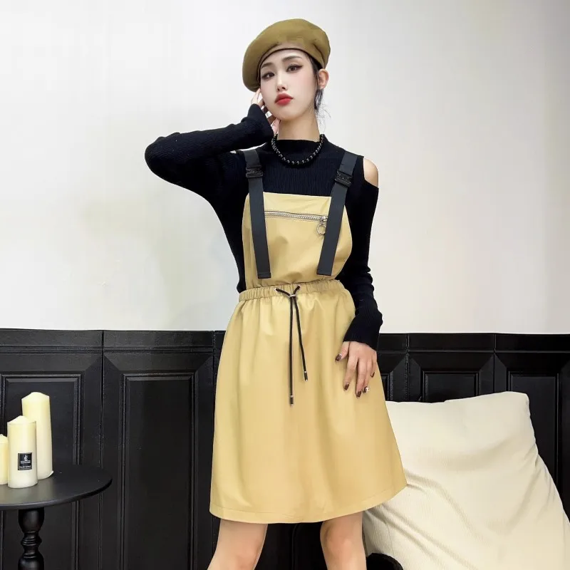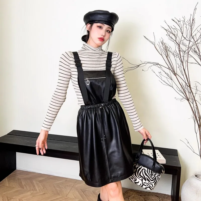 Abito da donna in vera pelle elastico a vita alta dolce casual colletto quadrato scava fuori pullover senza maniche abiti con cinghie a linea 1Abito da donna in vera pelle elastico a vita alta dolce casual colletto quadrato scava fuori pullover senza maniche abiti con cinghie a linea