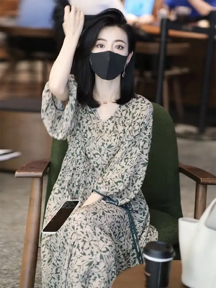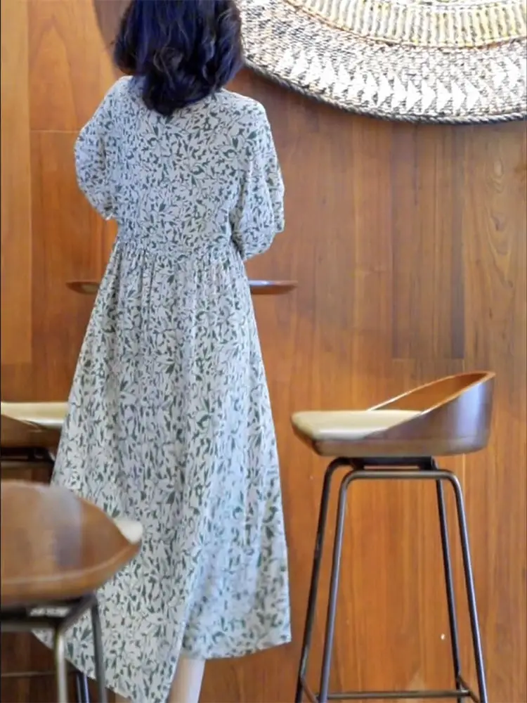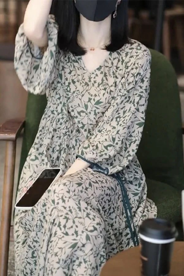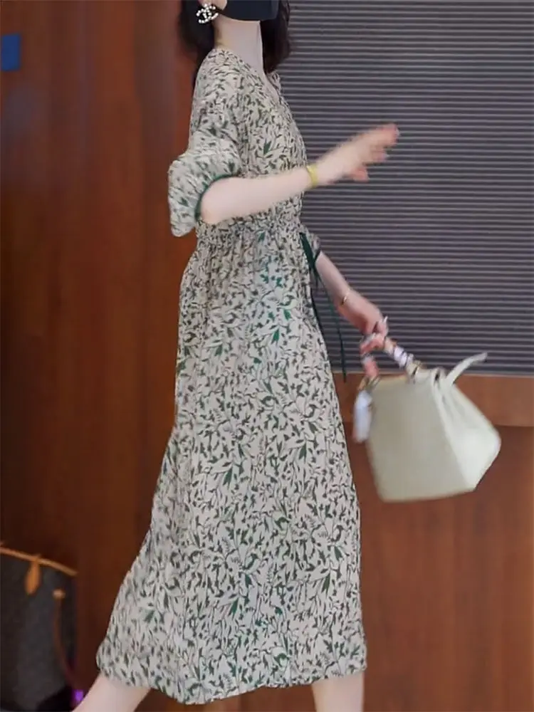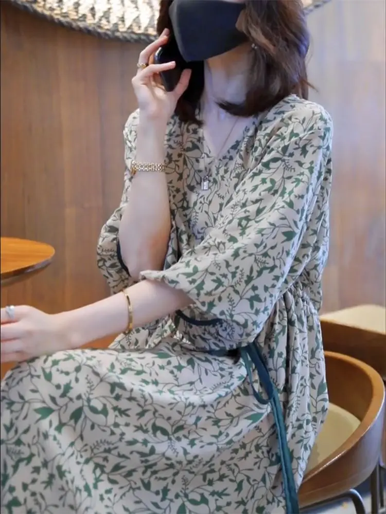 Abito floreale da donna Primavera Nuovo stile Maniche a 7 quarti Gonna elegante ampia e sottile con stampa di media lunghezza