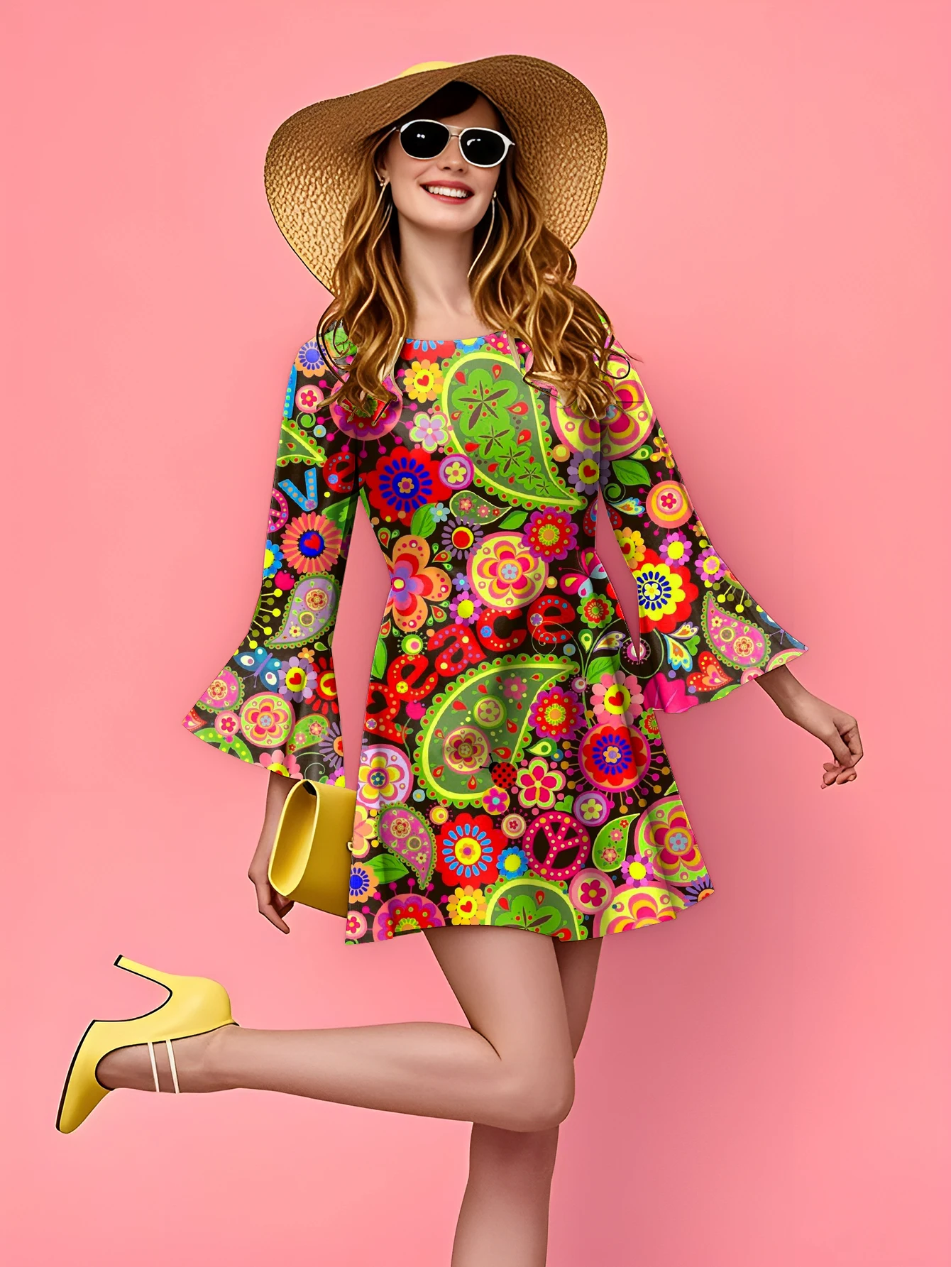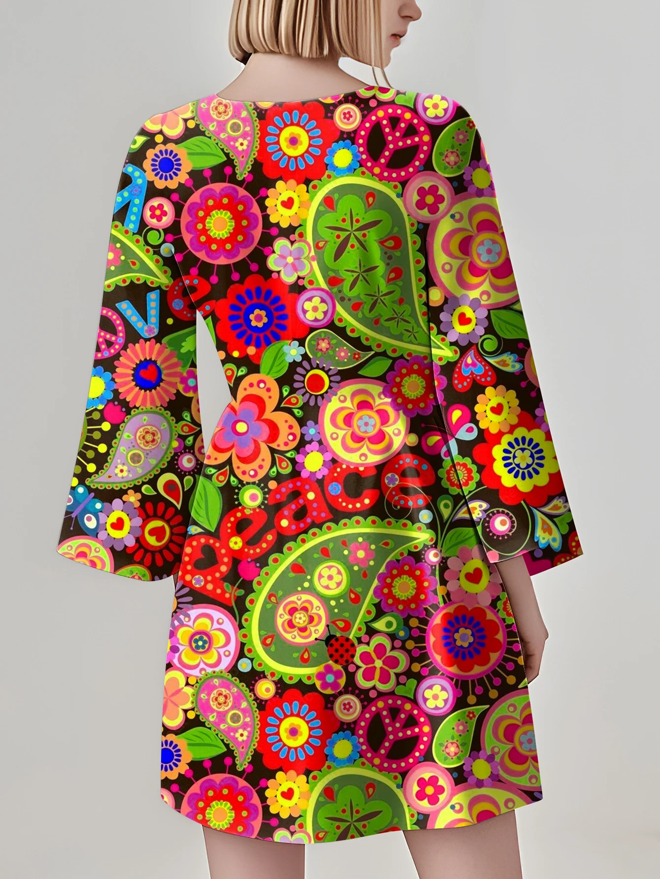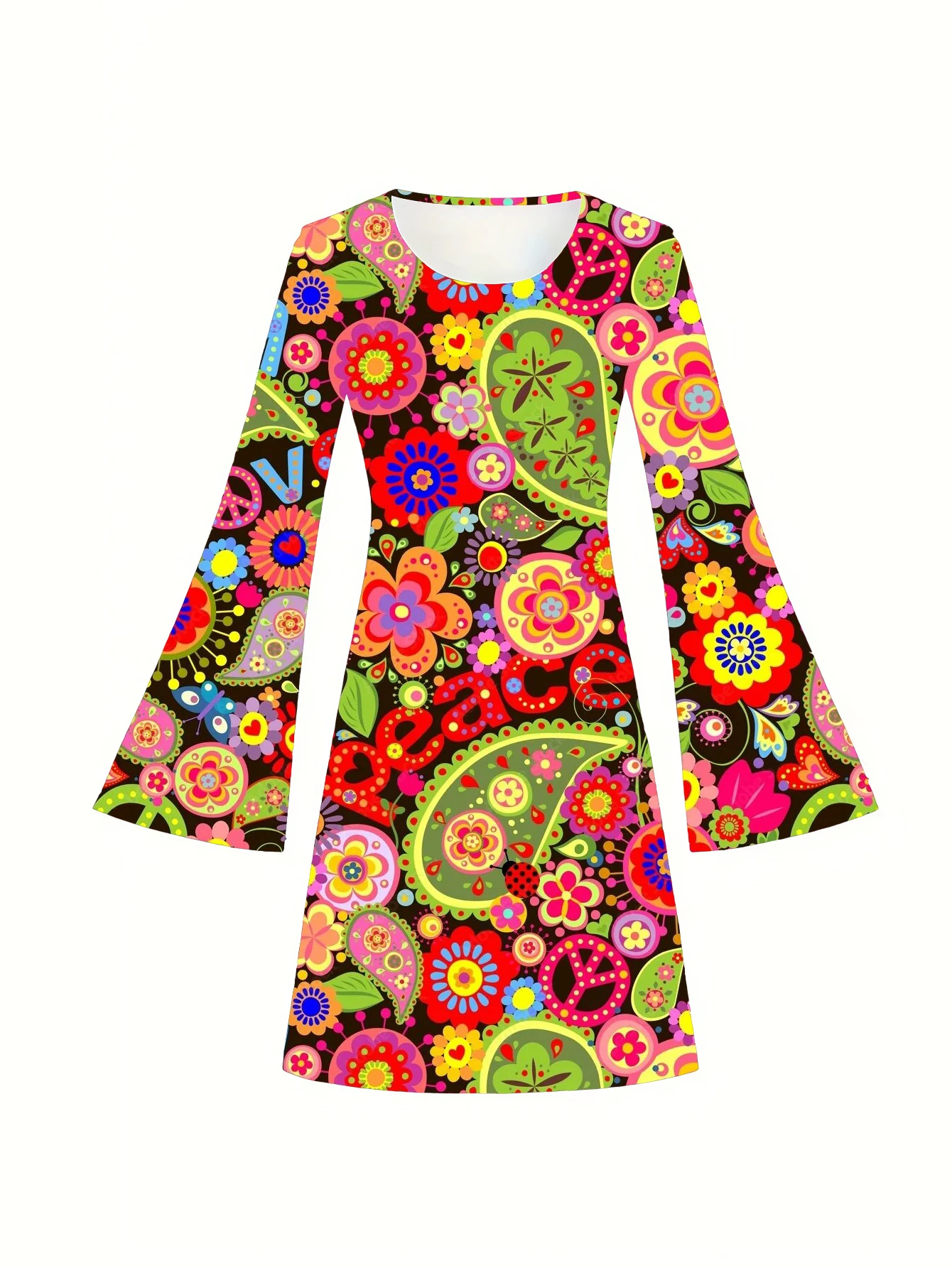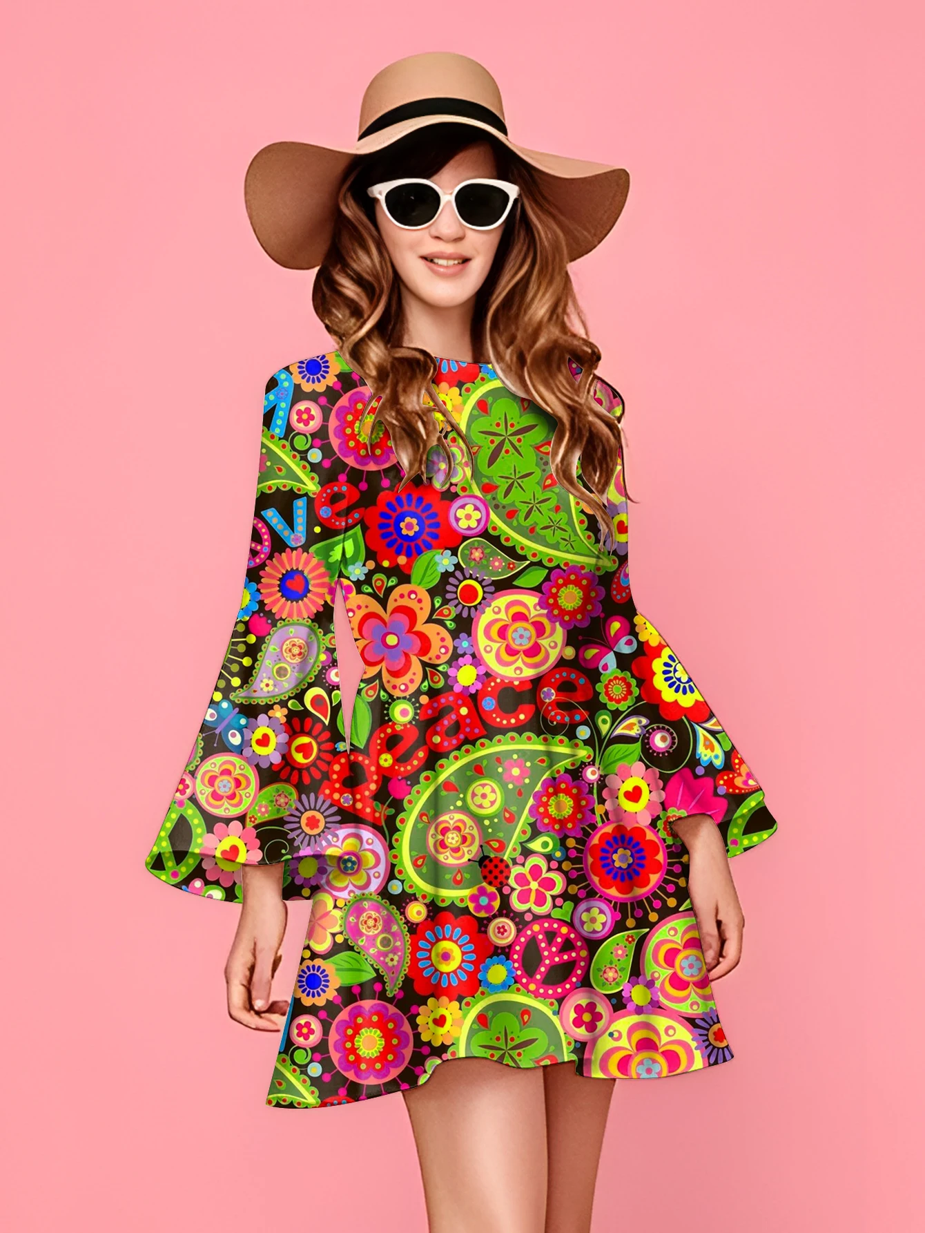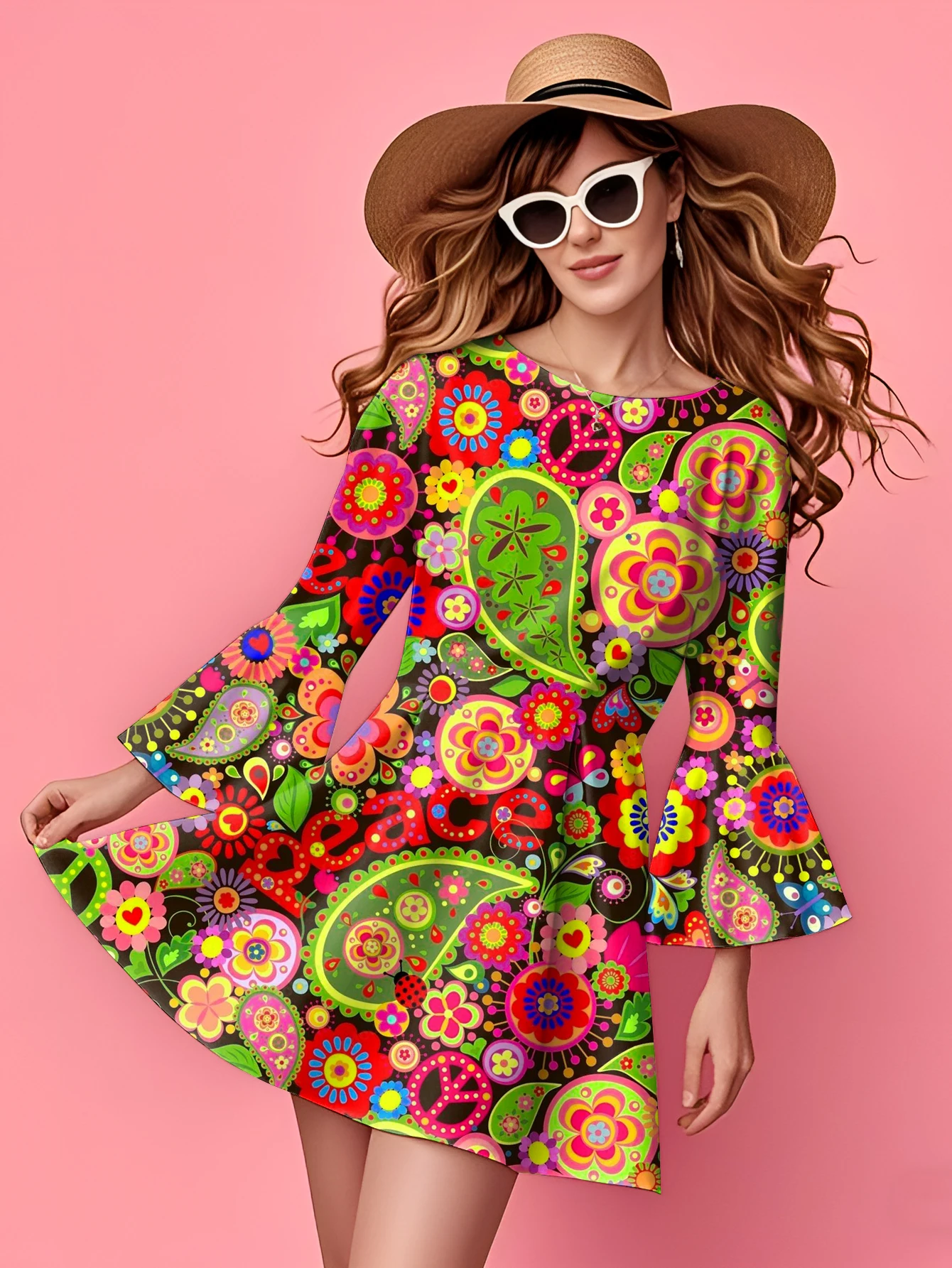 Abito hippie retrò anni ’70 da donna con stampa floreale vibrante del segno di pace, girocollo, manica a campana casual, primavera estate autunno