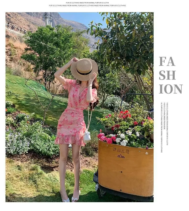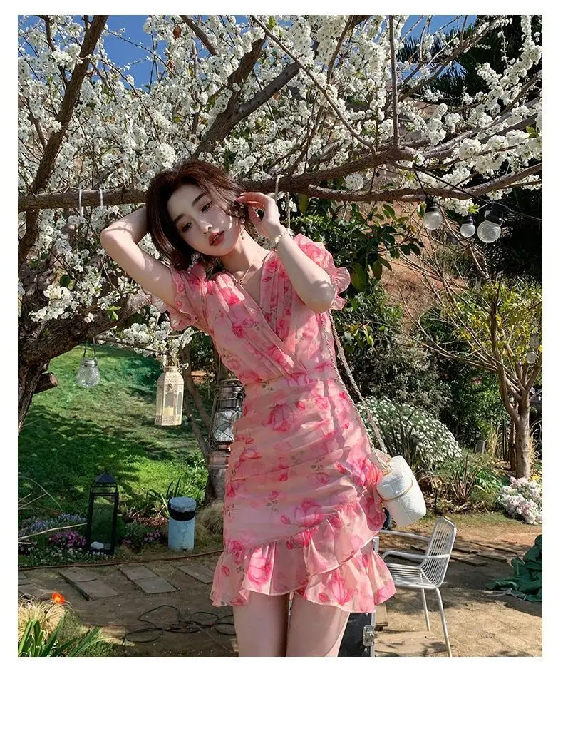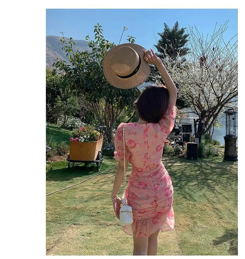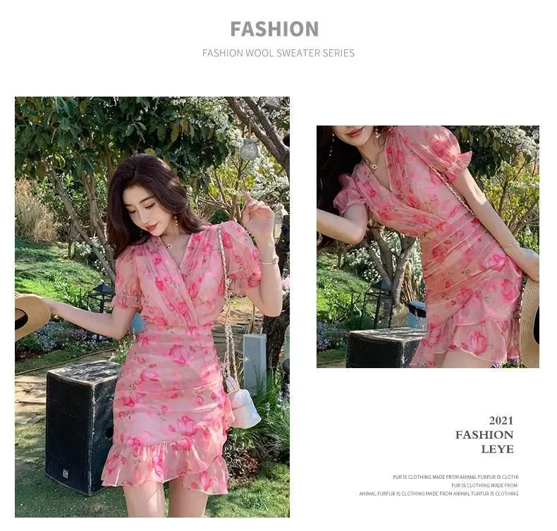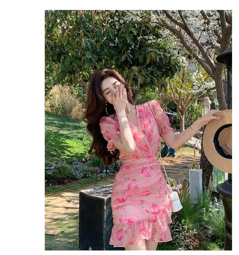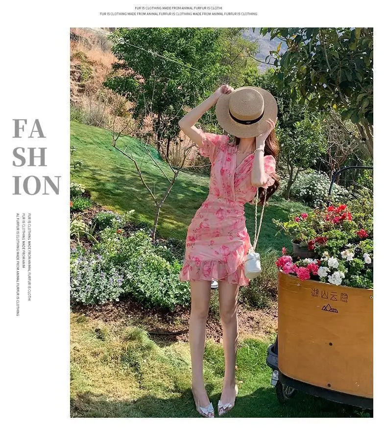 3 recensioni per Abito in chiffon floreale da donna 2025 Estate nuova gonna corta a coda di pesce con vestibilità slim e temperamento sottile