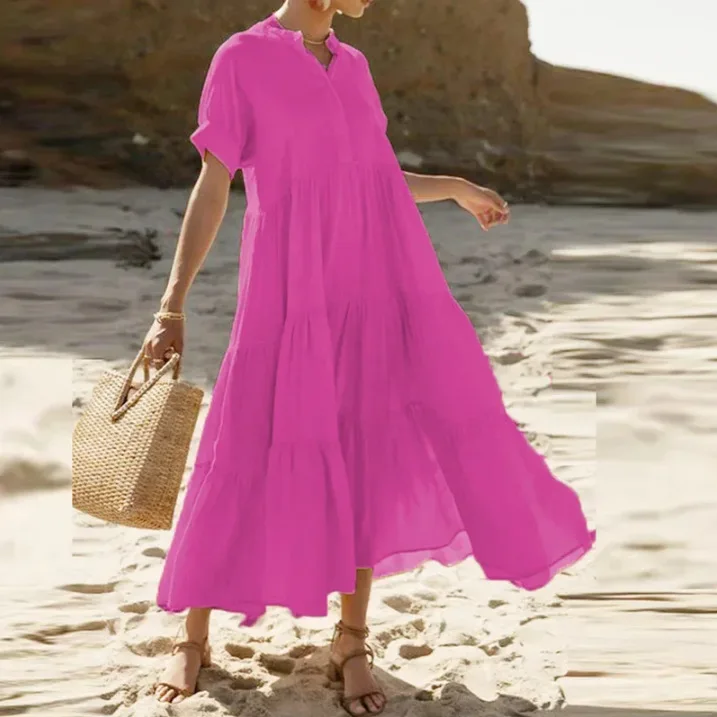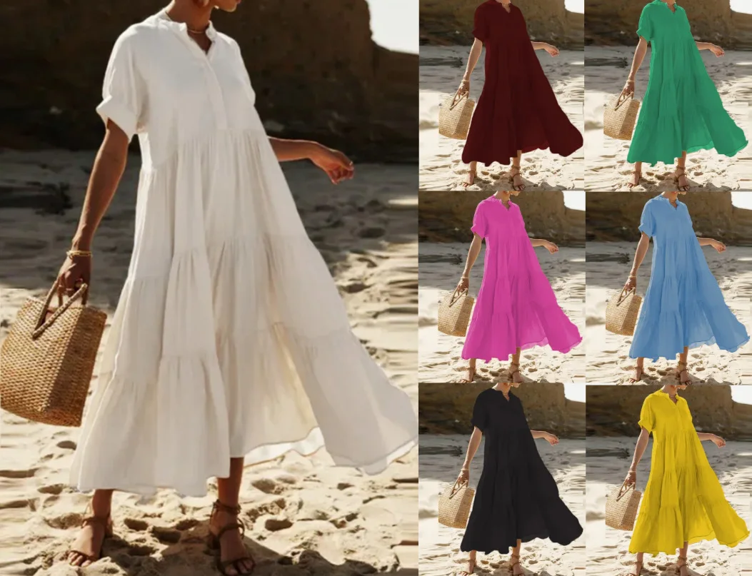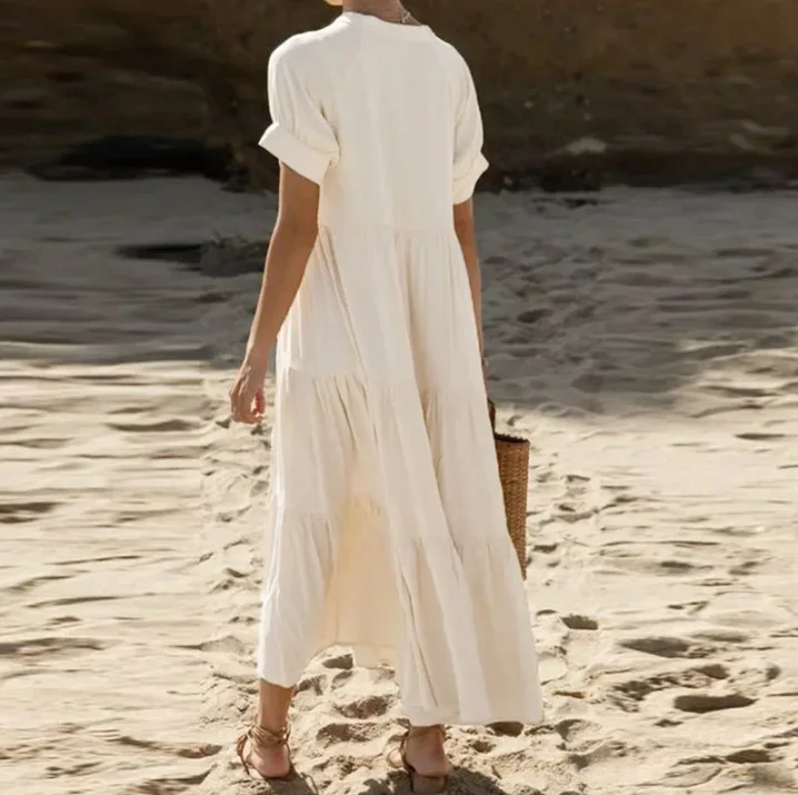 Abito lungo casual con volant con scollo a V Abito estivo da donna alla moda Abiti da vacanza al mare Abito casual a maniche corte in tinta unita da donna allentato