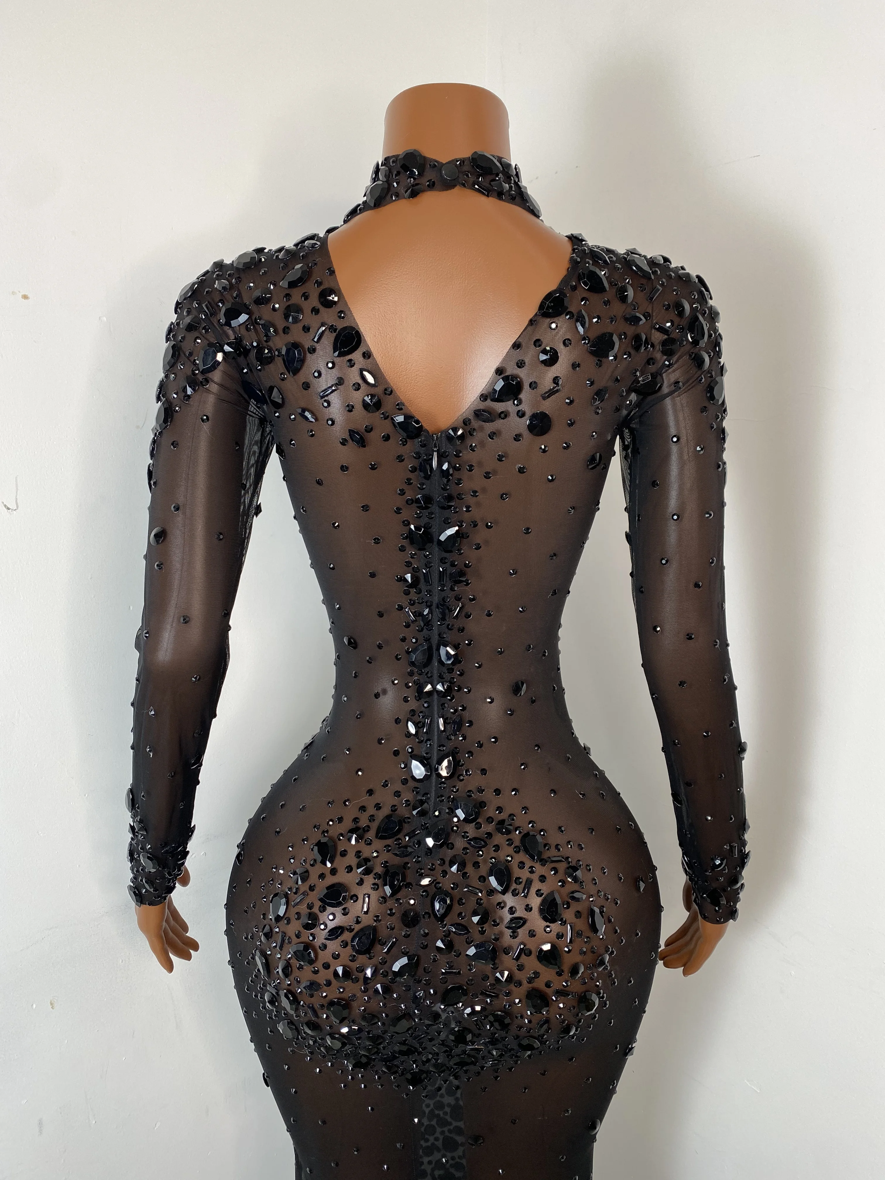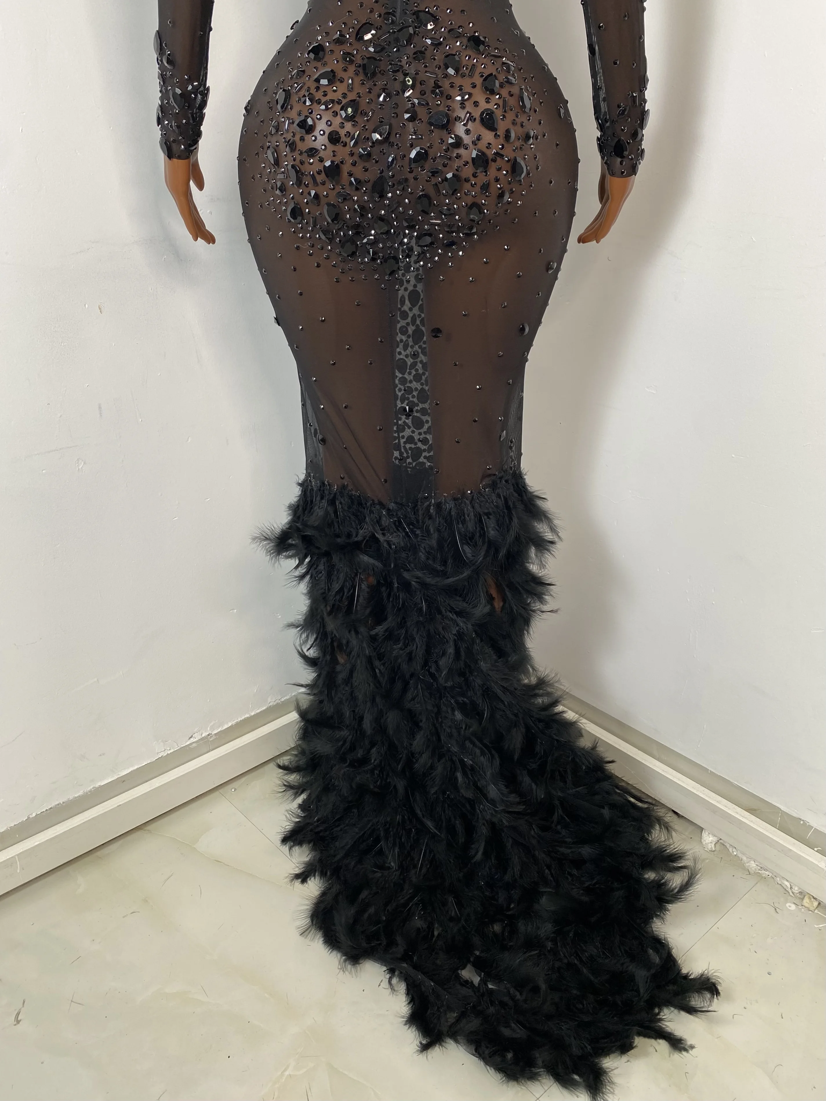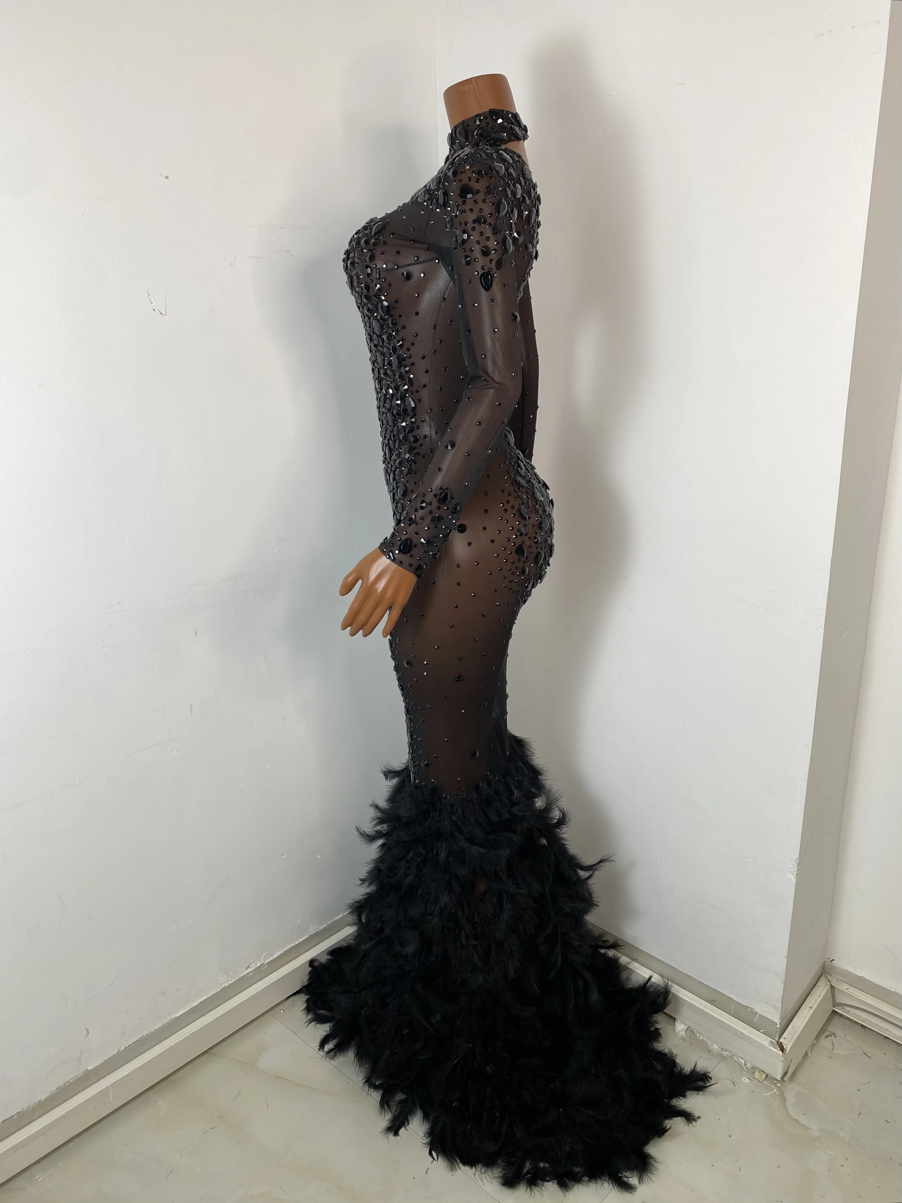 Abito lungo da donna sexy con piume nere e diamanti in cristallo, maxi abito lungo, festa di compleanno, costume, bar, discoteca, abbigliamento per spettacoli teatrali