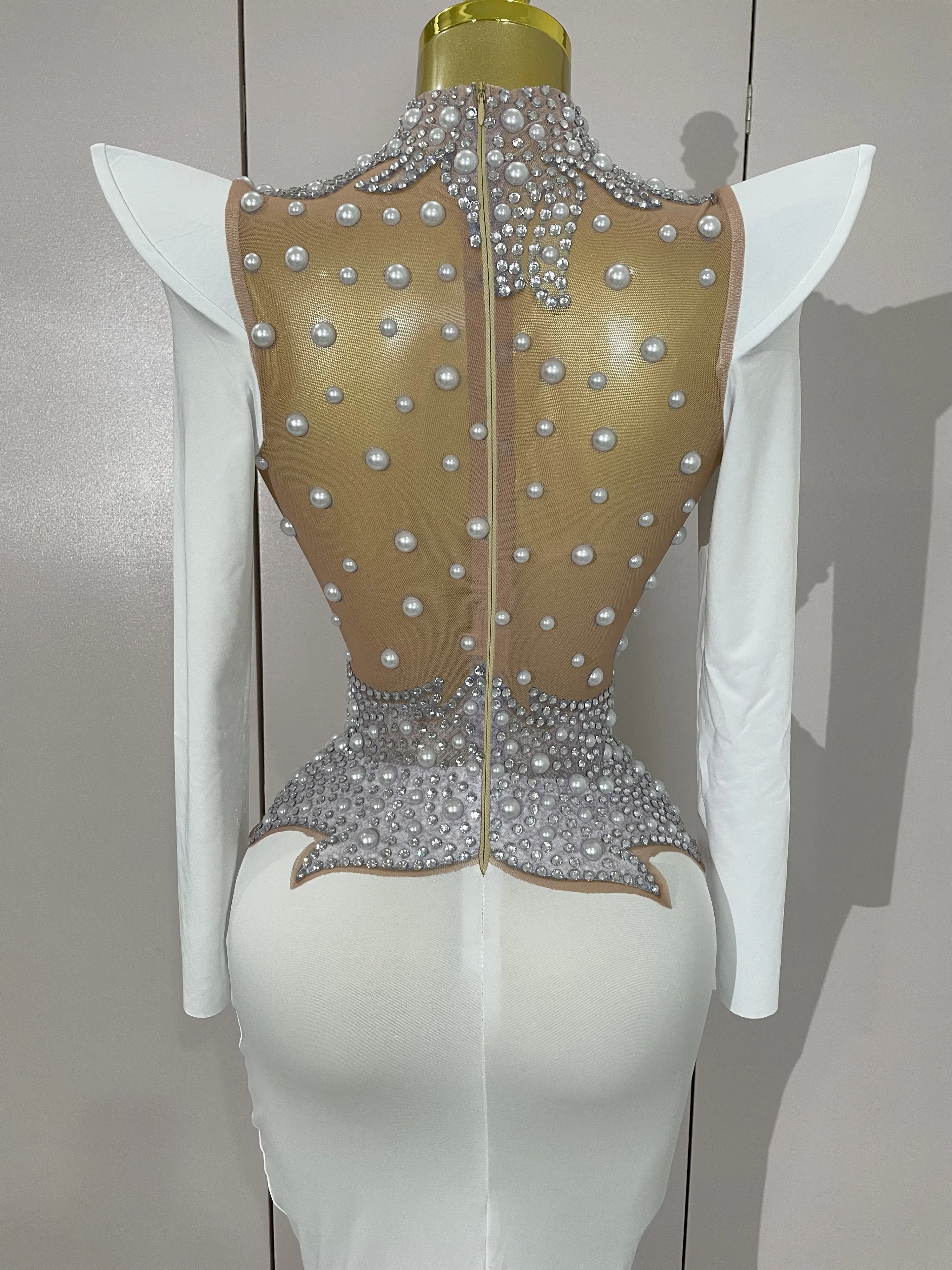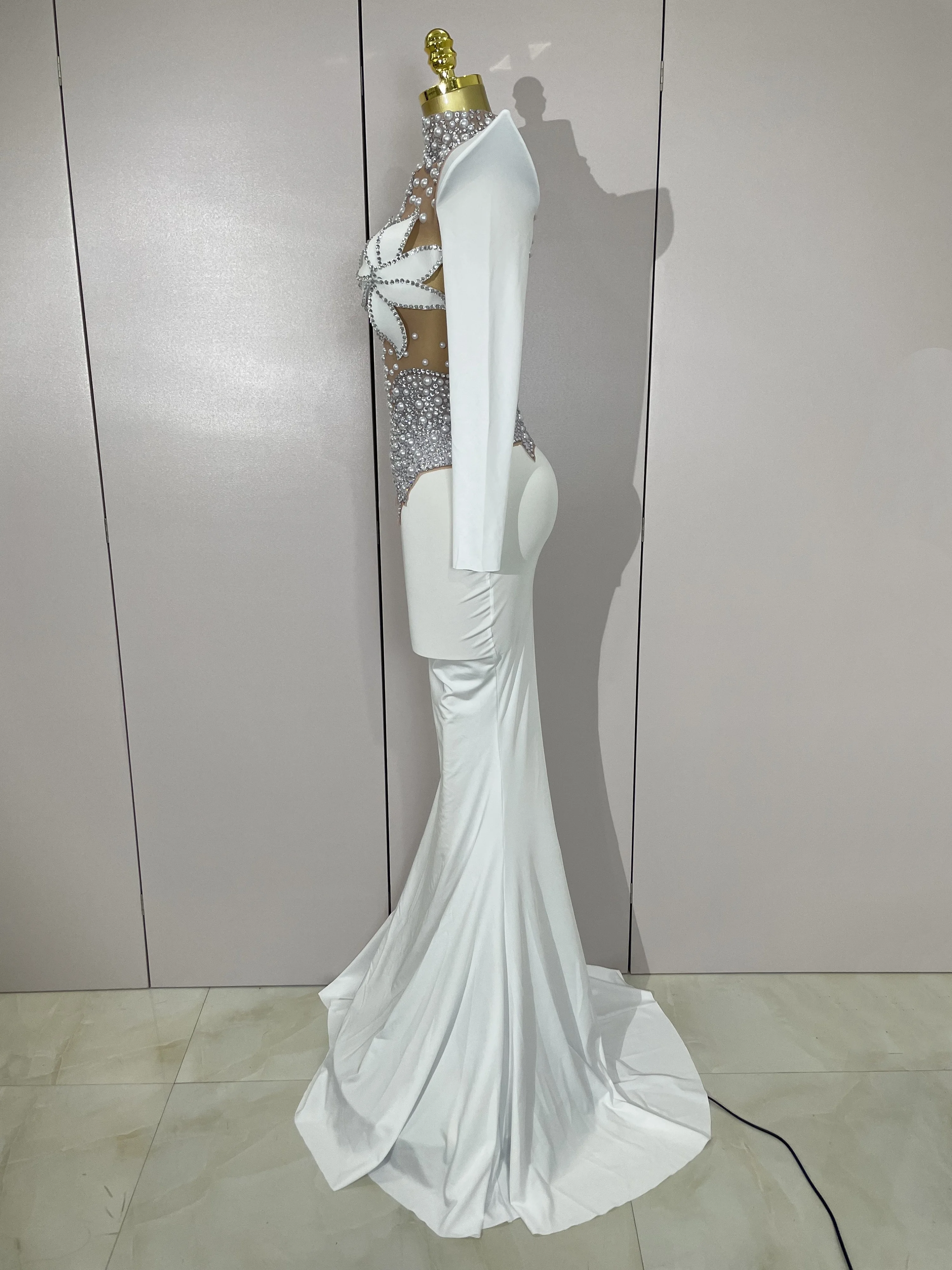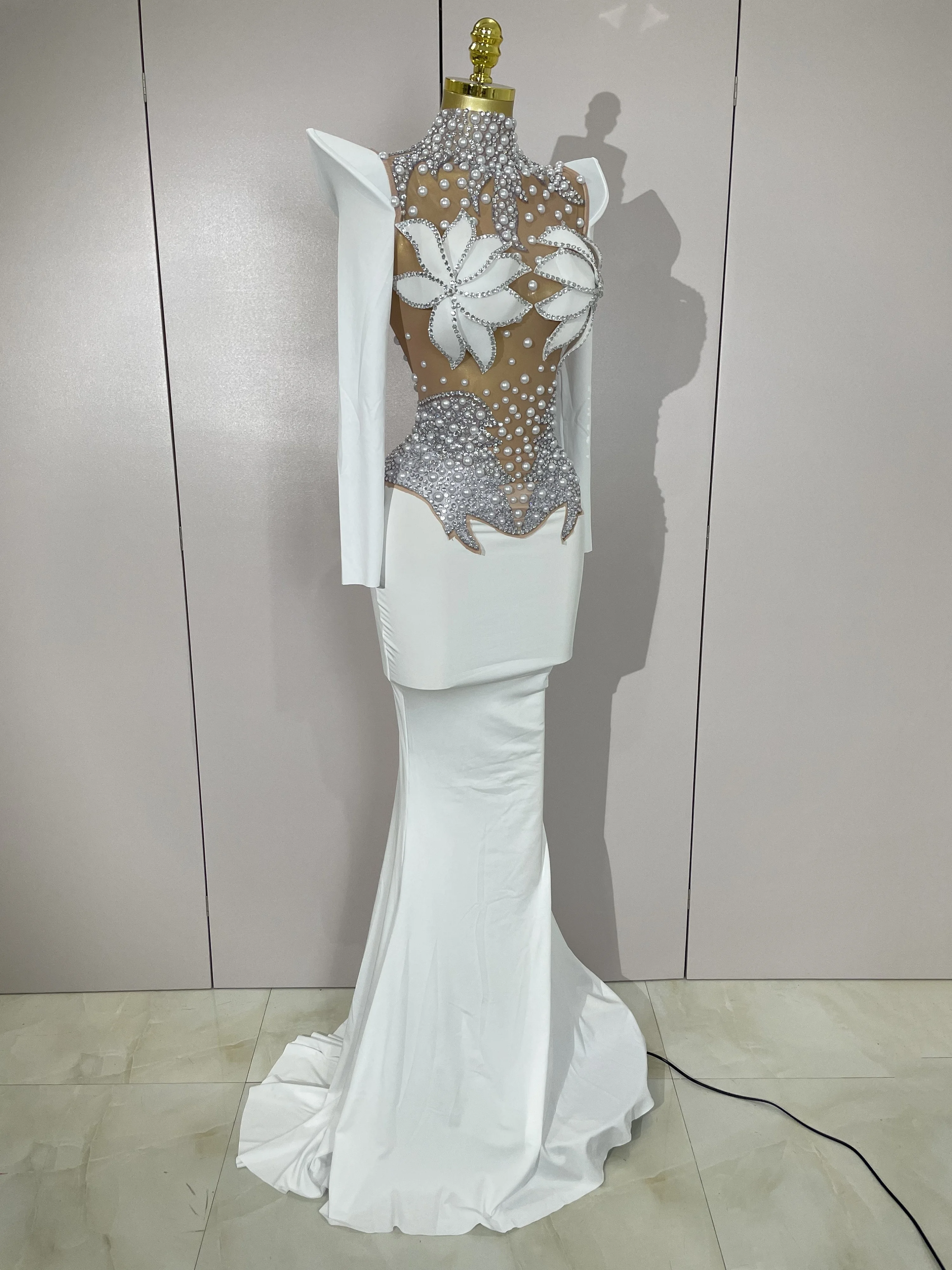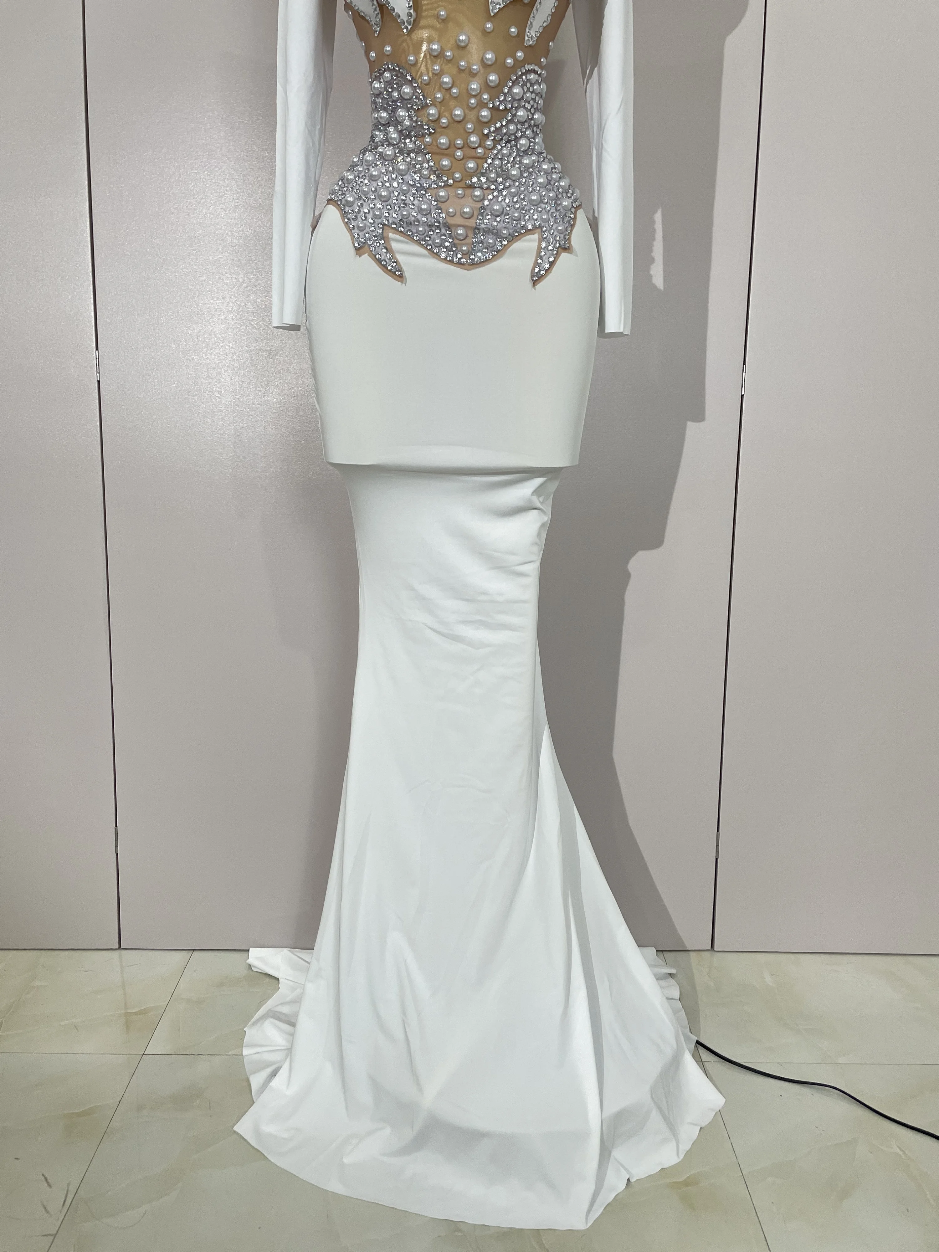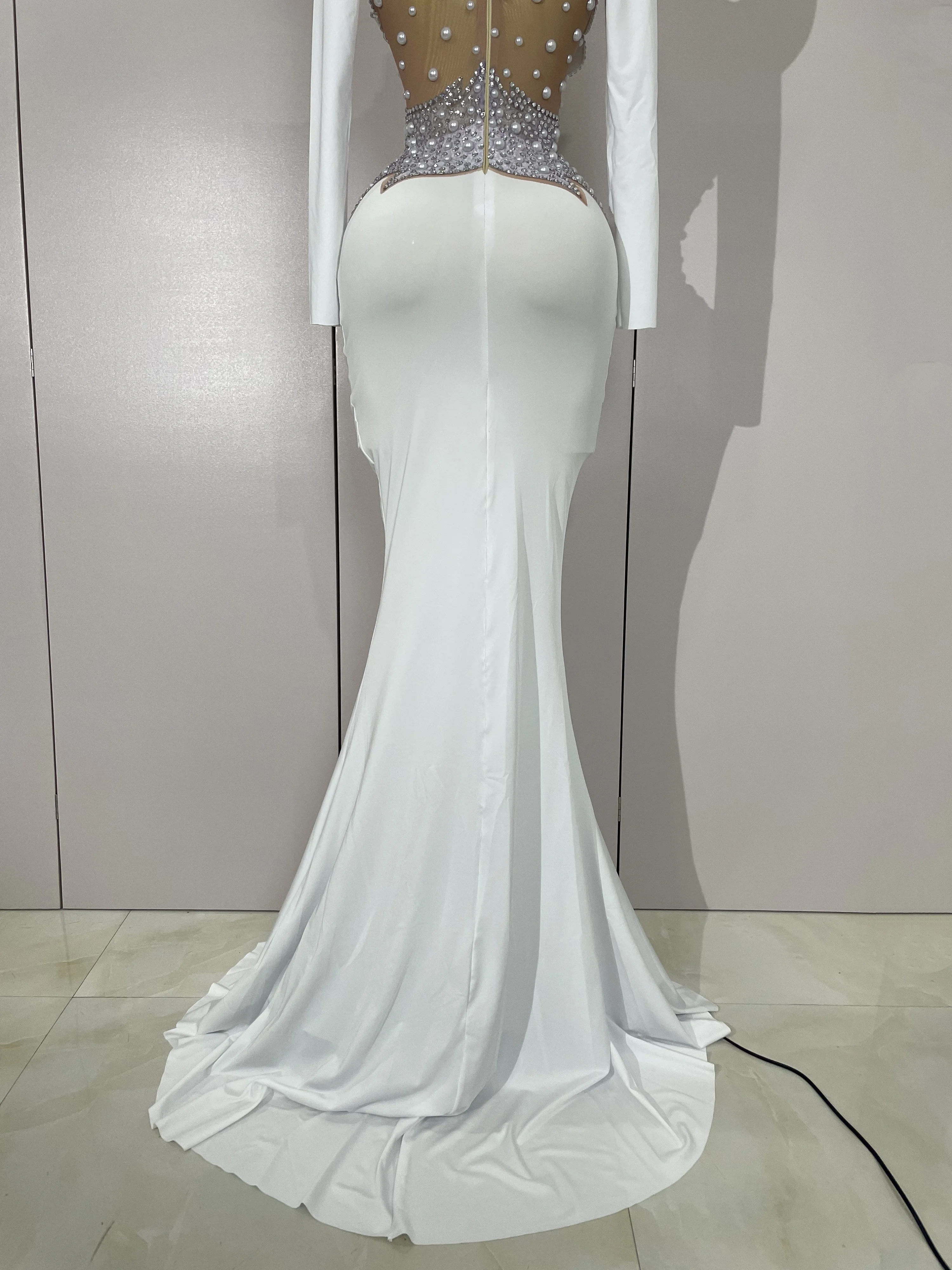 Abito lungo di lusso con diamanti scintillanti, bianco perla, trasparente, in rete, da donna, per matrimoni, feste serali, spettacoli teatrali