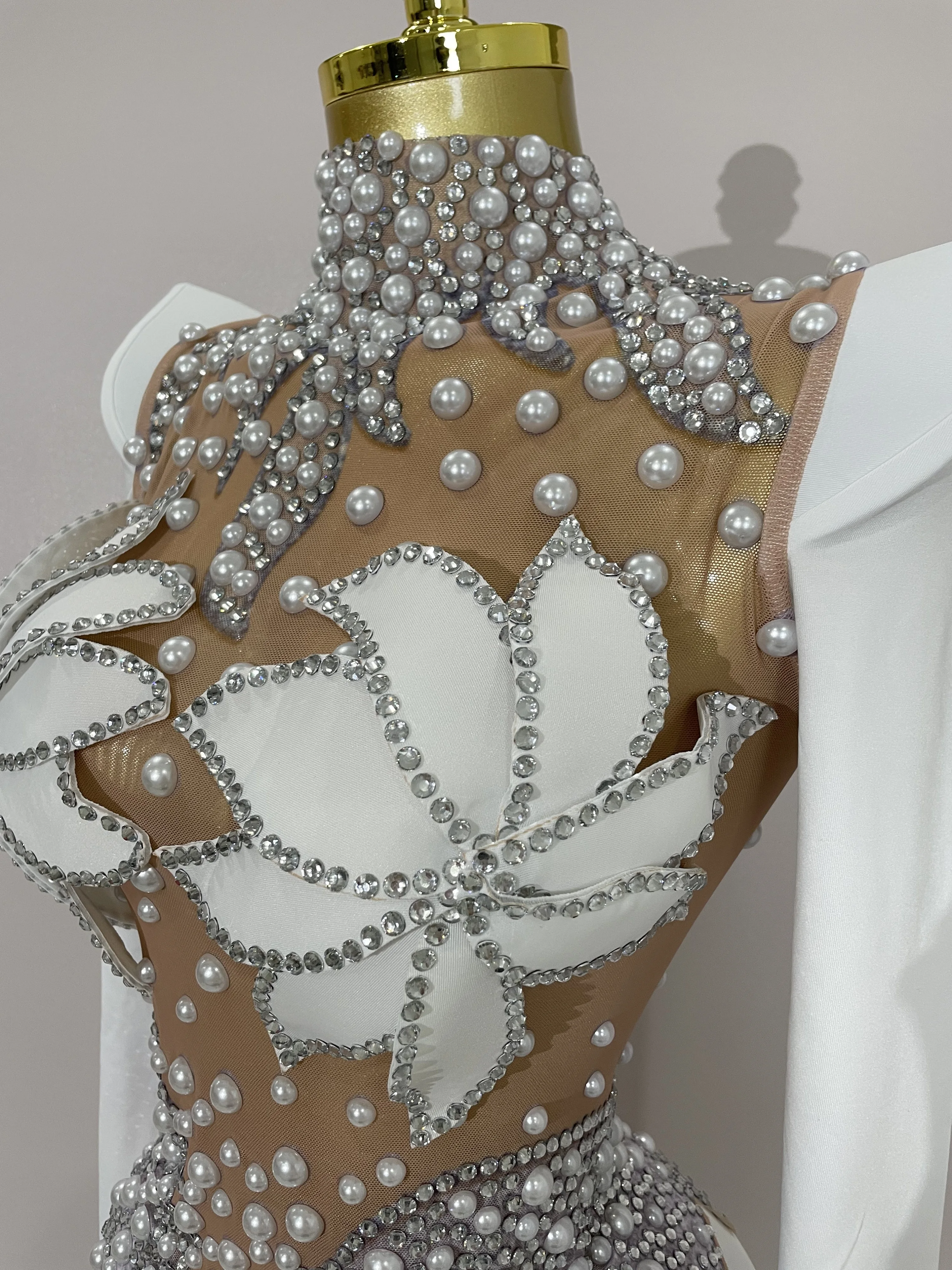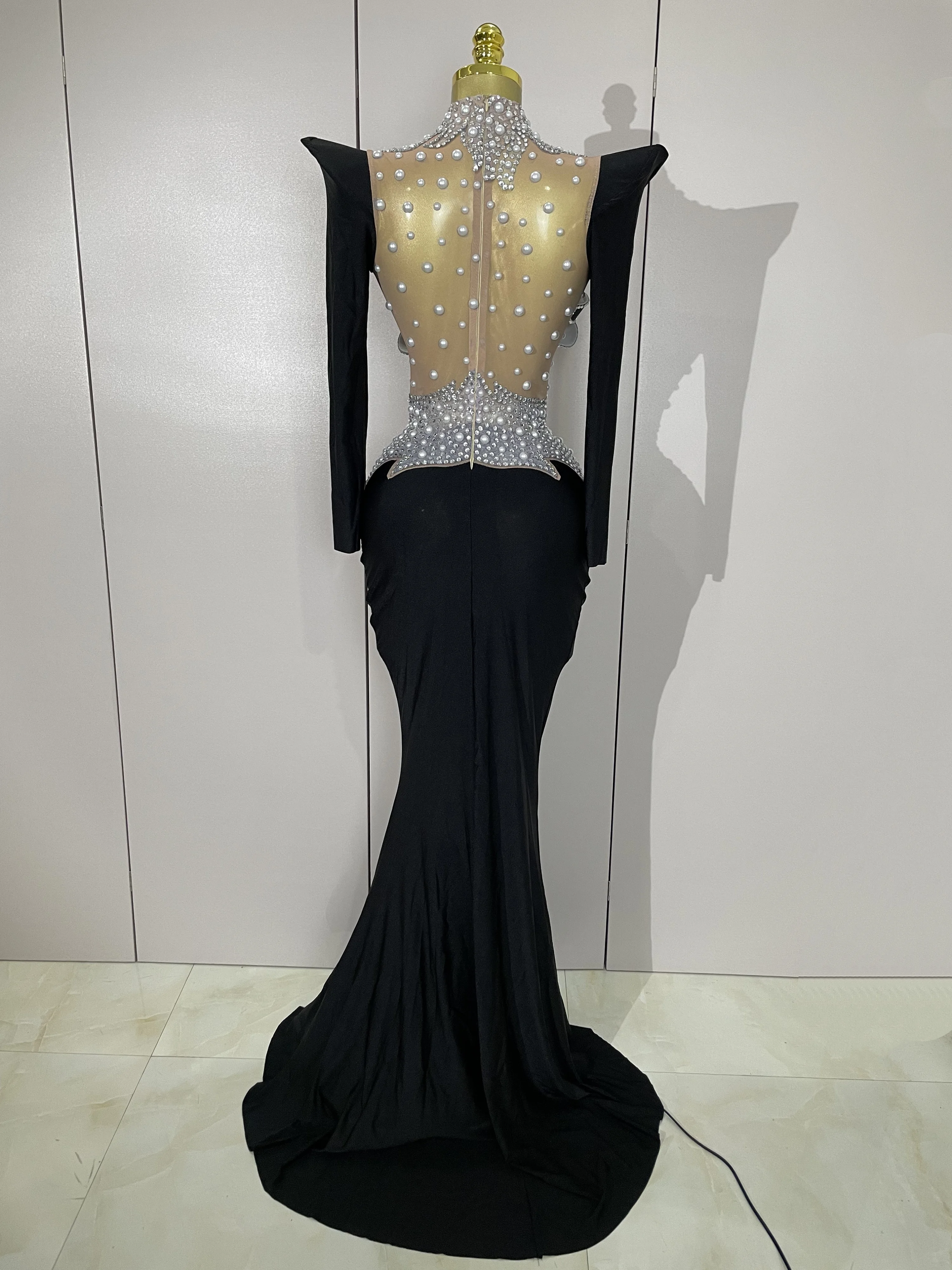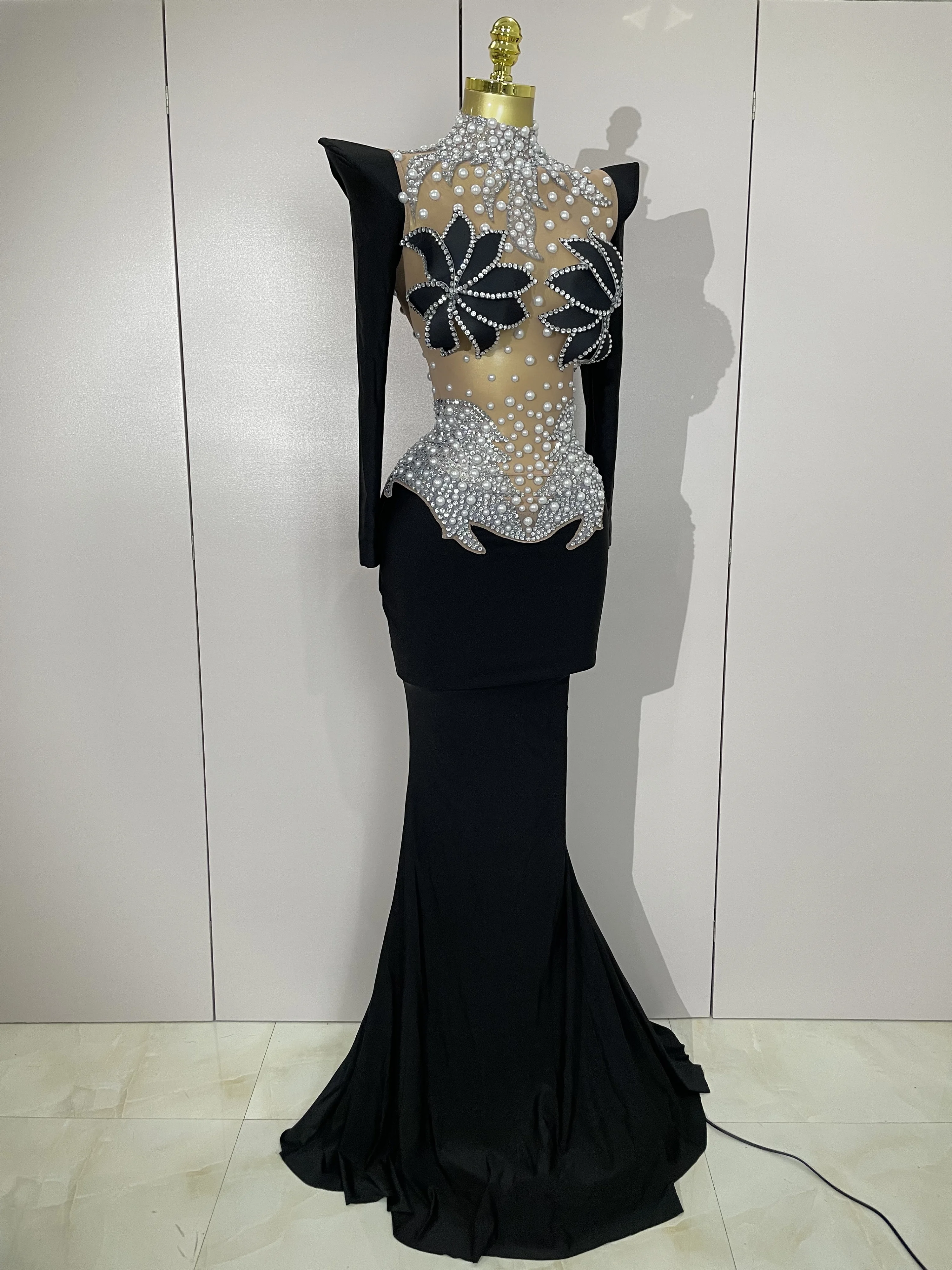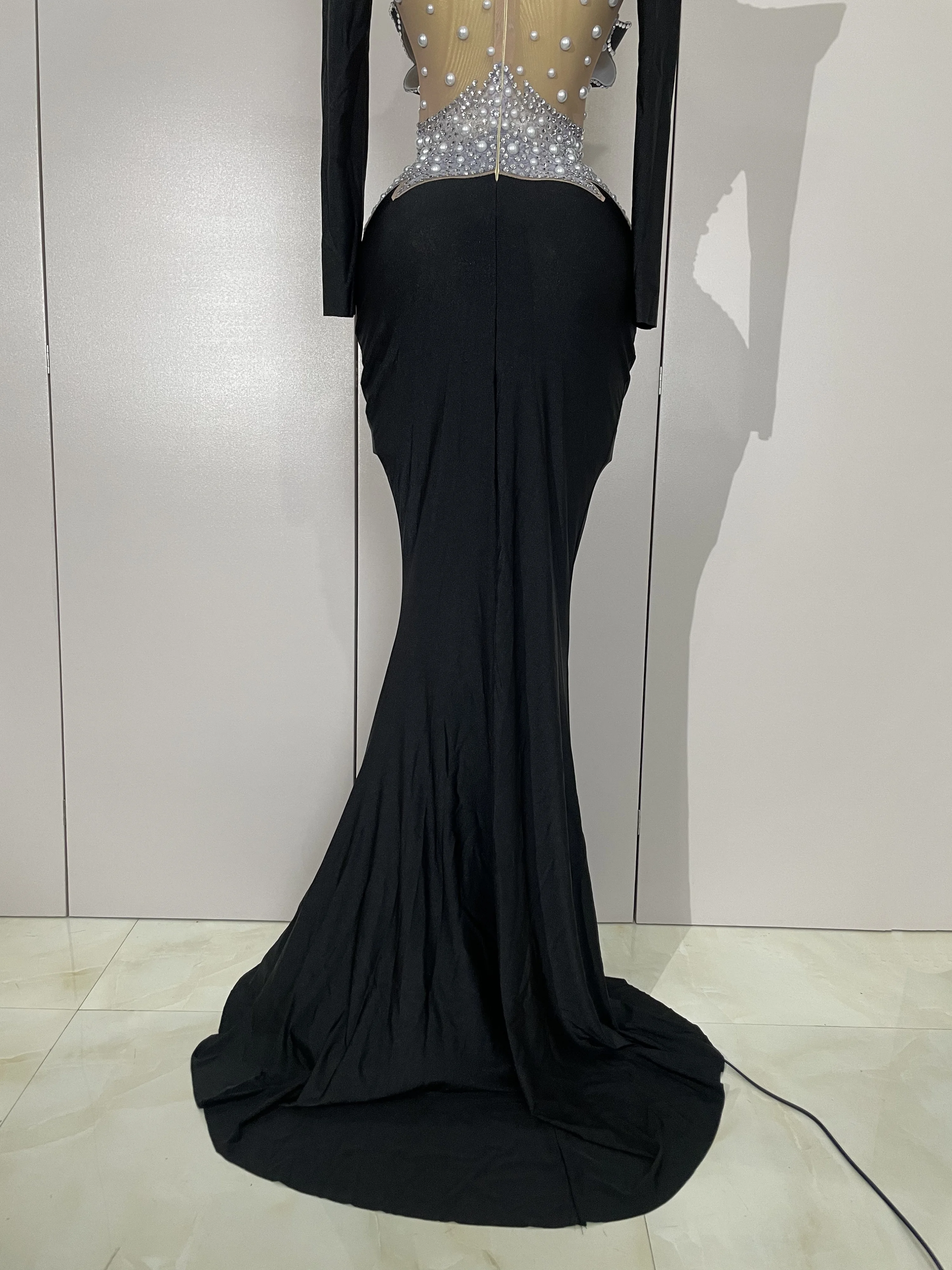 Abito lungo di lusso con diamanti scintillanti, bianco perla, trasparente, in rete, da donna, per matrimoni, feste serali, spettacoli teatrali