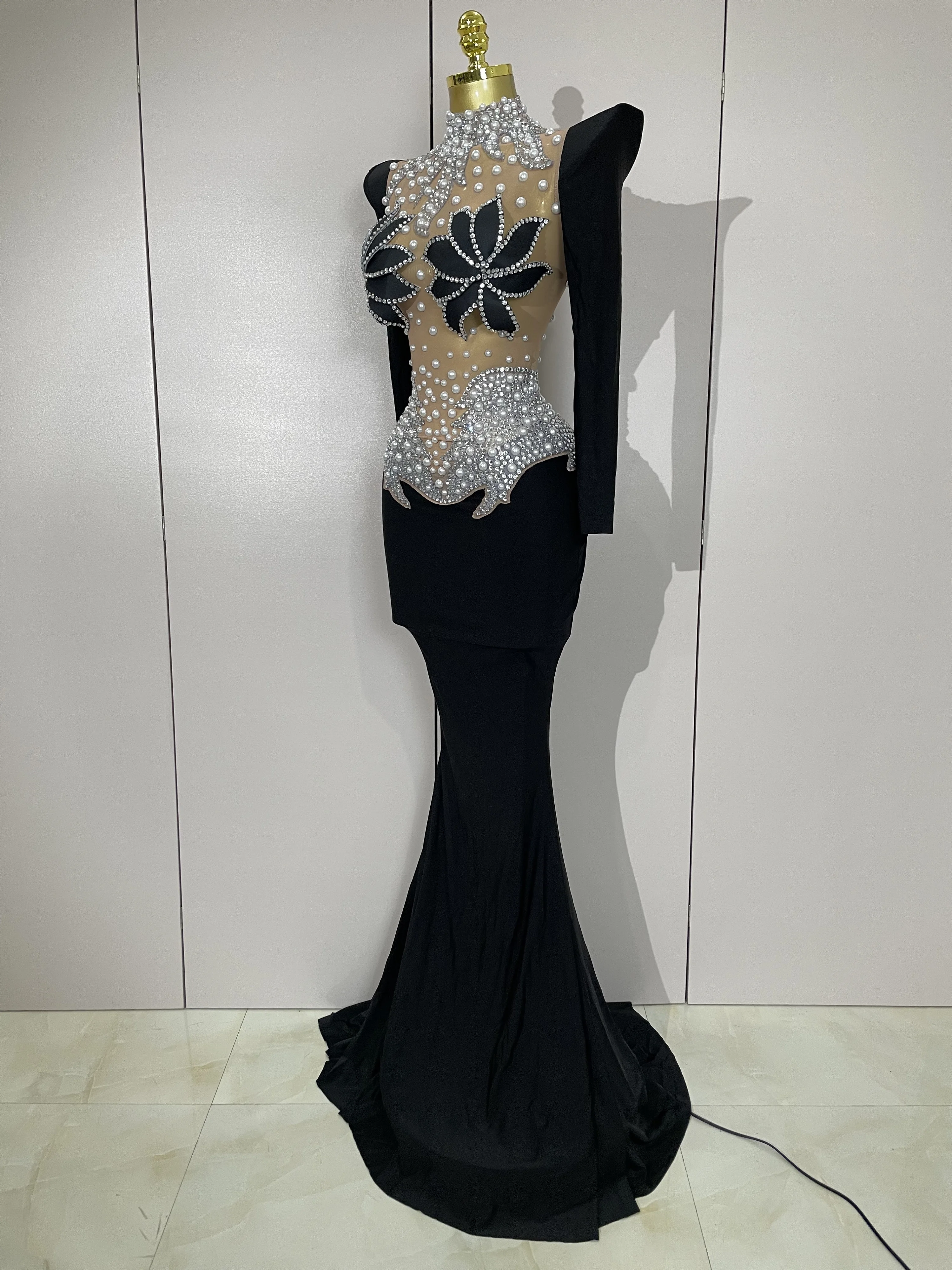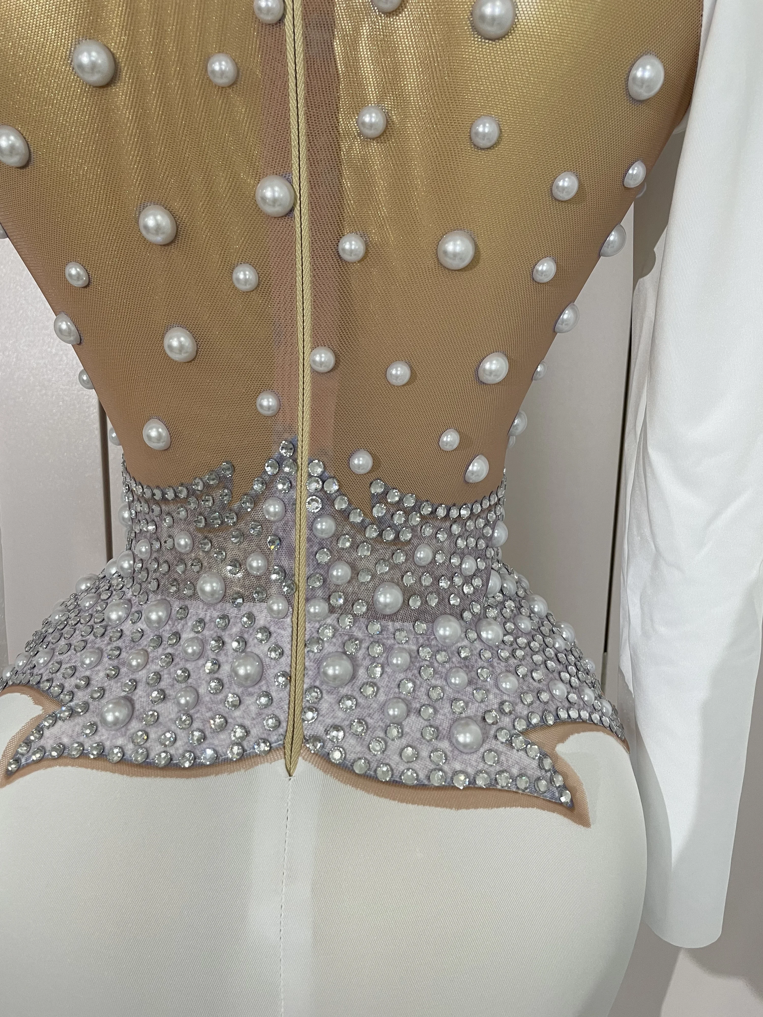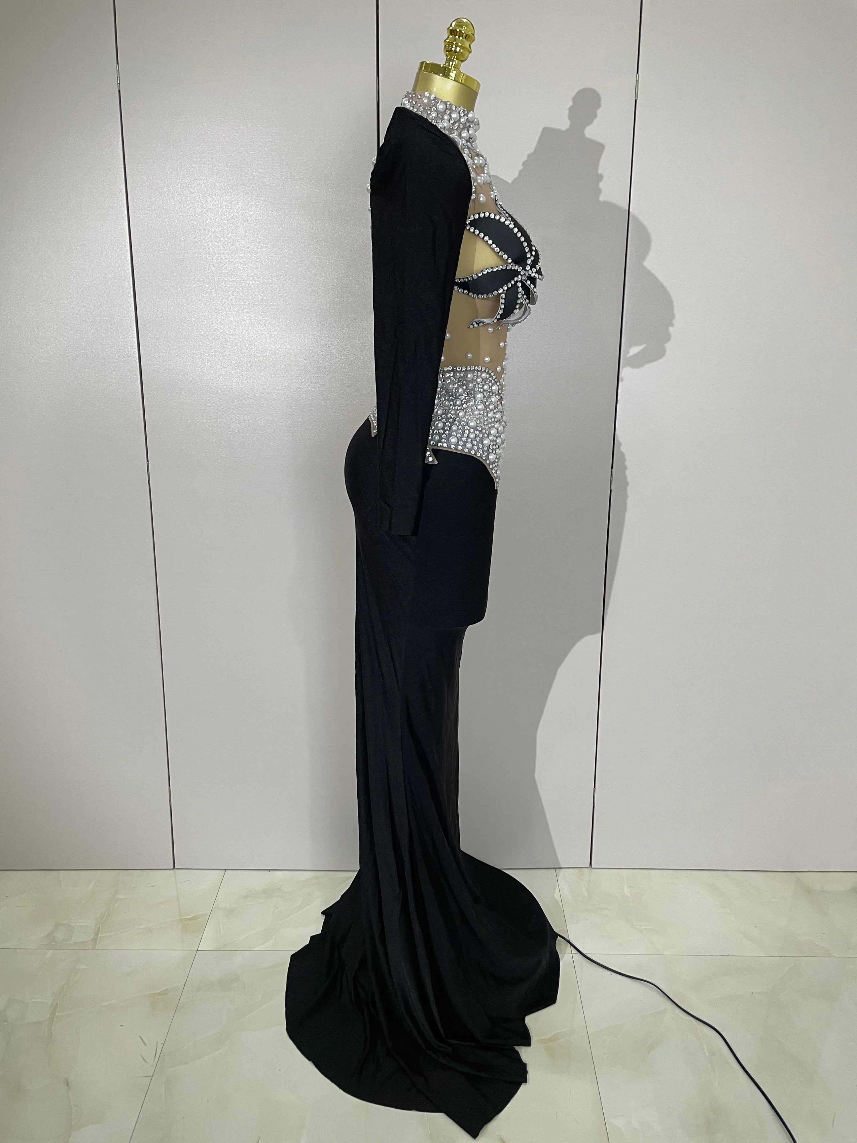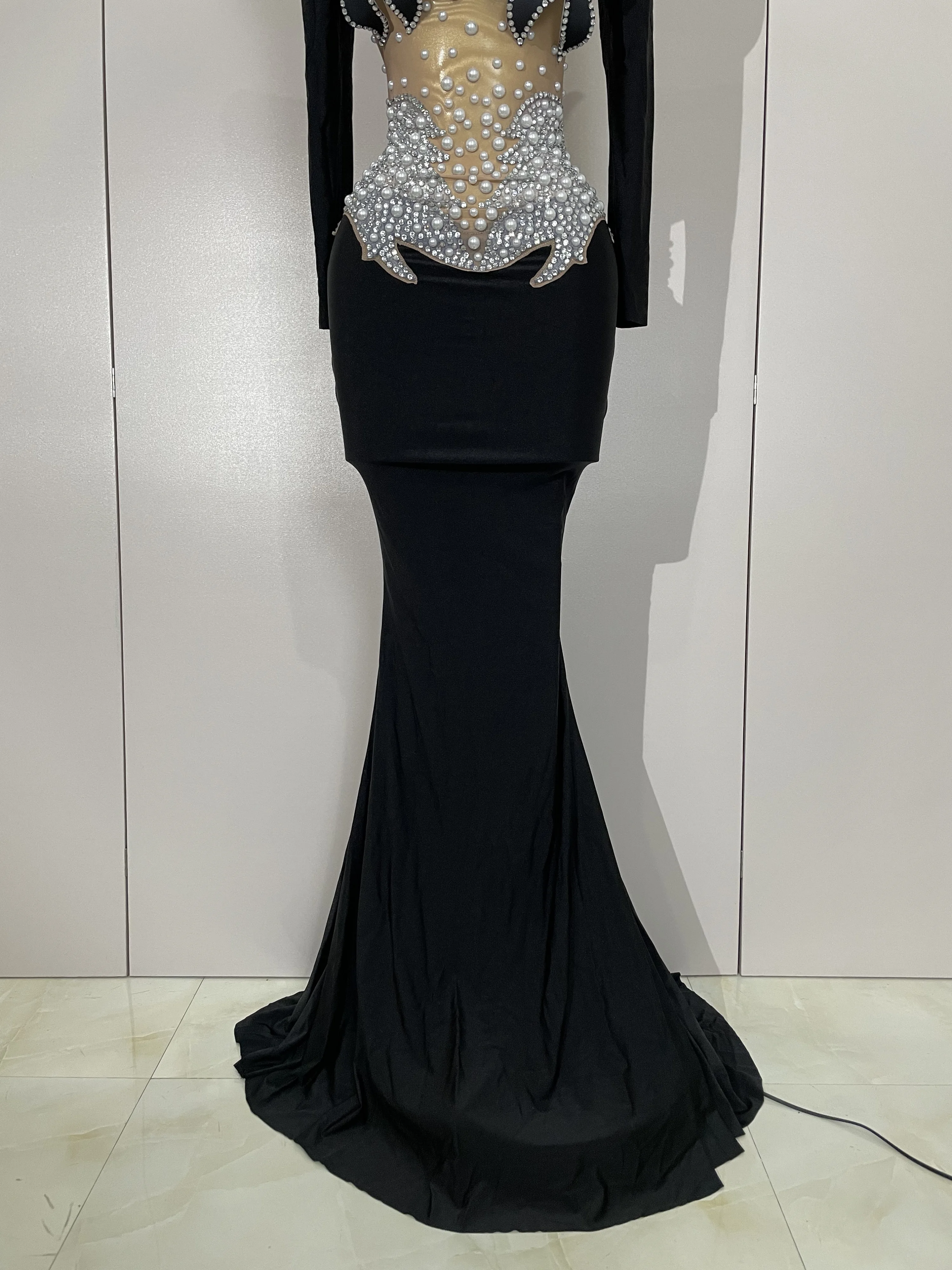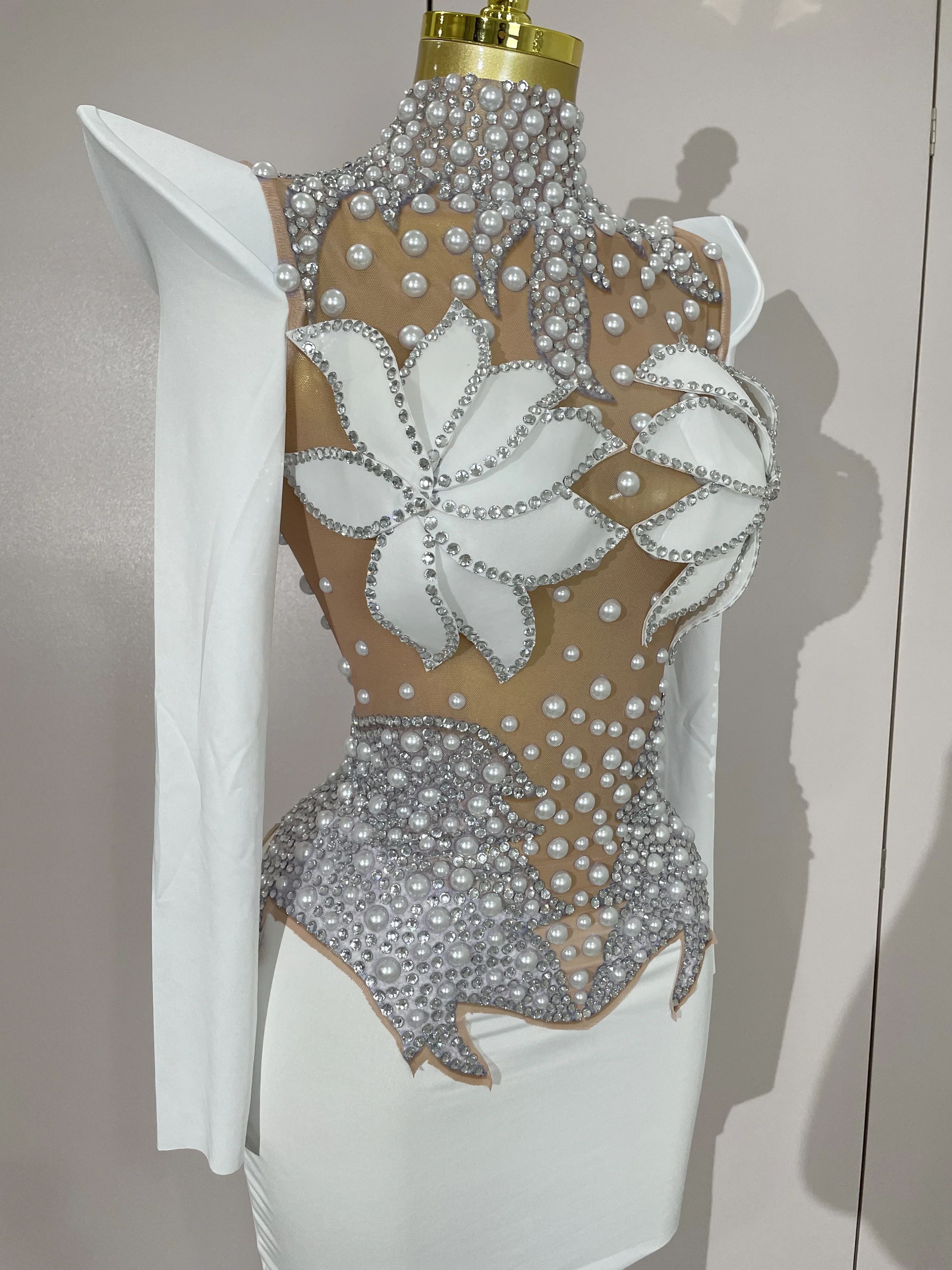 Abito lungo di lusso con diamanti scintillanti, bianco perla, trasparente, in rete, da donna, per matrimoni, feste serali, spettacoli teatrali