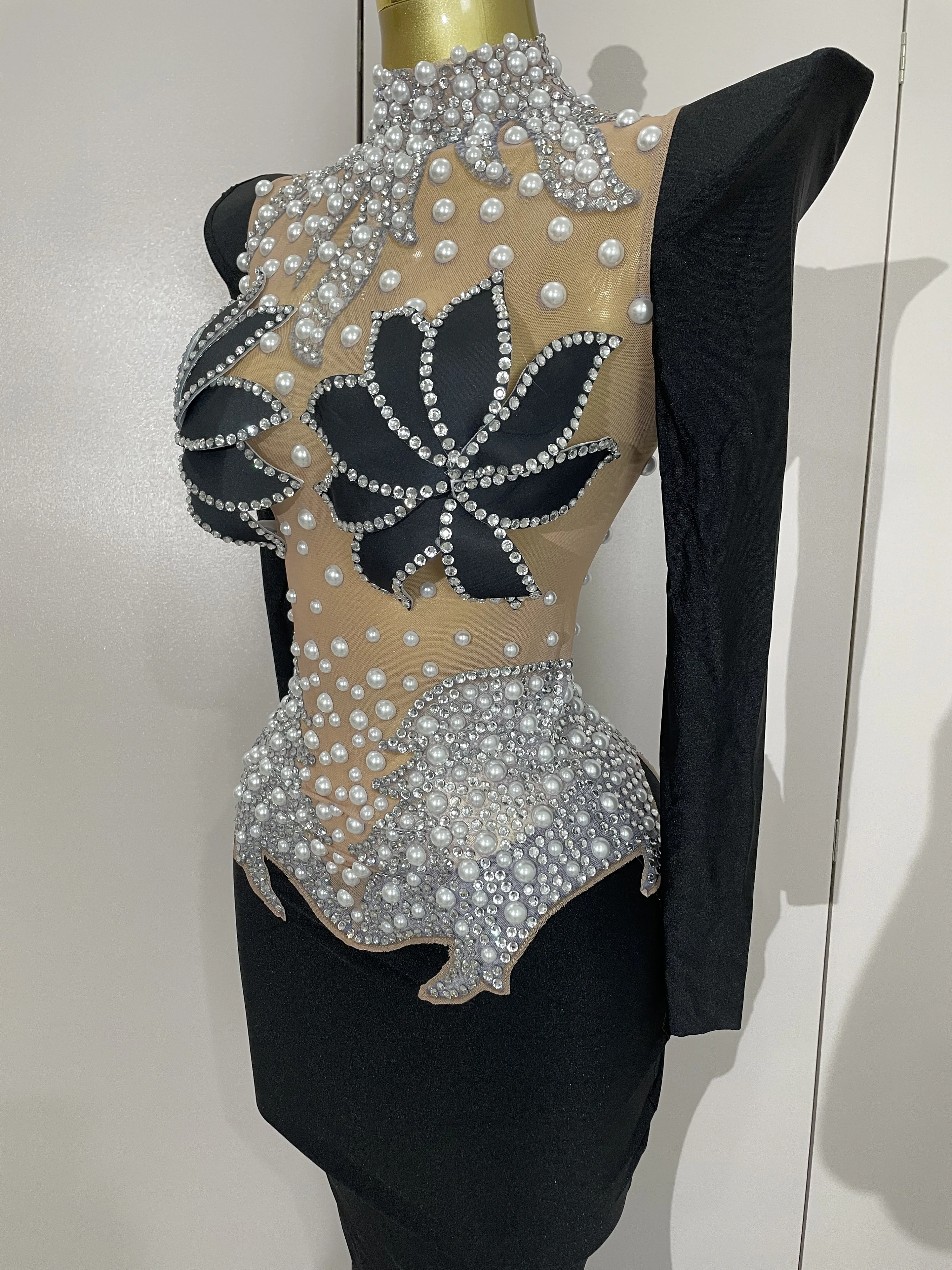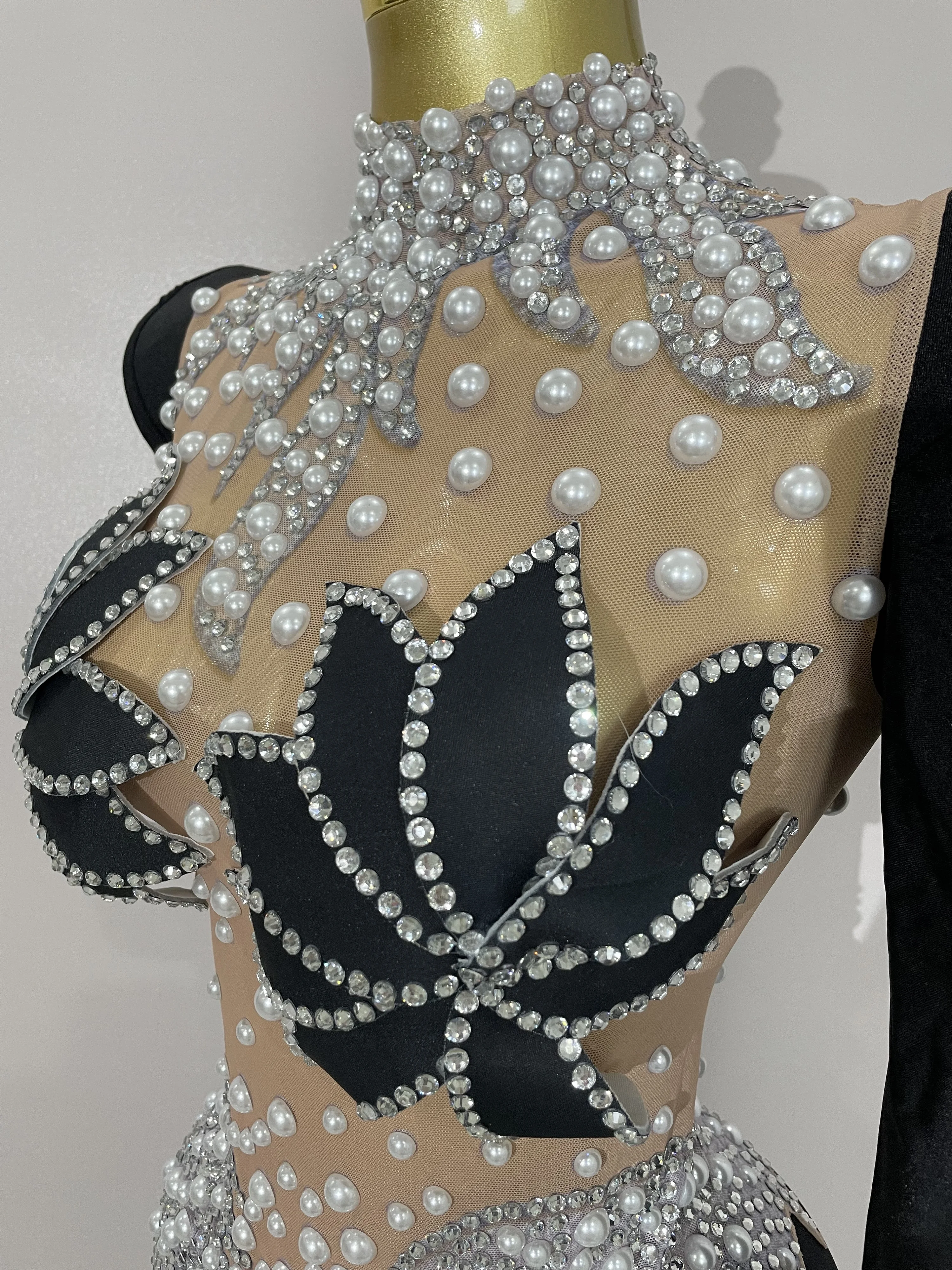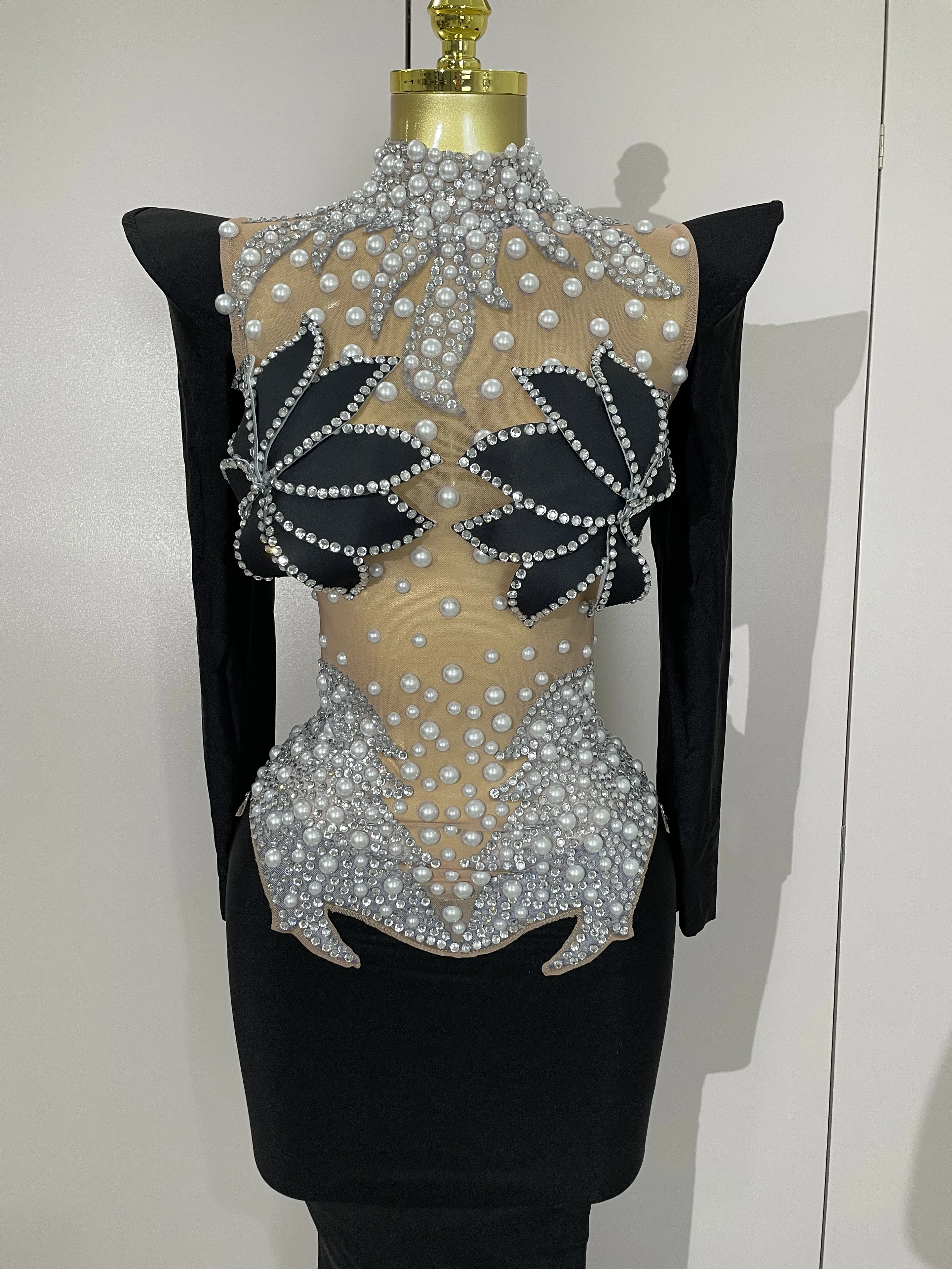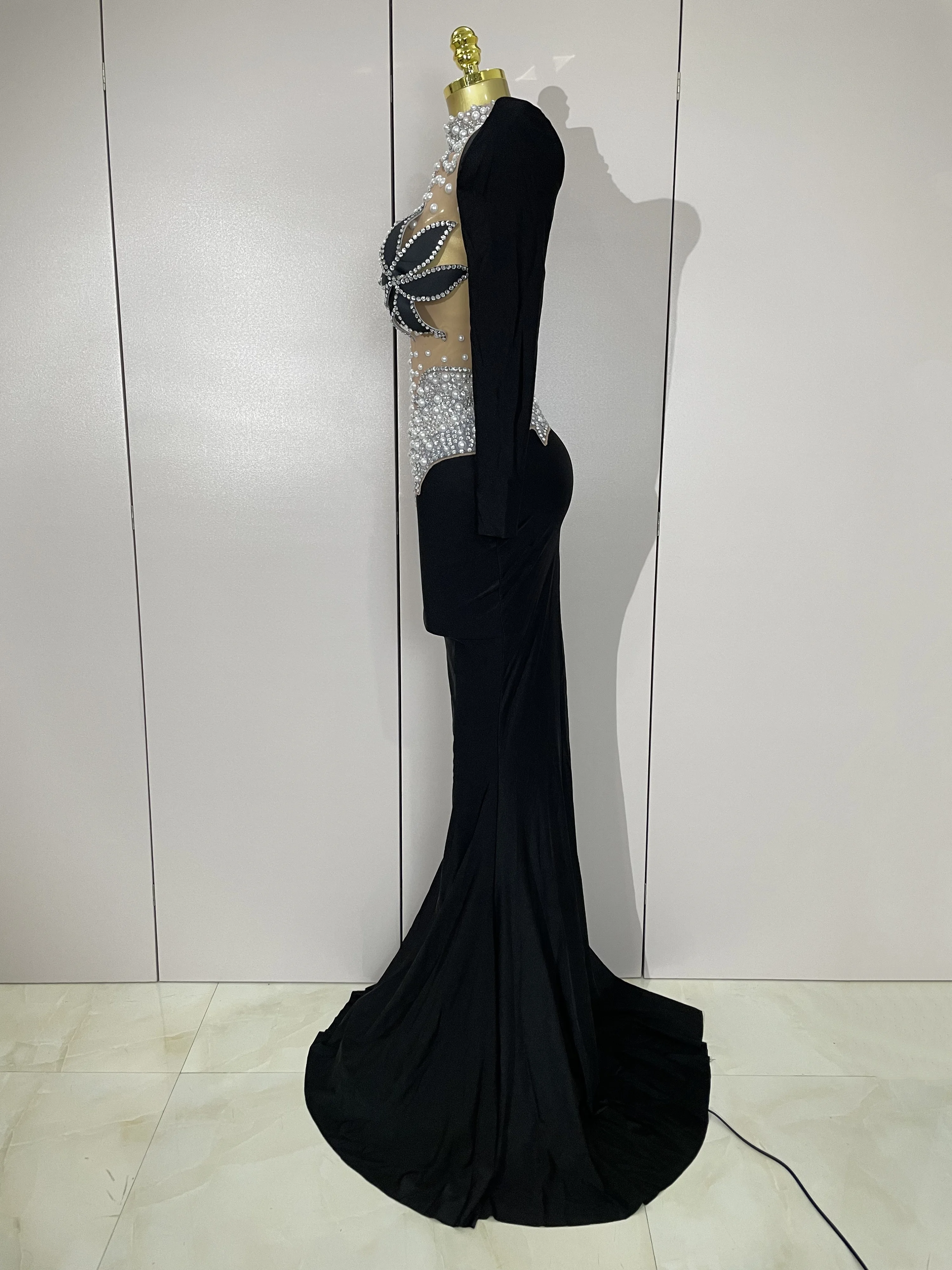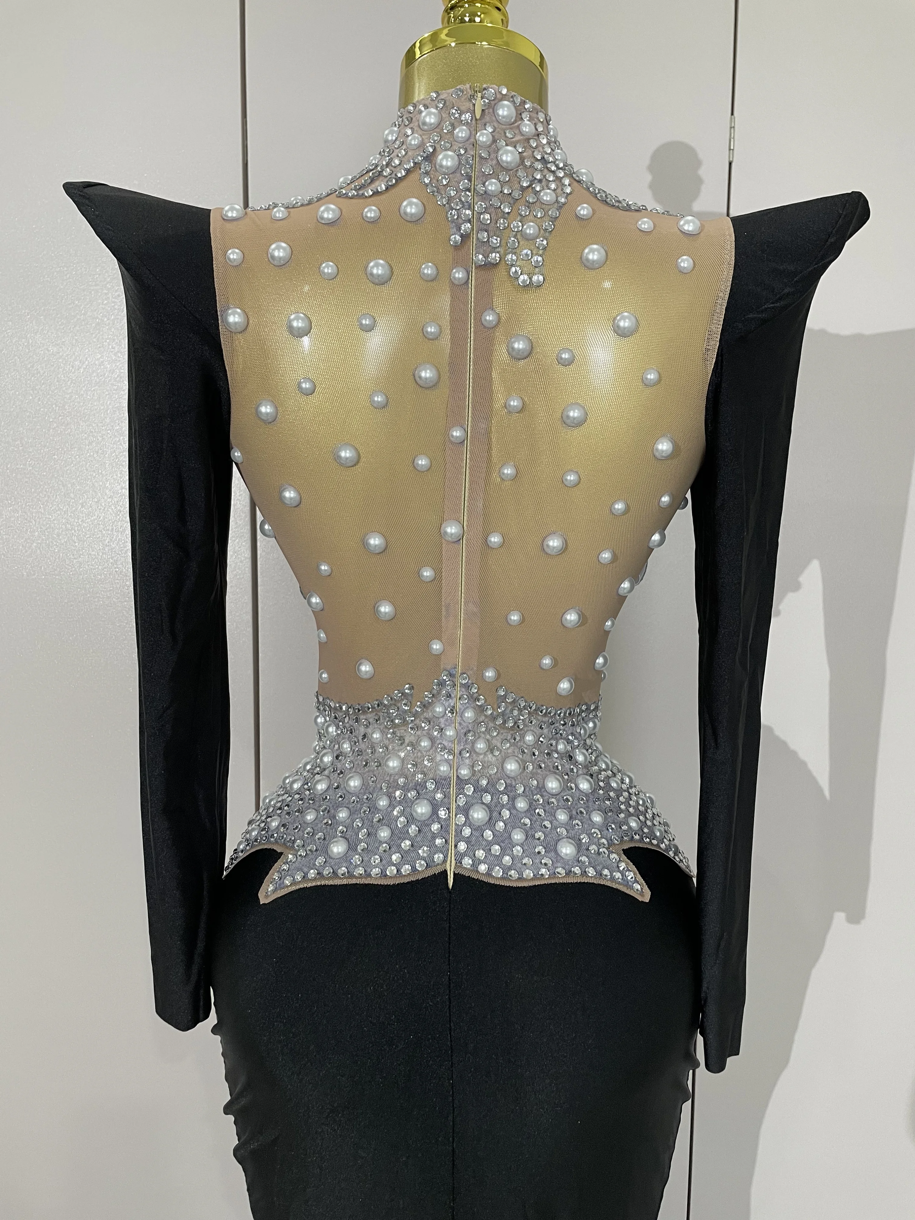 Abito lungo di lusso con diamanti scintillanti, bianco perla, trasparente, in rete, da donna, per matrimoni, feste serali, spettacoli teatrali