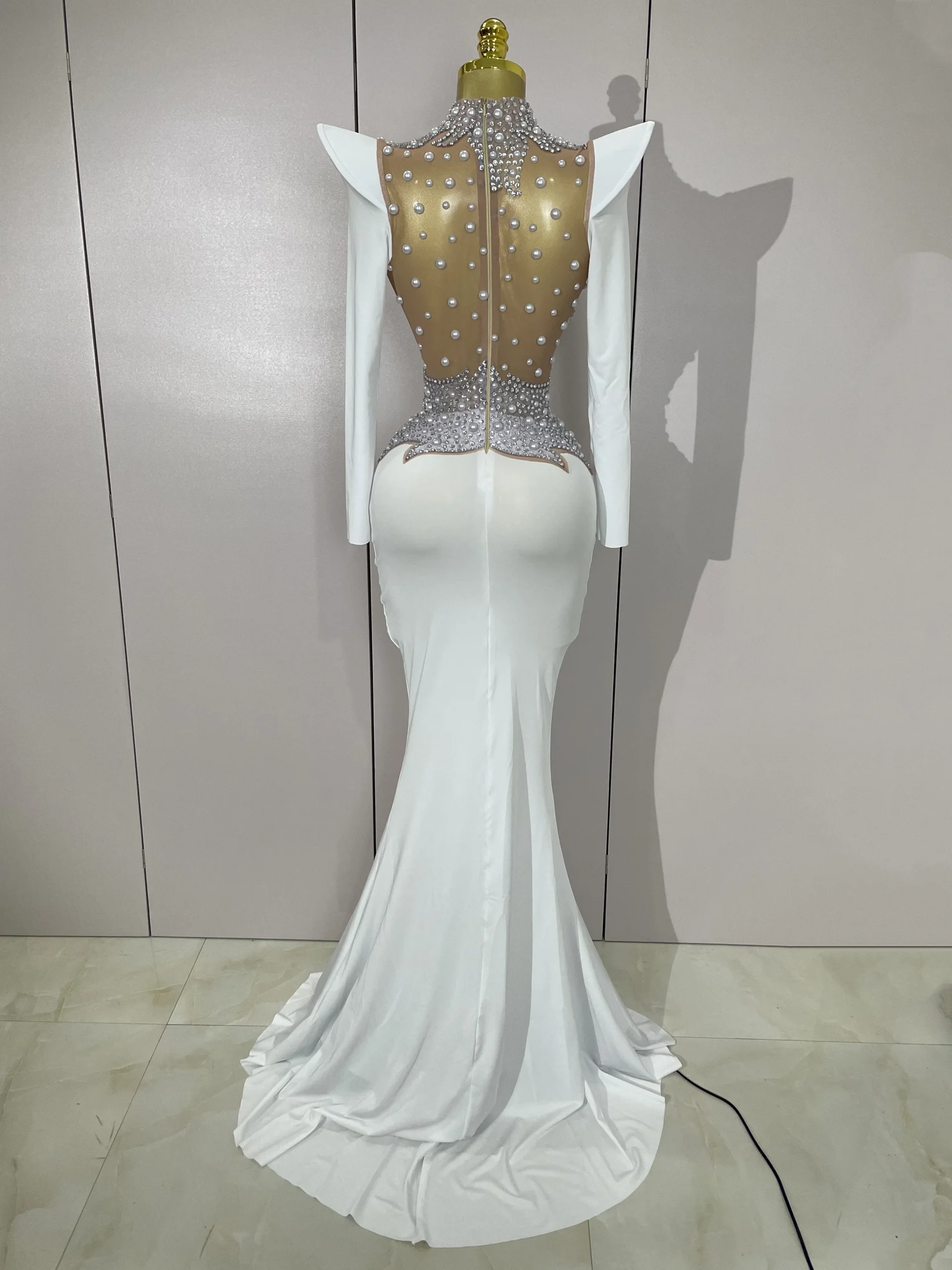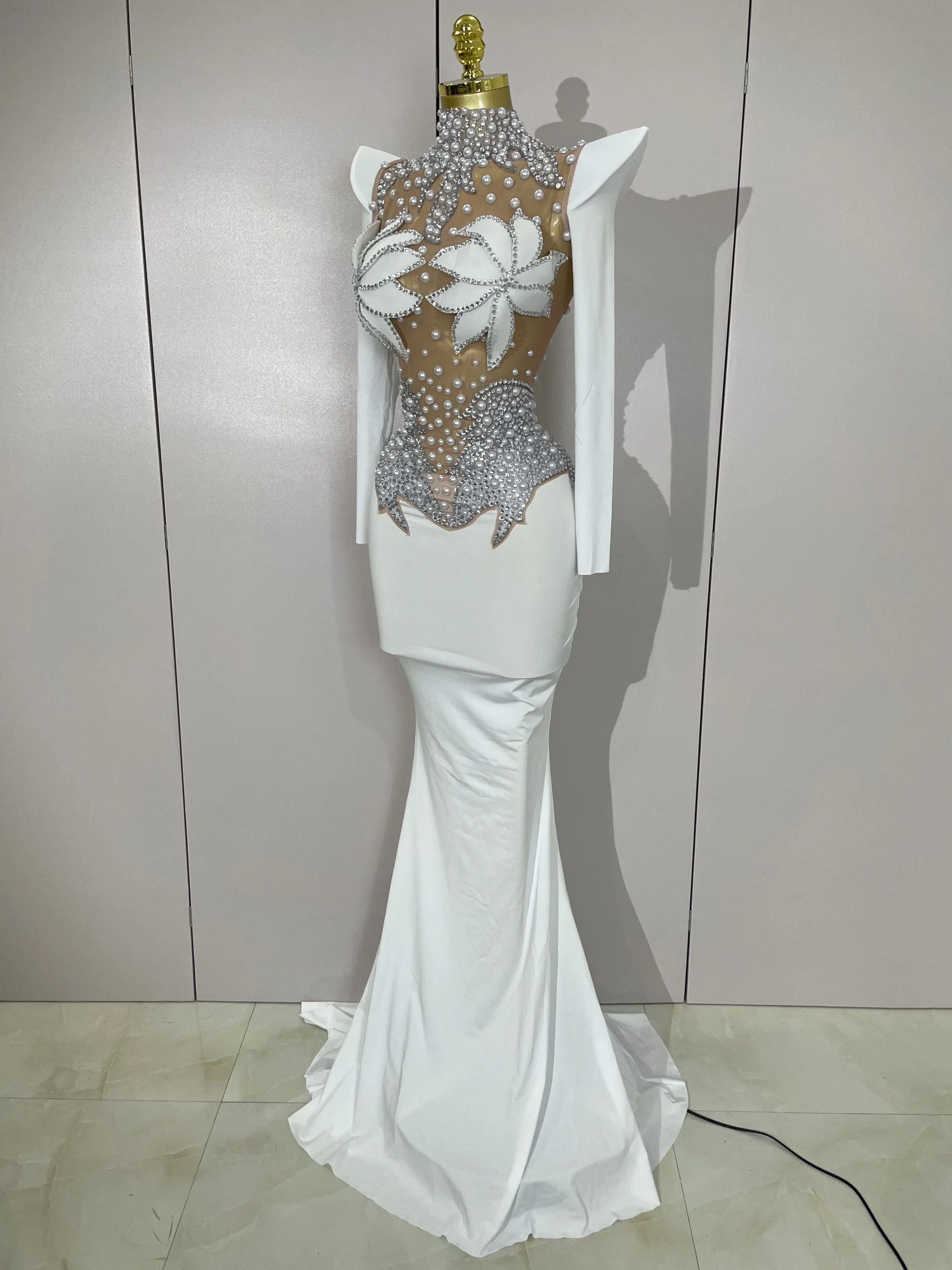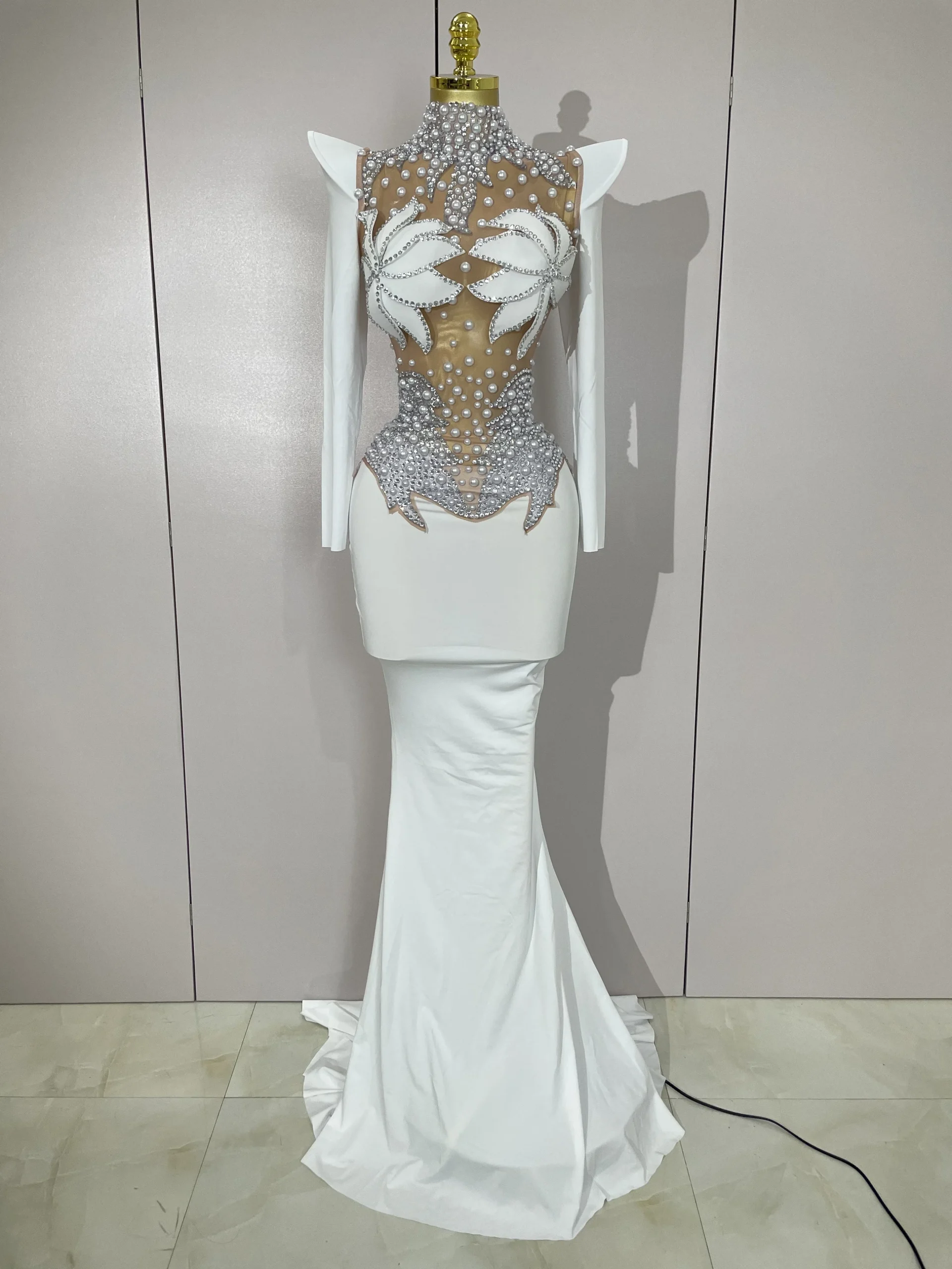 Abito lungo di lusso con diamanti scintillanti, bianco perla, trasparente, in rete, da donna, per matrimoni, feste serali, spettacoli teatrali