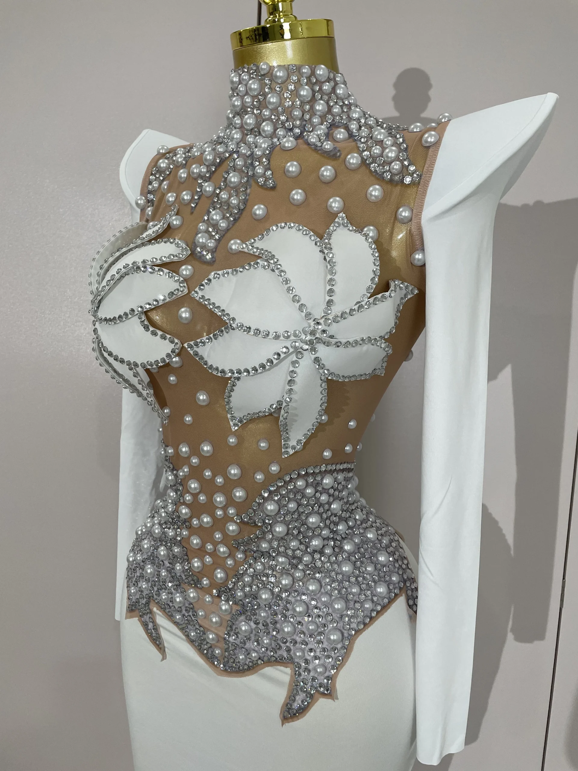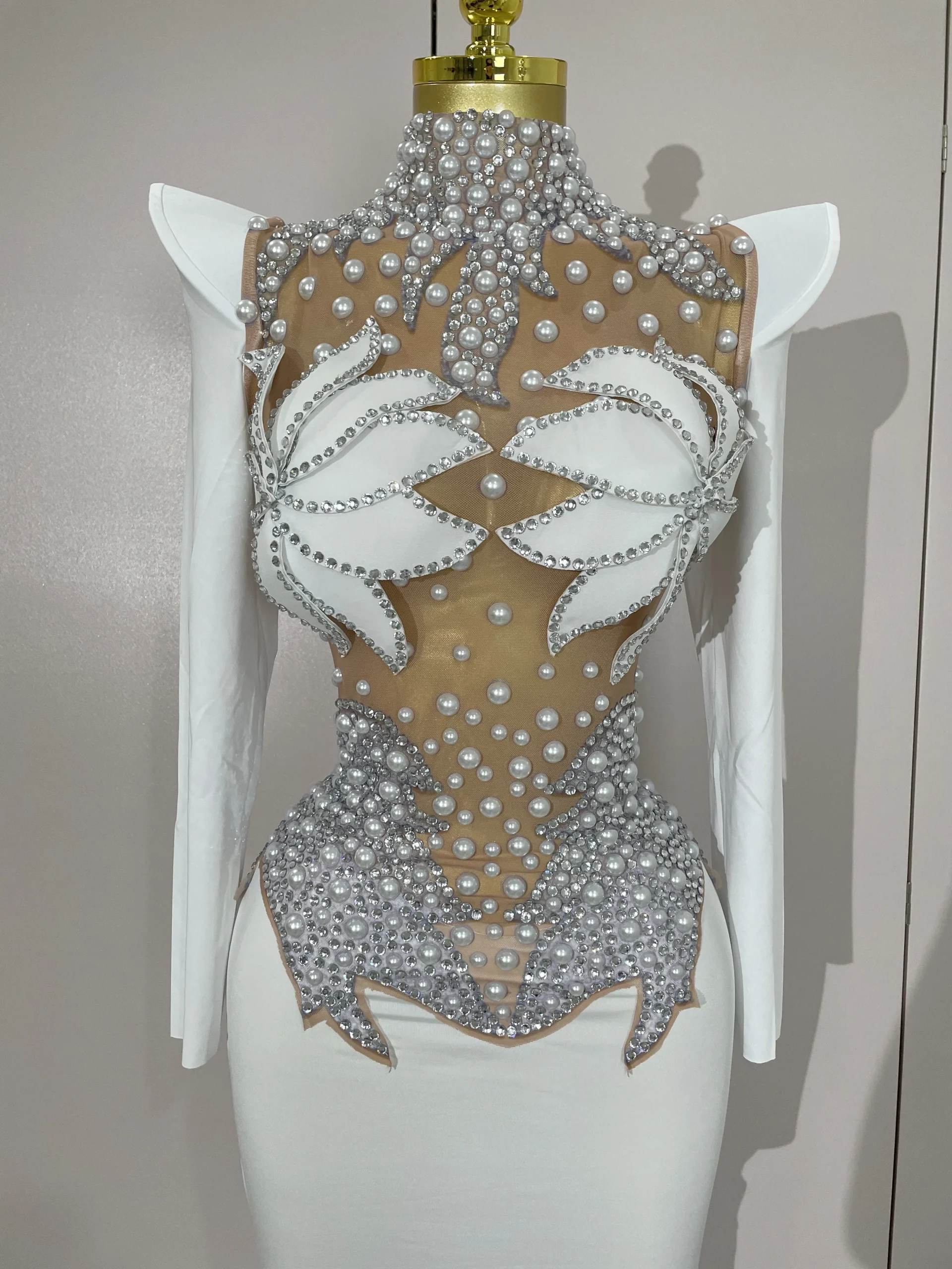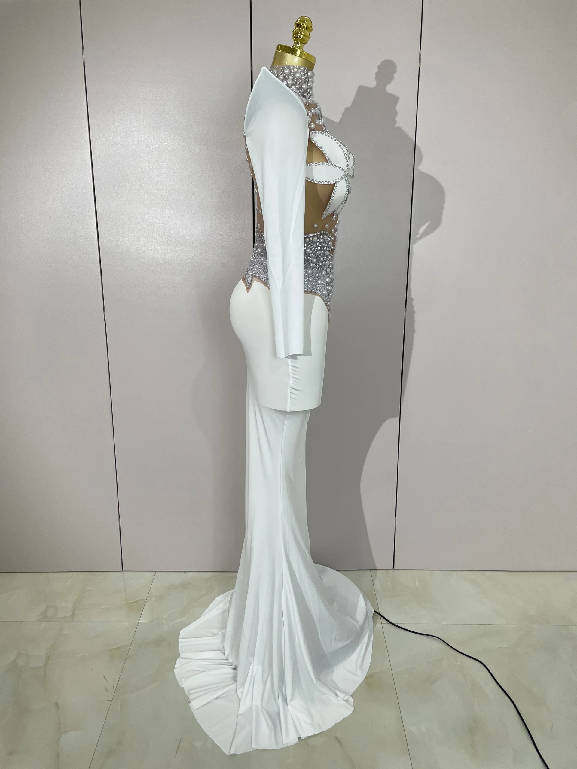 Abito lungo di lusso con diamanti scintillanti, bianco perla, trasparente, in rete, da donna, per matrimoni, feste serali, spettacoli teatrali