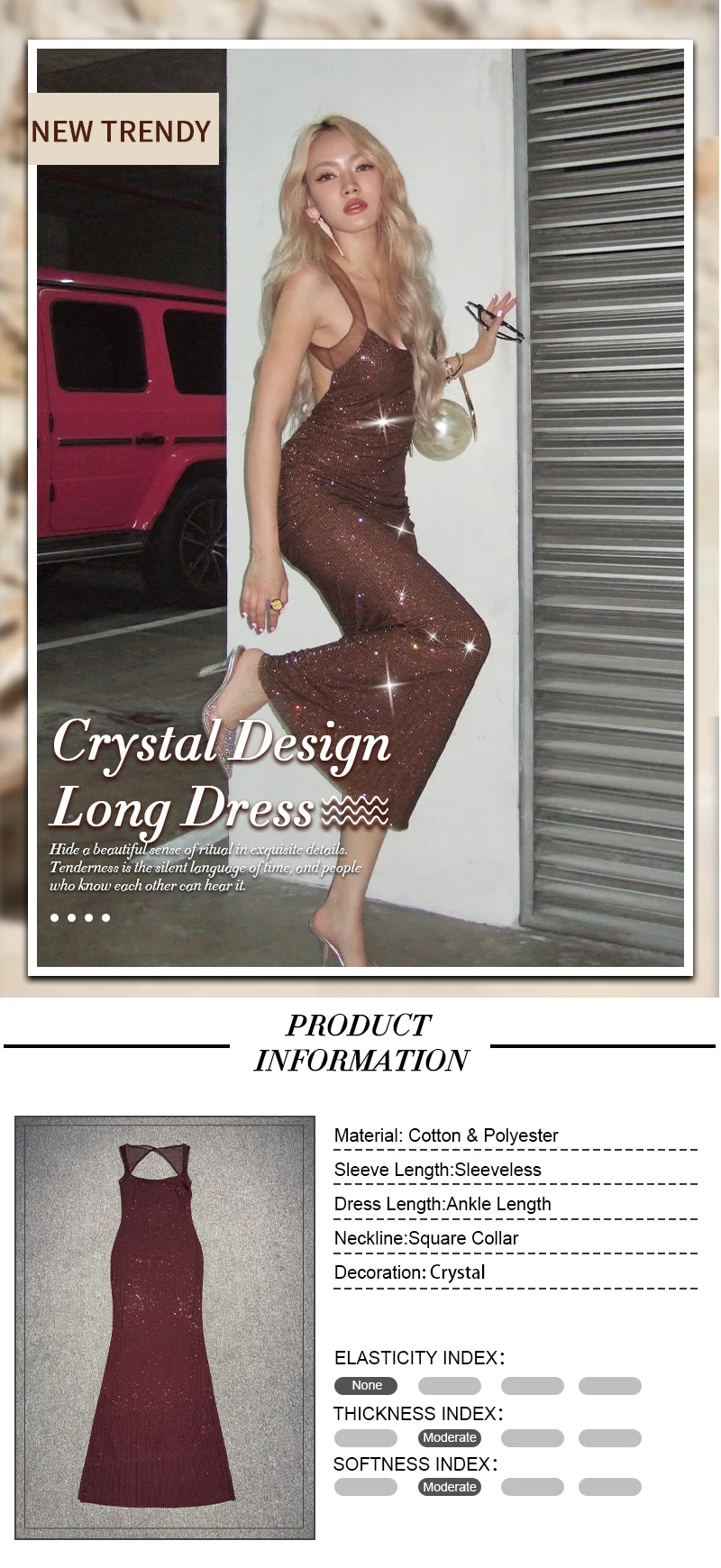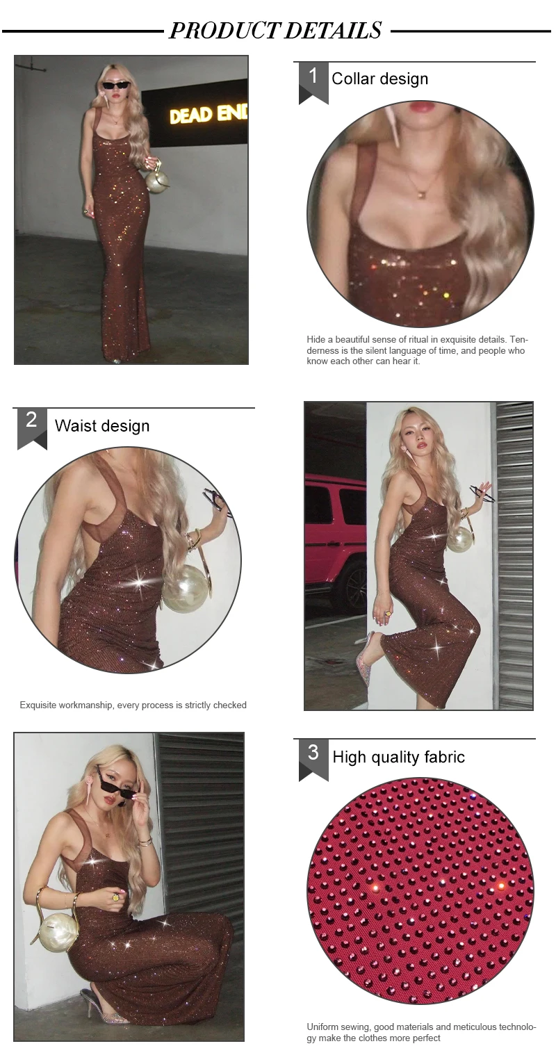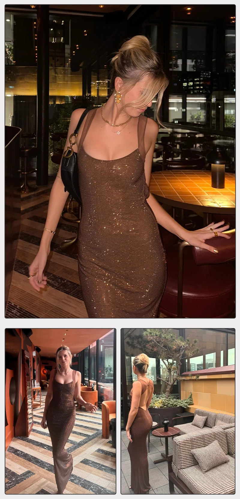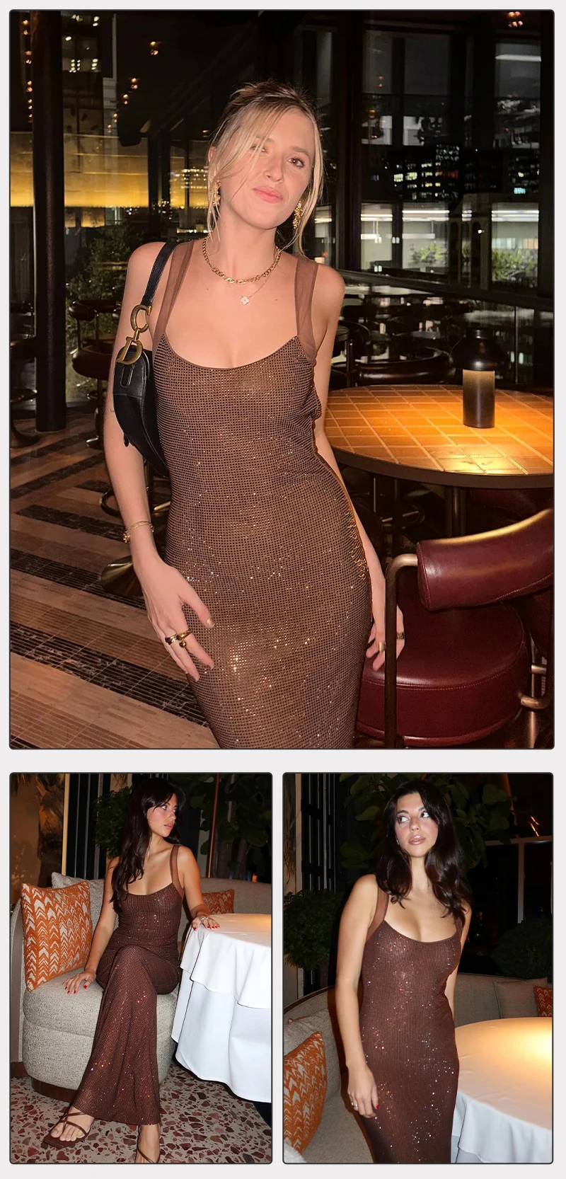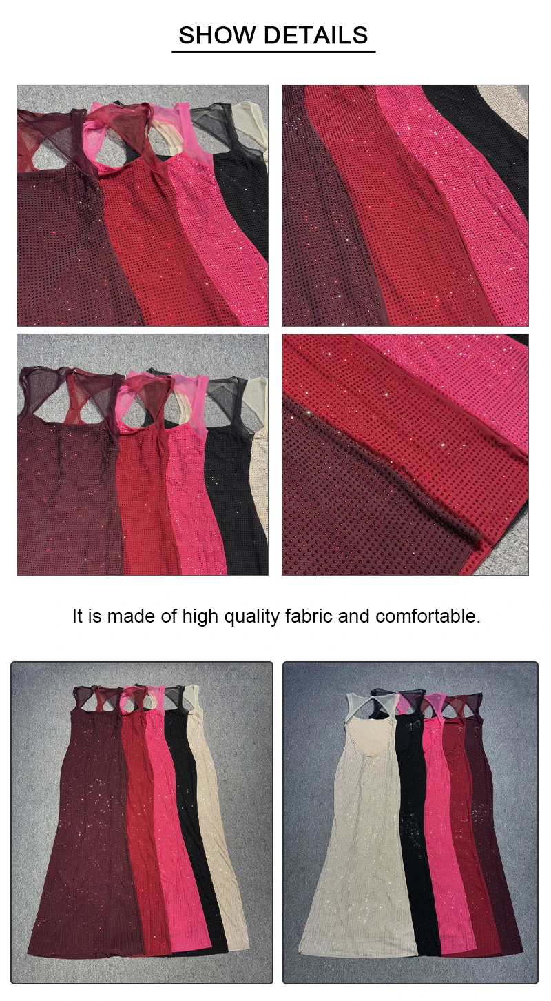 Abito lungo patchwork in rete con strass lucidi senza schienale multicolore per abiti da cocktail da sera aderenti aderenti da donna
