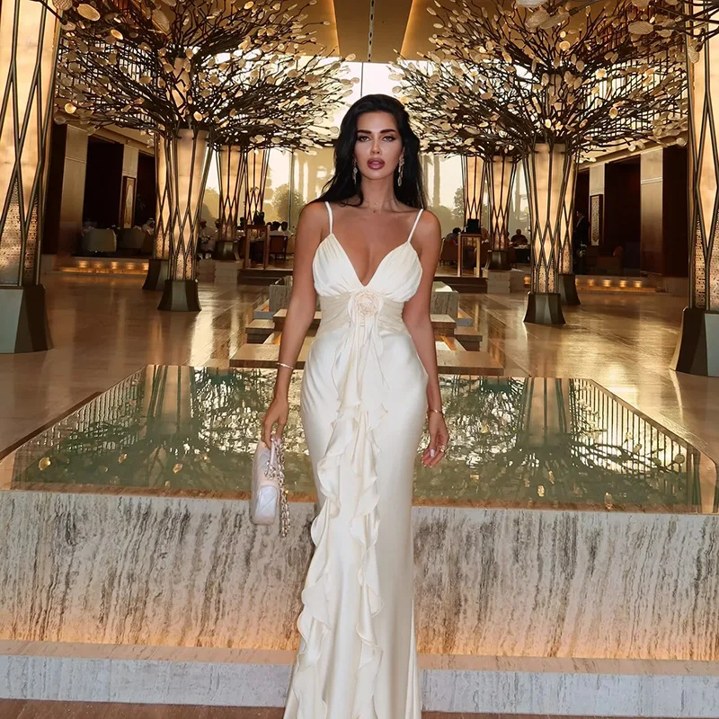 Abito lungo senza maniche senza spalline con volant a fiori eleganti per le donne Abiti slim con scollo a V senza schienale Lady Party Club Outwear Robe Vesti