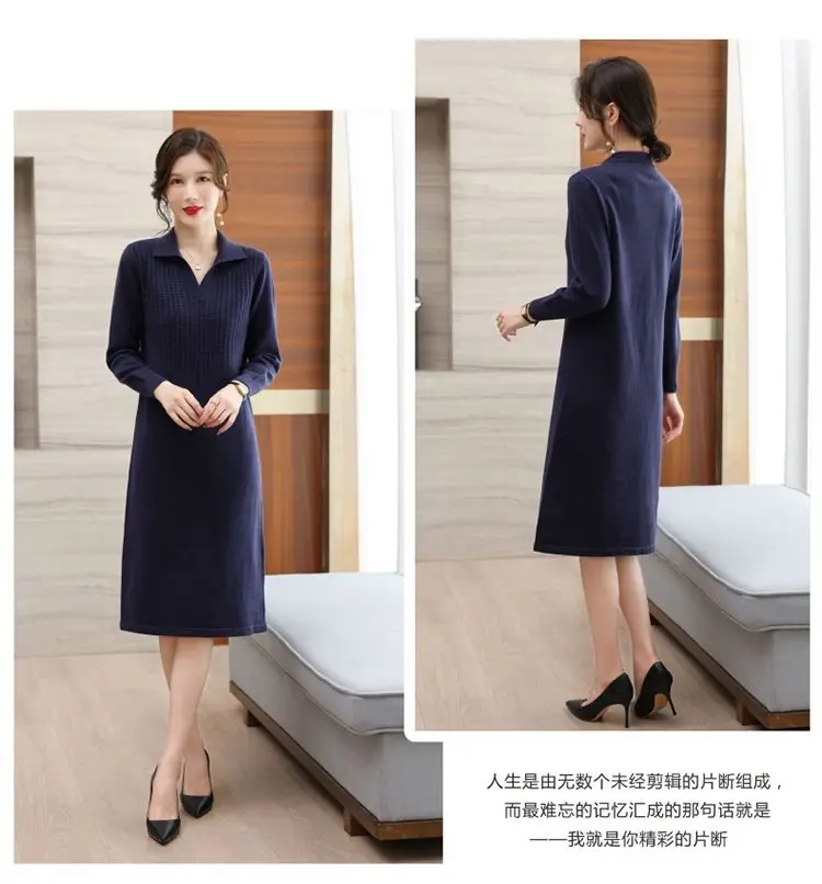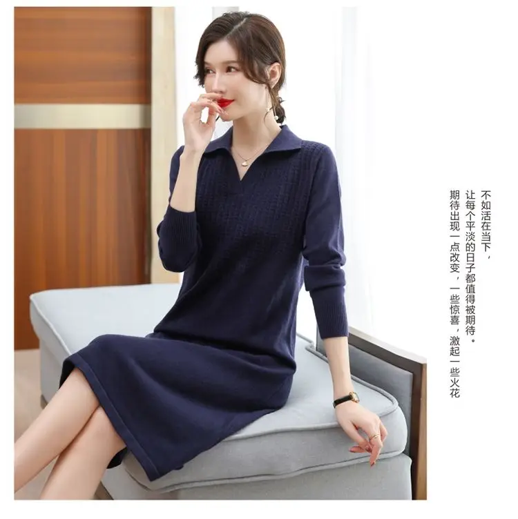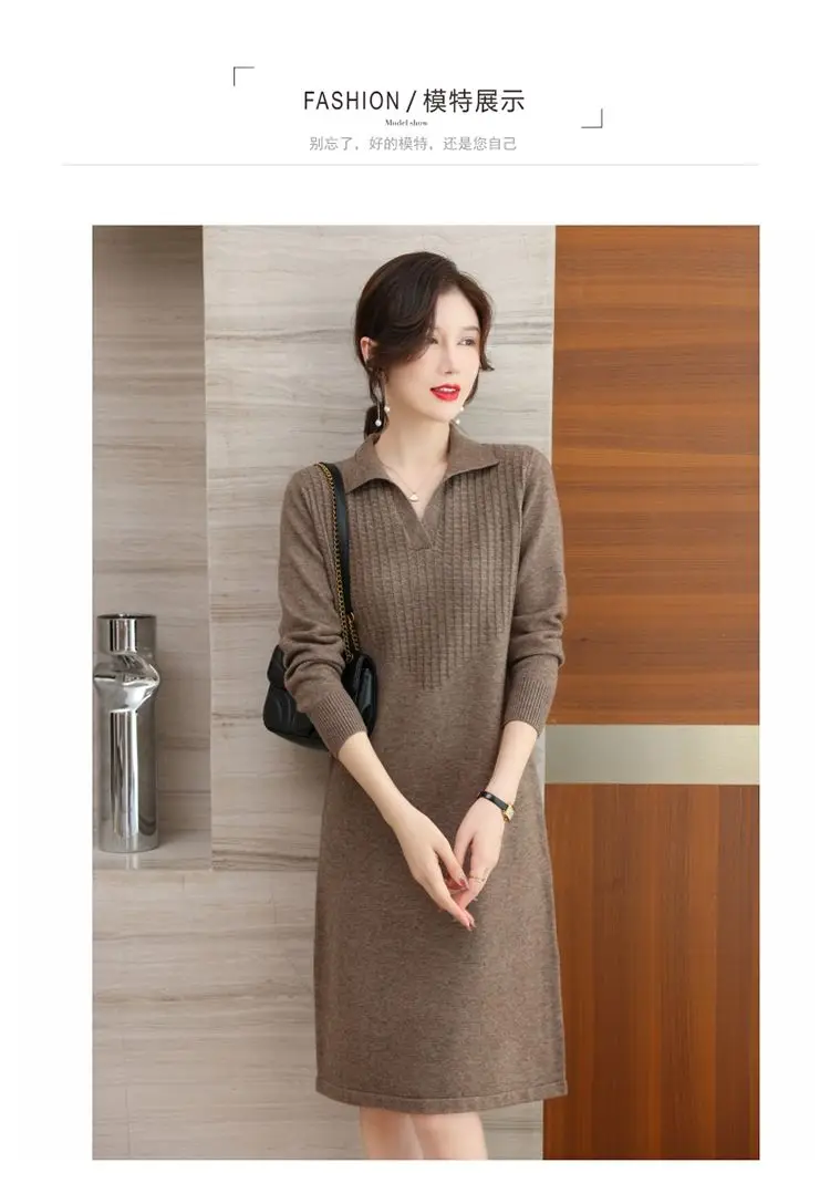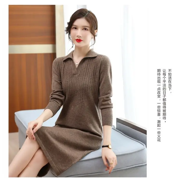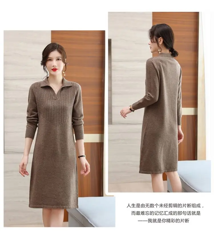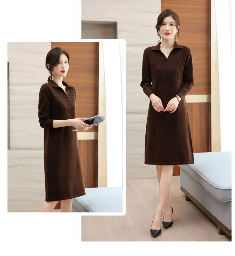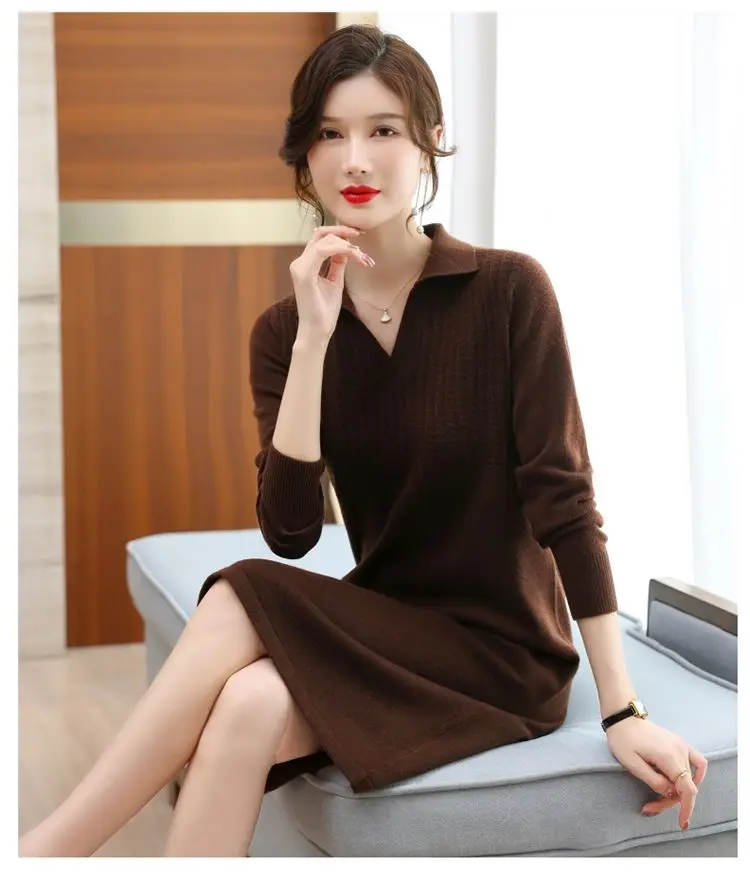 Abito maglione al ginocchio alla moda con risvolto da donna autunnale, temperamento allentato, gonna inferiore in maglia dritta tinta unita